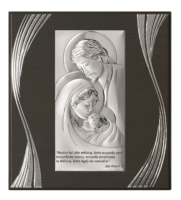 Obrazek przedstawia Świętą rodzinę która przytula małego Jezuska, z cytatem Jana Pawła II "Musicie być silni miłością, która wszystko znosi, wszystkiemu wierzy, wszystko przetrzyma, tą miłością, która nigdy nie zawiedzie." W jego produkcji wykorzystano innowacyjny metal szlachetny, który został pokryty warstwą czystego srebra o próbie 999,95. Drogocenny metal przewyższa jakością materiały pozyskiwane metodami tradycyjnymi. Jest odporniejszy na uszkodzenia mechaniczne i śniedzenie, doskonale odbija światło, co podkreśla szlachetność srebra. Całość została wyprodukowana we Włoszech, zgodnie tradycją obróbki metali szlachetnych. Do obrazka dołączona jest nóżka, aby móc go postawić oraz otwór do powieszenia. Jeżeli życzą sobie Państwo grawer, taką usługę również posiadamy w swojej ofercie. Obrazek z grawerem, życzeniami jak i dedykacją będzie pamiątką z okazji Chrztu, Komunii Św.