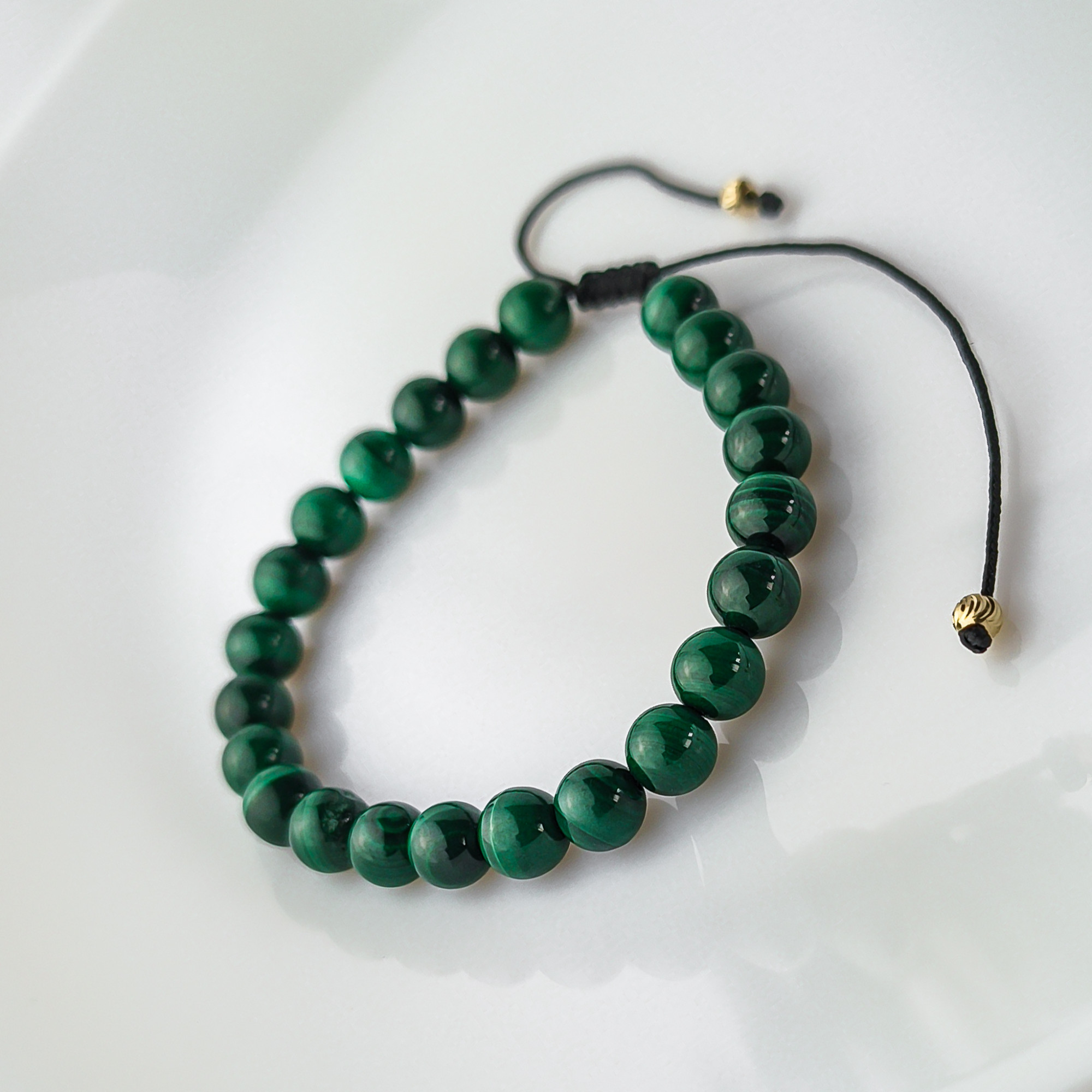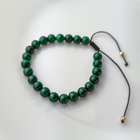 Zanurz się w głębi natury z bransoletką z malachitu. Każdy koralik to miniaturowe dzieło sztuki, w którym łączą się odcienie leśnej zieleni, tworząc hipnotyzujące pasma. Malachit dodaje pewności siebie, a jednocześnie uspokaja, tworząc idealną równowagę między siłą a harmonią.