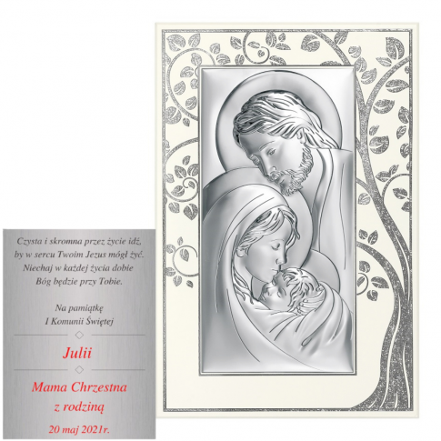 W jego produkcji wykorzystano innowacyjny metal szlachetny, który został pokryty warstwą czystego srebra o próbie 999,95. Drogocenny metal przewyższa jakością materiały pozyskiwane metodami tradycyjnymi. Jest odporniejszy na uszkodzenia mechaniczne i śniedzenie, doskonale odbija światło, co podkreśla szlachetność srebra. Całość została wyprodukowana we Włoszech, zgodnie tradycją obróbki metali szlachetnych. Do obrazka dołączona jest nóżka, aby móc go postawić oraz otwór do powieszenia. Będzie wspaniałym prezentem na różne okazje ( Ślub, Rocznicę Ślubu itp.)