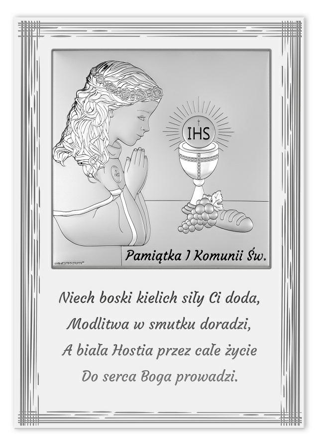 Obrazek typowo komunijny, przedstawiający modlącą się dziewczynkę, obok hostia. Umieszczony na białym drewnie. Na dole napis "Pamiątka I Komunii Świętej" wraz z modlitwą. W jego produkcji wykorzystano innowacyjny metal szlachetny, który został pokryty warstwą czystego srebra o próbie 999,95. Drogocenny metal przewyższa jakością materiały pozyskiwane metodami tradycyjnymi. Jest odporniejszy na uszkodzenia mechaniczne i śniedzenie, doskonale odbija światło co podkreśla szlachetność srebra. Całość została wyprodukowana we Włoszech, zgodnie z tradycją obróbki metali szlachetnych. Do obrazka dołączona jest nóżka, aby móc go postawić oraz otwór do powieszenia. Będzie wspaniałym prezentem oraz pamiątką Pierwszej Komunii Świętej. Dodatkowo mamy możliwość wykonania graweru na blaszce i umieszczeniu jej na rewersie obrazka. Zmiany w dedykacji dotyczą tekstu zaznaczonego kolorem czerwonym. W polu "tekst graweru" lub "wiadomości do sprzedającego" należy umieścić słowa zgodne z twoją dedykacją. Skorzystaj z naszych wzorów lub stwórz własny oryginalny tekst graweru - usługa GRATIS.