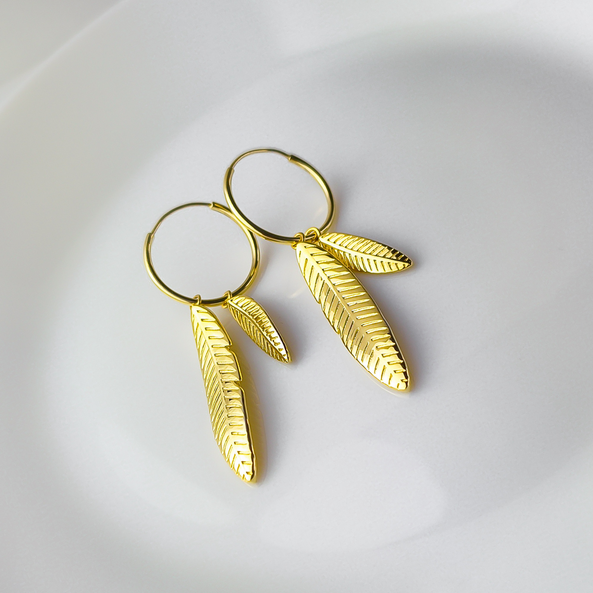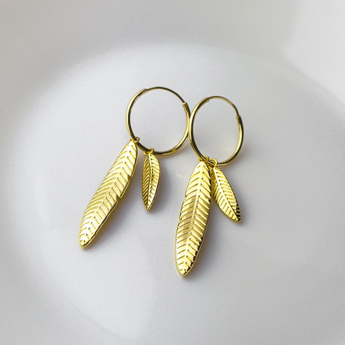 Niezwykle stylowe pozłacane kolczyki koła o średnicy ok. 2 cm z dwoma piórkami. Całość wykonana została ze srebra próby 925. Klasyczna elegancja w połączeniu z innymi dodatkami stworzy niepowtarzalny komplet nadający się do każdej stylizacji. Z pewnością dodadzą blasku i wyjątkowego charakteru każdej damskiej stylizacji. Świetnie nadają się do noszenia na co dzień jak i na wieczorne wyjścia. Biżuteria zapakowana w ozdobne pudełeczko będzie wspaniałym prezentem.