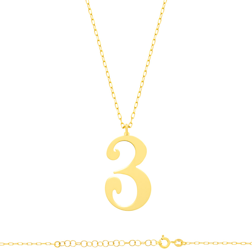 Stylowy pozłacany naszyjnik próby 925, z piękną zawieszką w kształcie cyfry "3", umieszczoną na łańcuszku o splocie ankie. Długość łańcuszka jest regulowana od 45 cm do 50 cm. Sprawdzi się jako gustowny dodatek, do każdej damskiej stylizacji. Biżuteria zapakowana w ozdobne pudełeczko będzie wspaniałym prezentem.