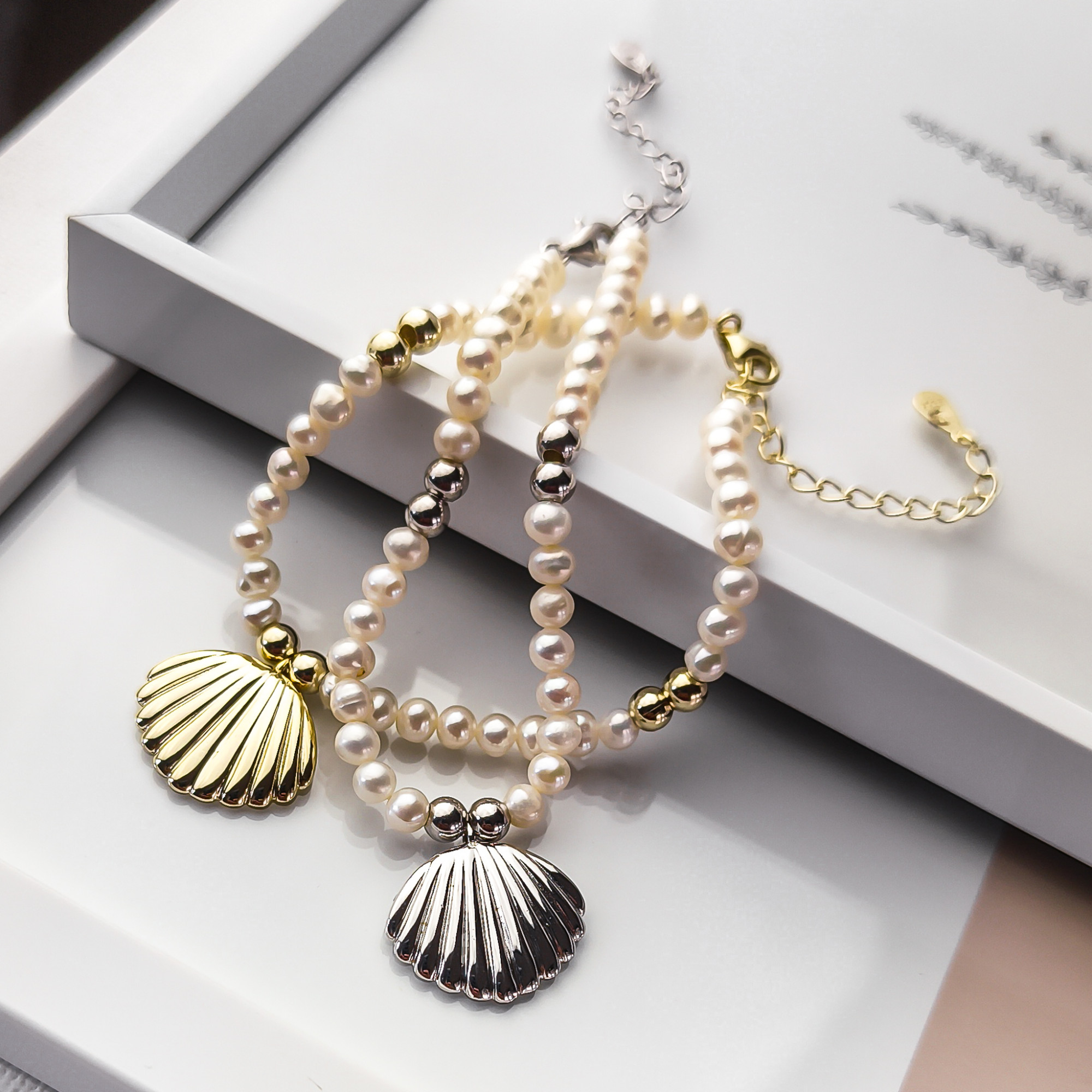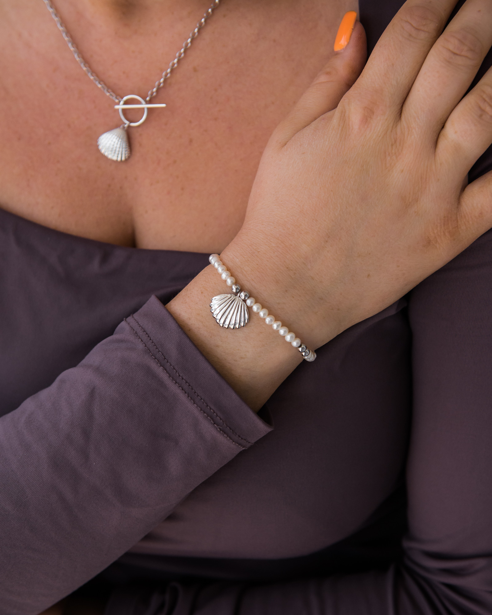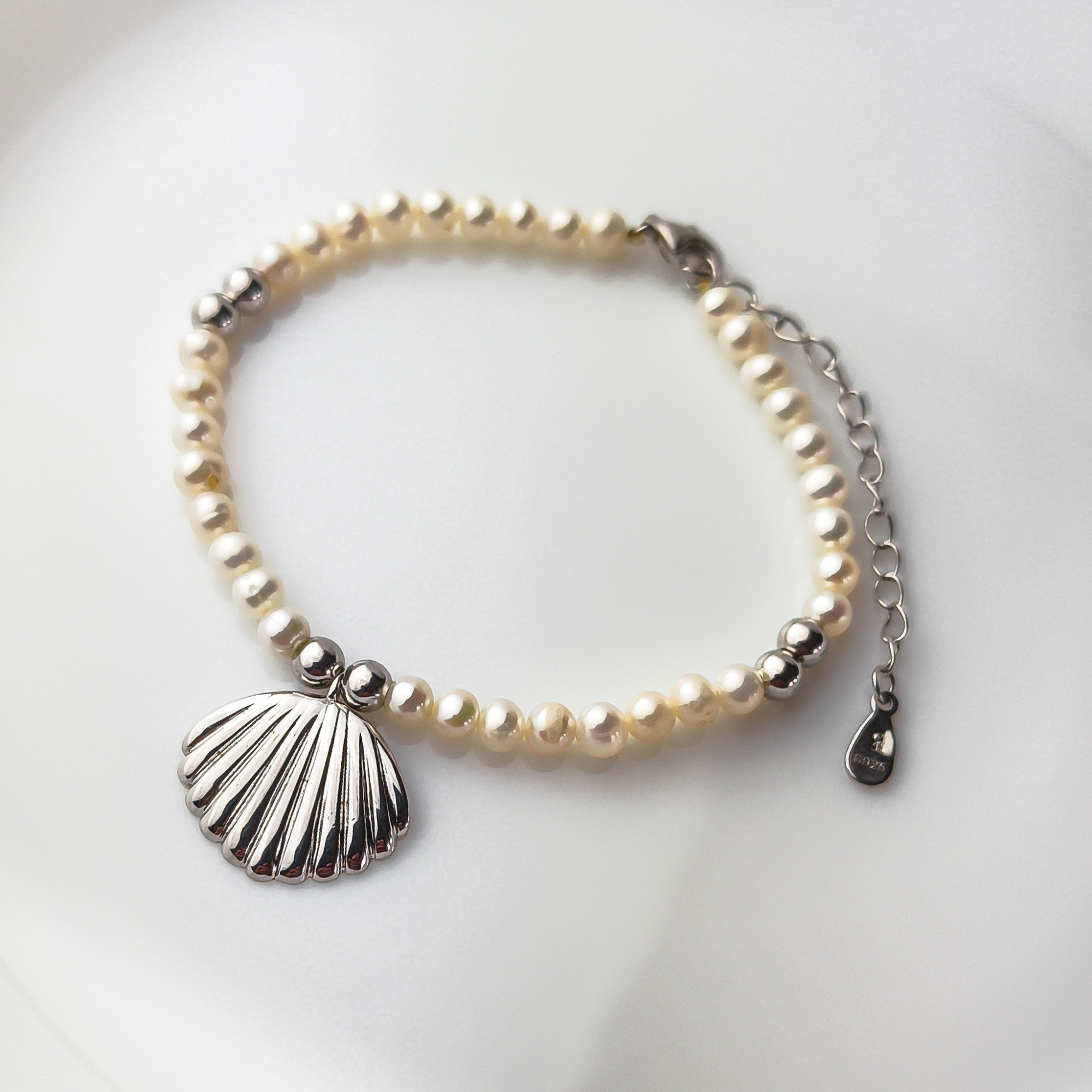 Bransoletka srebrna z perełkami i muszlą pr. 925