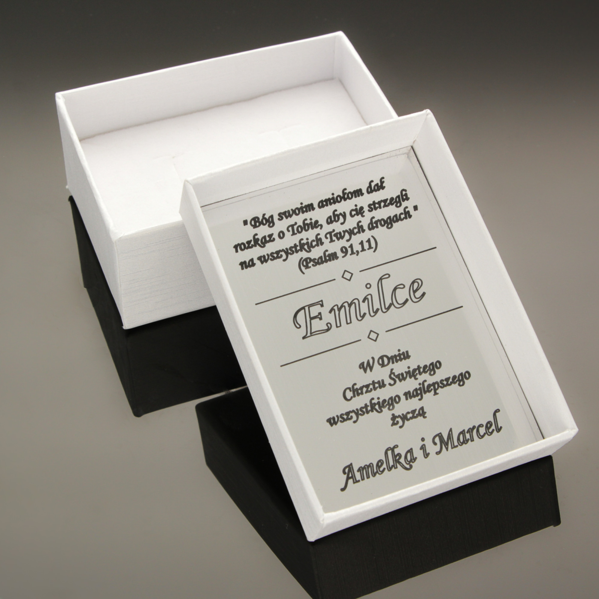 Wygodnie! Wyślij tekst SMS-em na 507080140, e-mailem na leksusgold@leksusgold.pl lub przez Messengera. Dodatkowo mamy możliwość wykonania graweru na blaszce i umieszczeniu jej w pudełku - grawer jest w cenie zakupionego produktu. Skorzystaj z naszych wzorów lub stwórz własny oryginalny tekst graweru - usługa GRATIS. Pięknie zapakowany w nasze firmowe pudełko przewiązane wstążką, będzie miłą niespodzianką dla każdego.