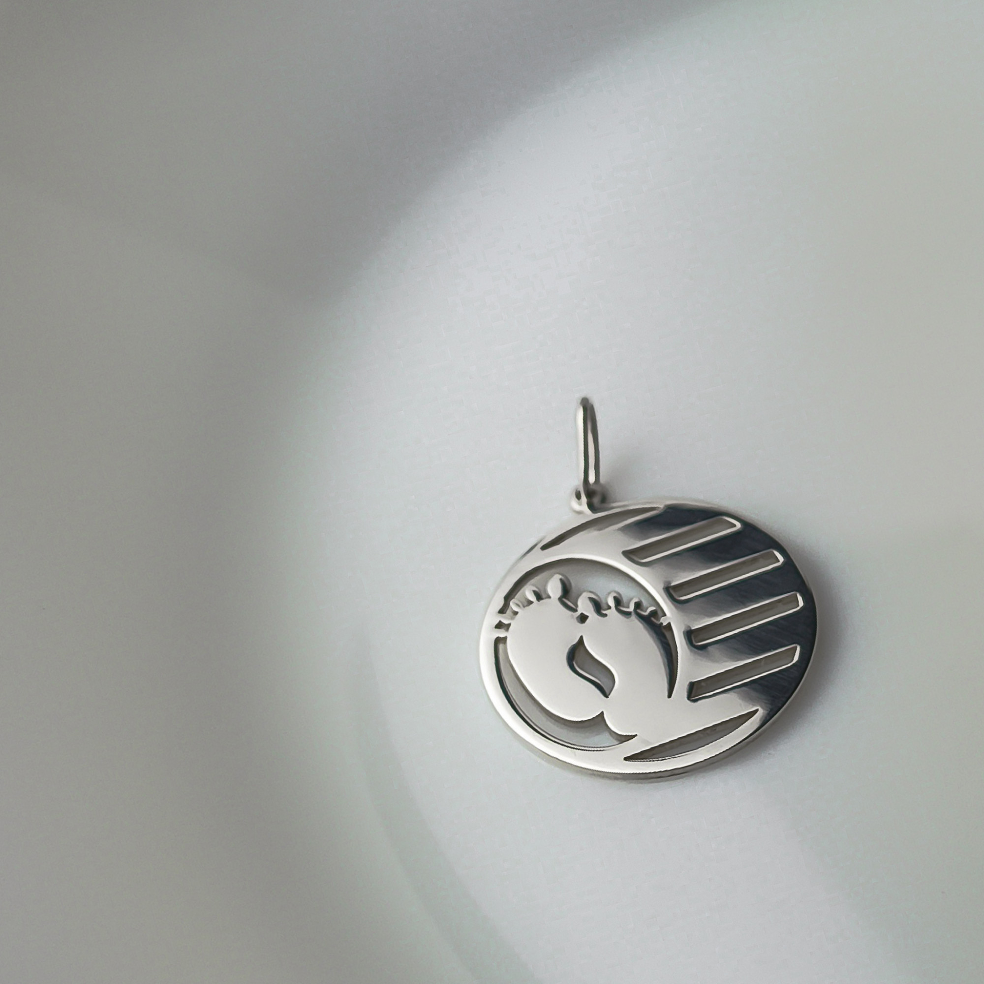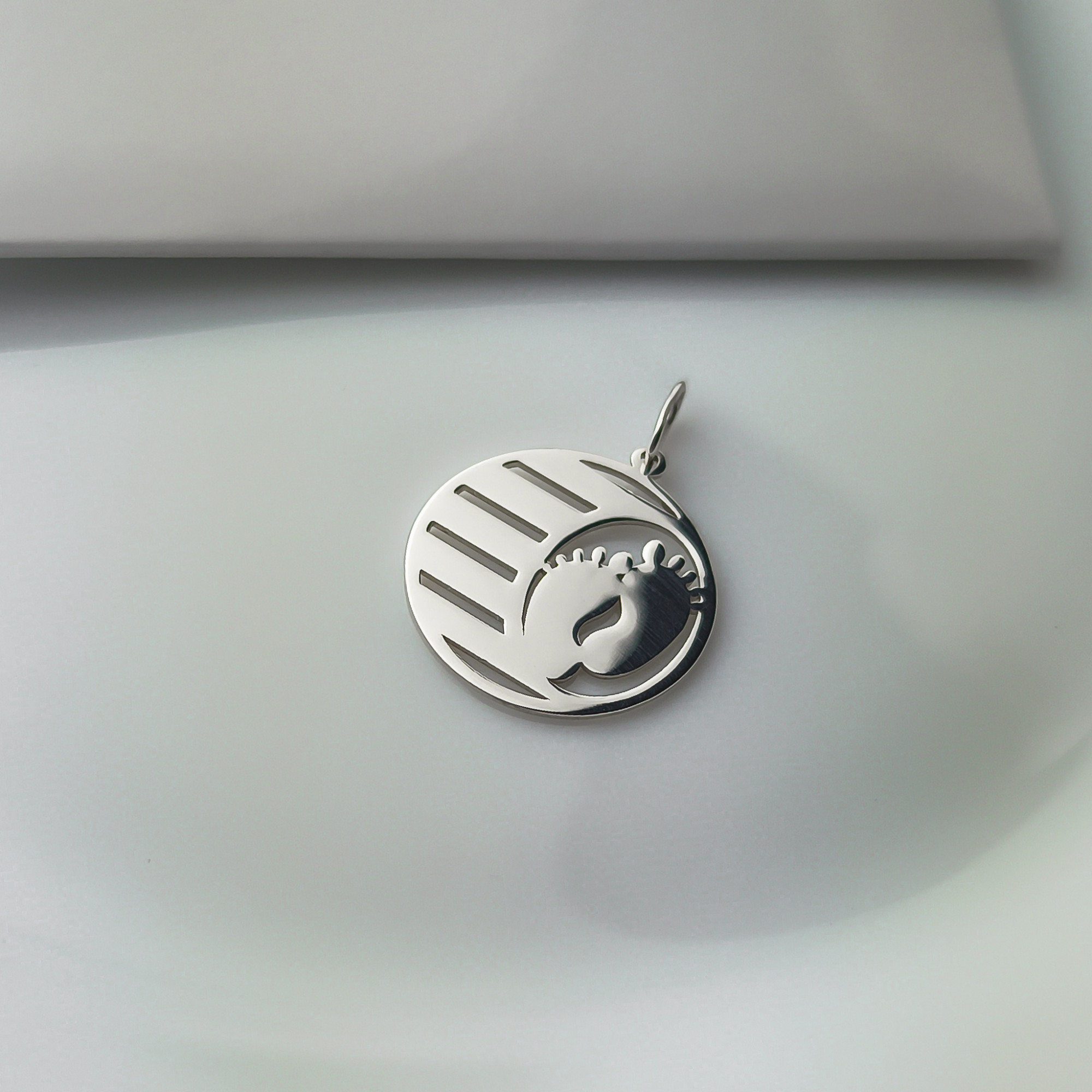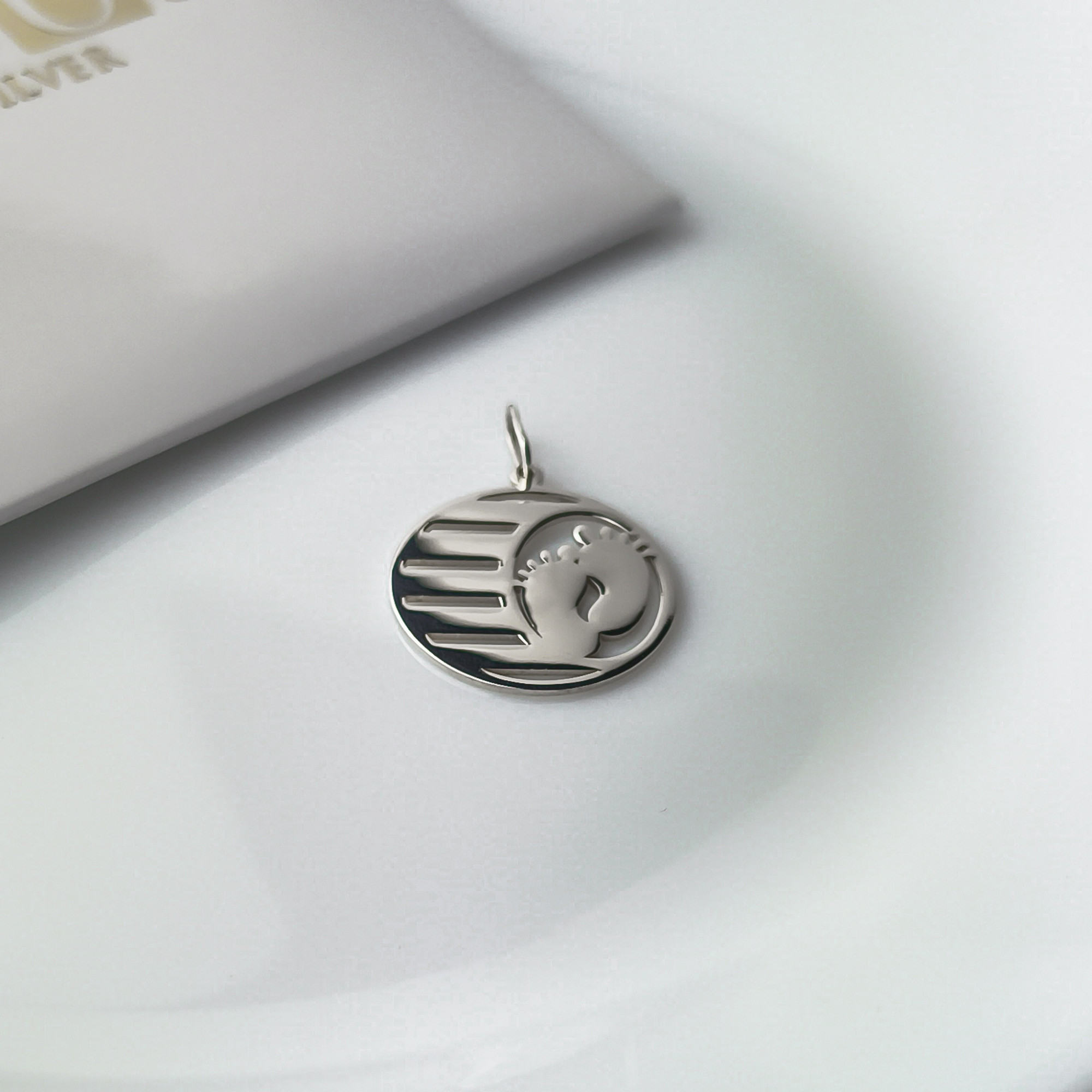 Centralnym elementem jest delikatnie wycięty motyw stópek dziecka, który harmonijnie łączy się z nowoczesnym, geometrycznym wzorem po lewej stronie. Okrągły kształt oraz połączenie pełnej powierzchni stopy z ażurowymi, poziomymi liniami tworzy dynamiczny i stylowy kontrast. Wykonana z wysokiej jakości srebra próby 925, polerowana na wysoki połysk.