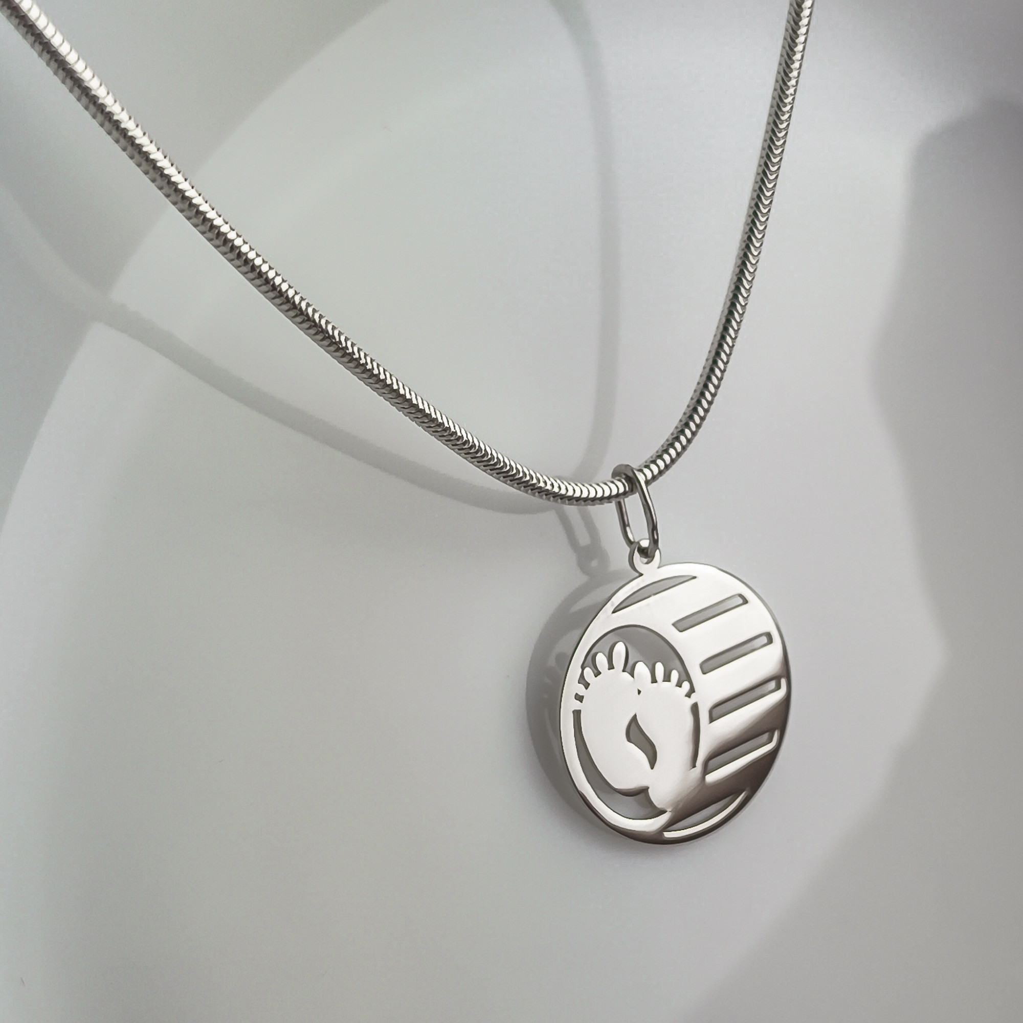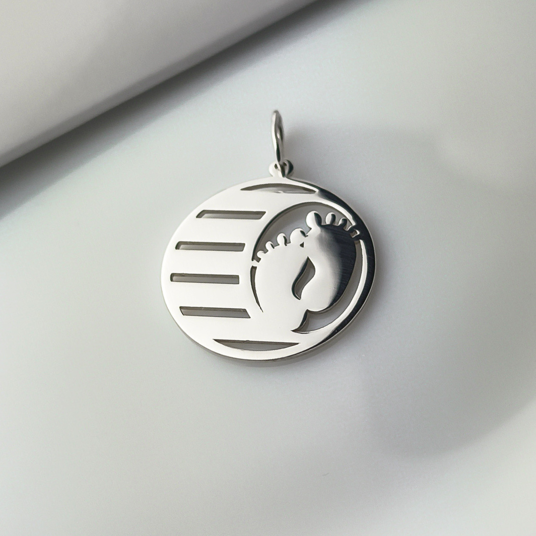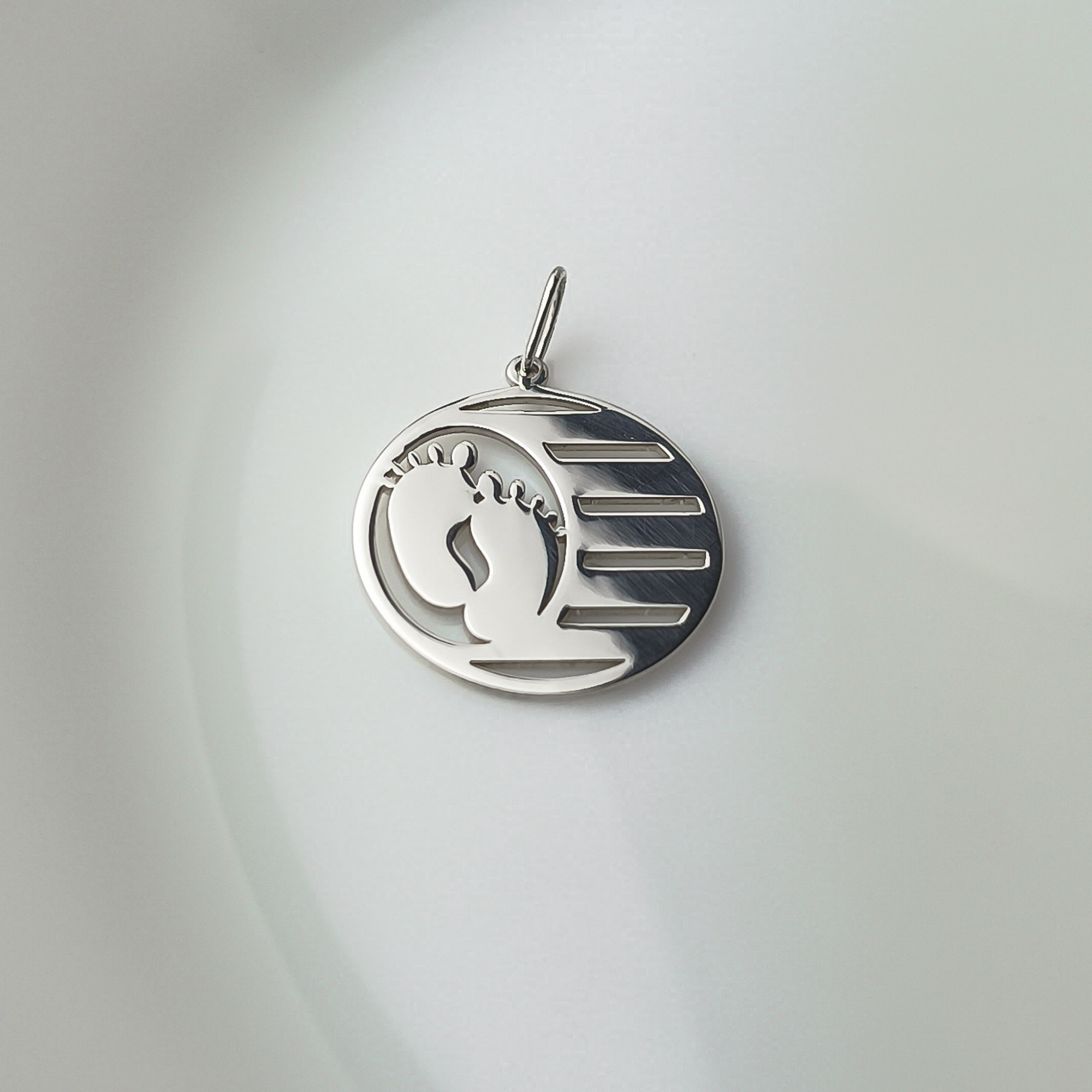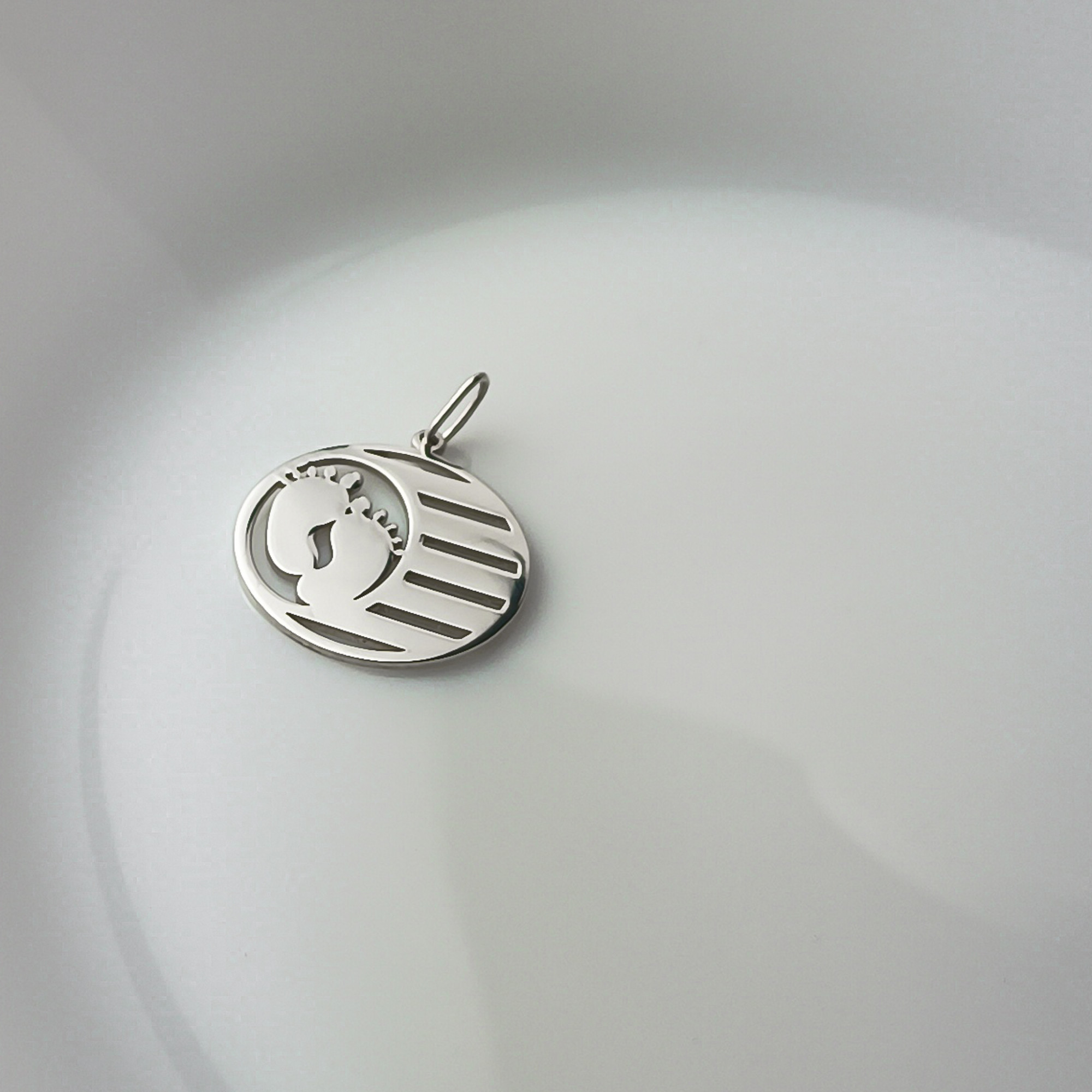 Centralnym elementem jest delikatnie wycięty motyw stópek dziecka, który harmonijnie łączy się z nowoczesnym, geometrycznym wzorem po lewej stronie. Okrągły kształt oraz połączenie pełnej powierzchni stopy z ażurowymi, poziomymi liniami tworzy dynamiczny i stylowy kontrast. Wykonana z wysokiej jakości srebra próby 925, polerowana na wysoki połysk.