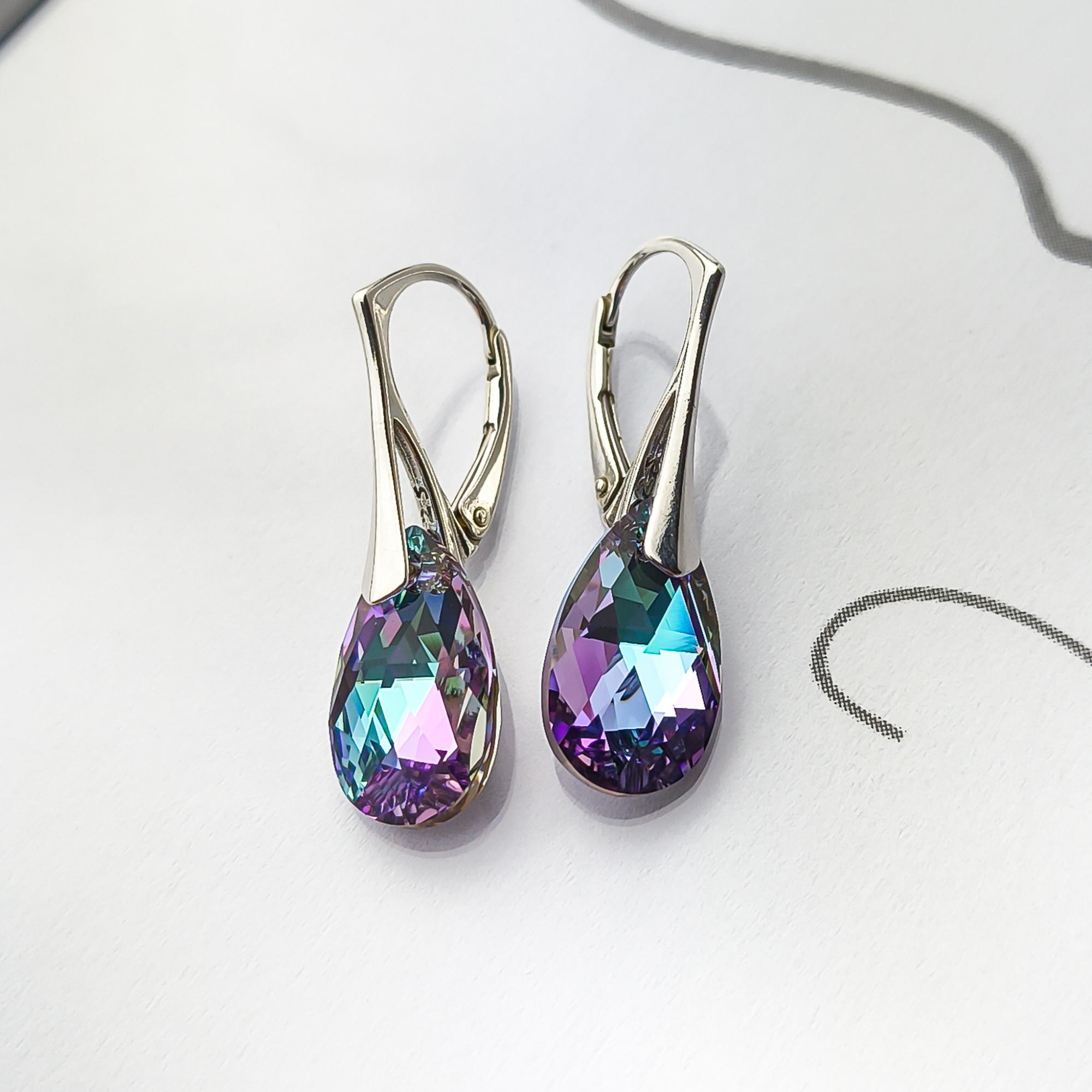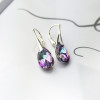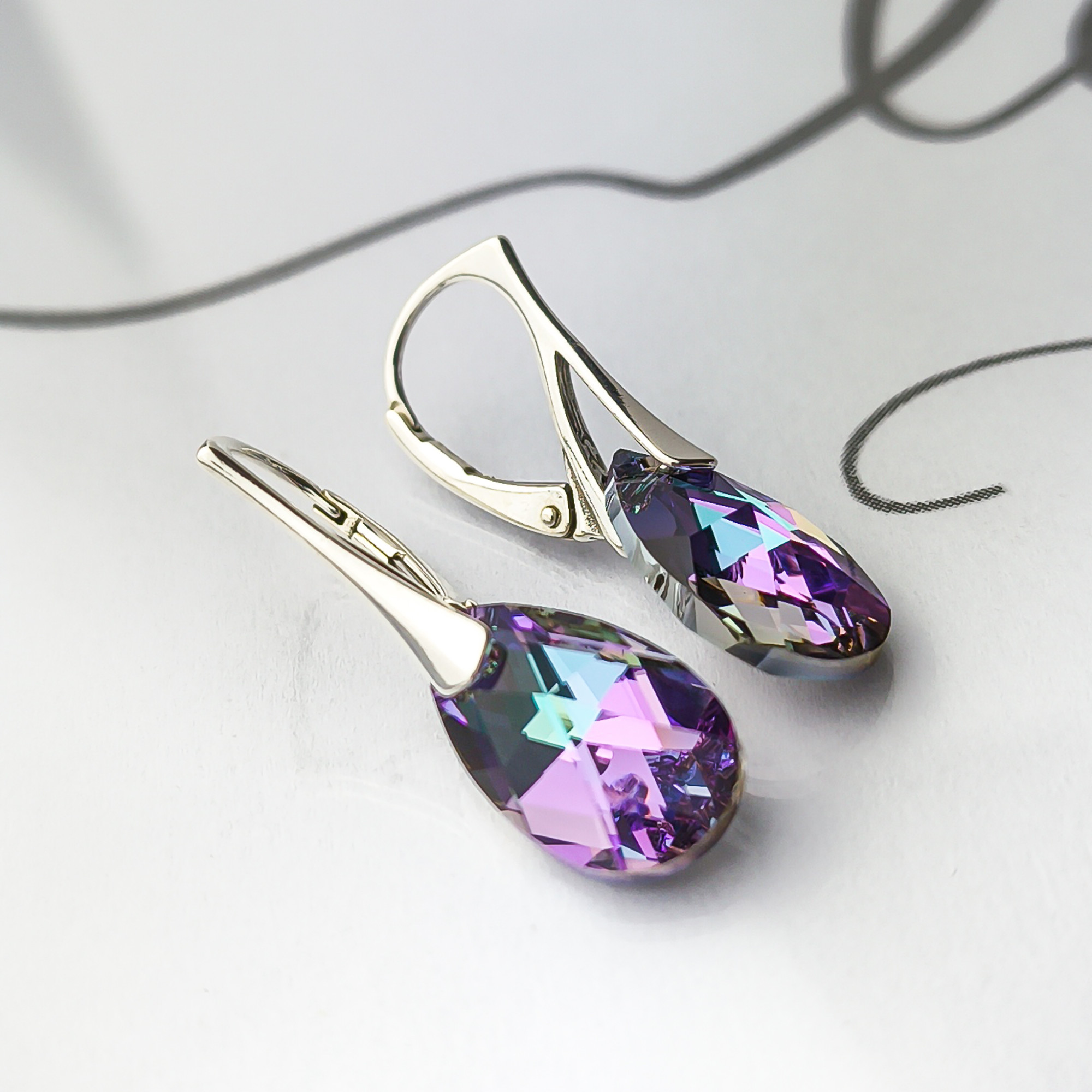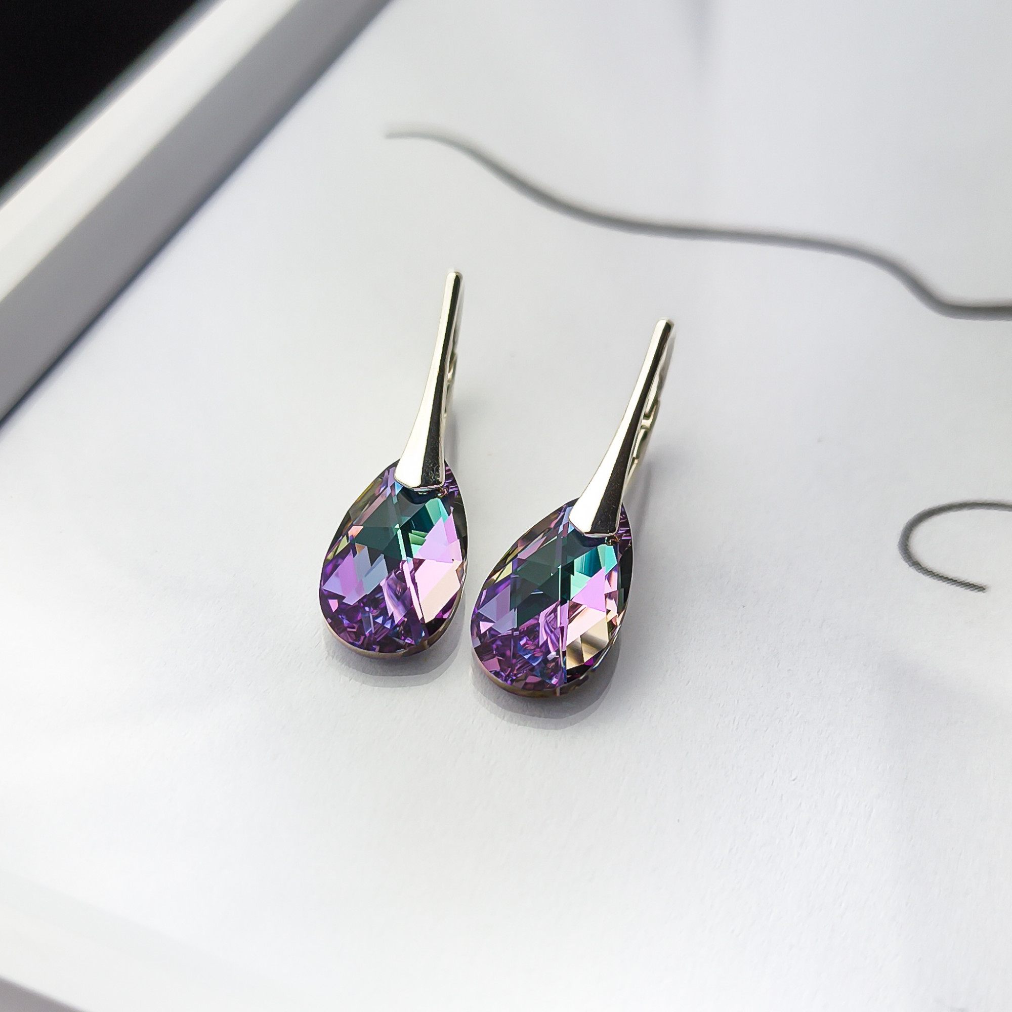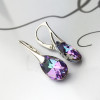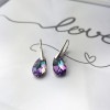 Srebrne kolczyki próby 925 z kryształem Swarovskiego, ich centralnym elementem są fasetowane kryształy w kształcie łezki, które hipnotyzują głębokimi, zmieniającymi się odcieniami. Kryształy mienią się pełną paletą barw – od intensywnego fioletu i różu, przez szmaragdową zieleń, po turkus i złoto.