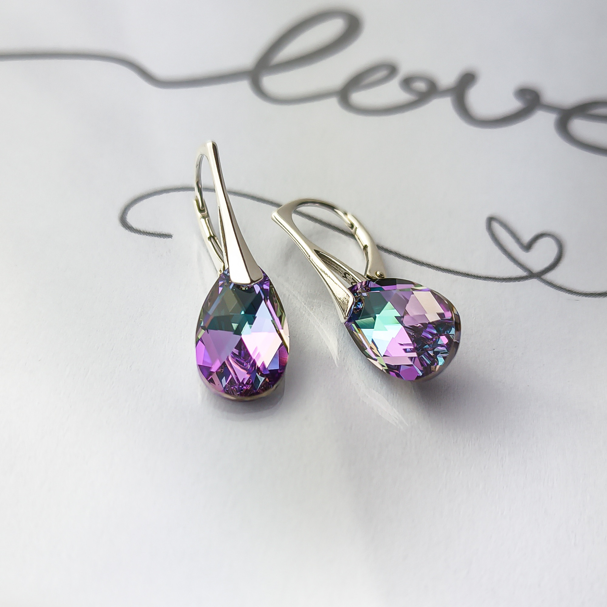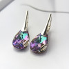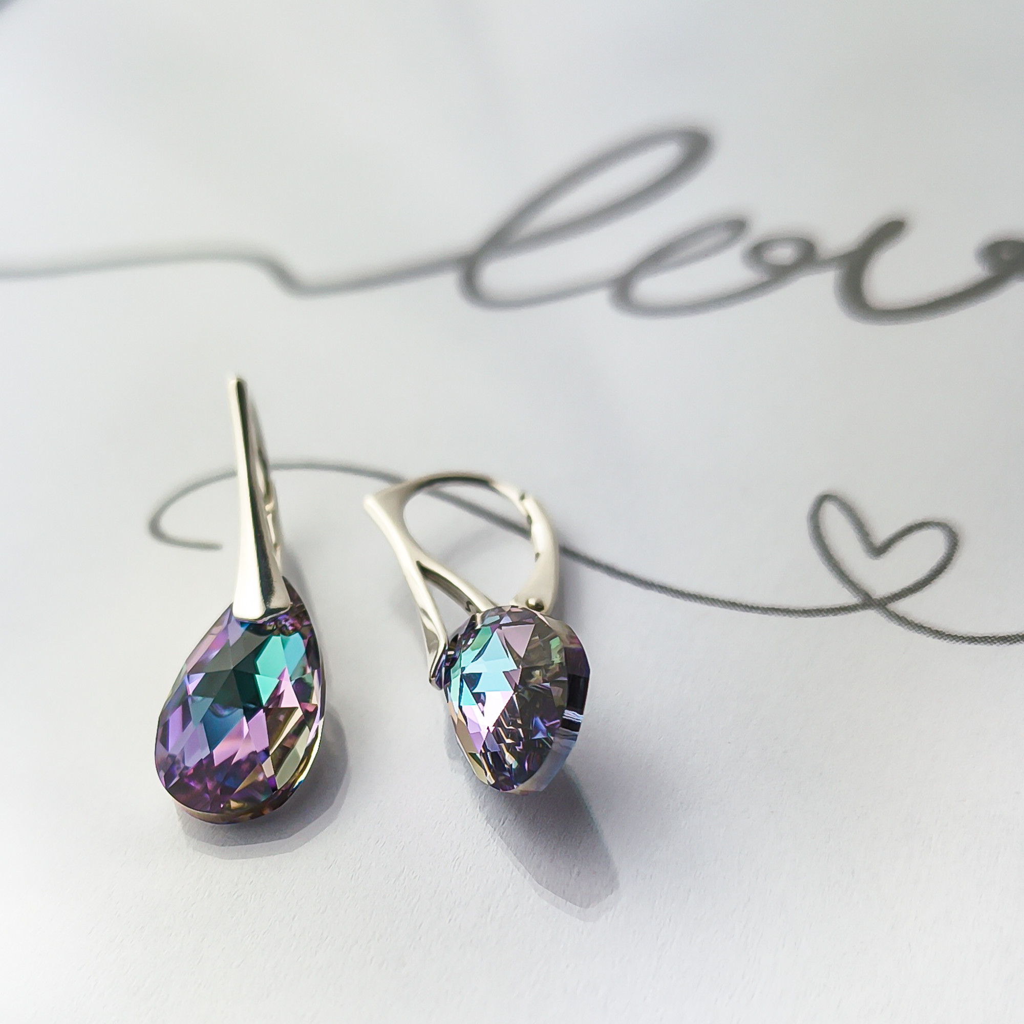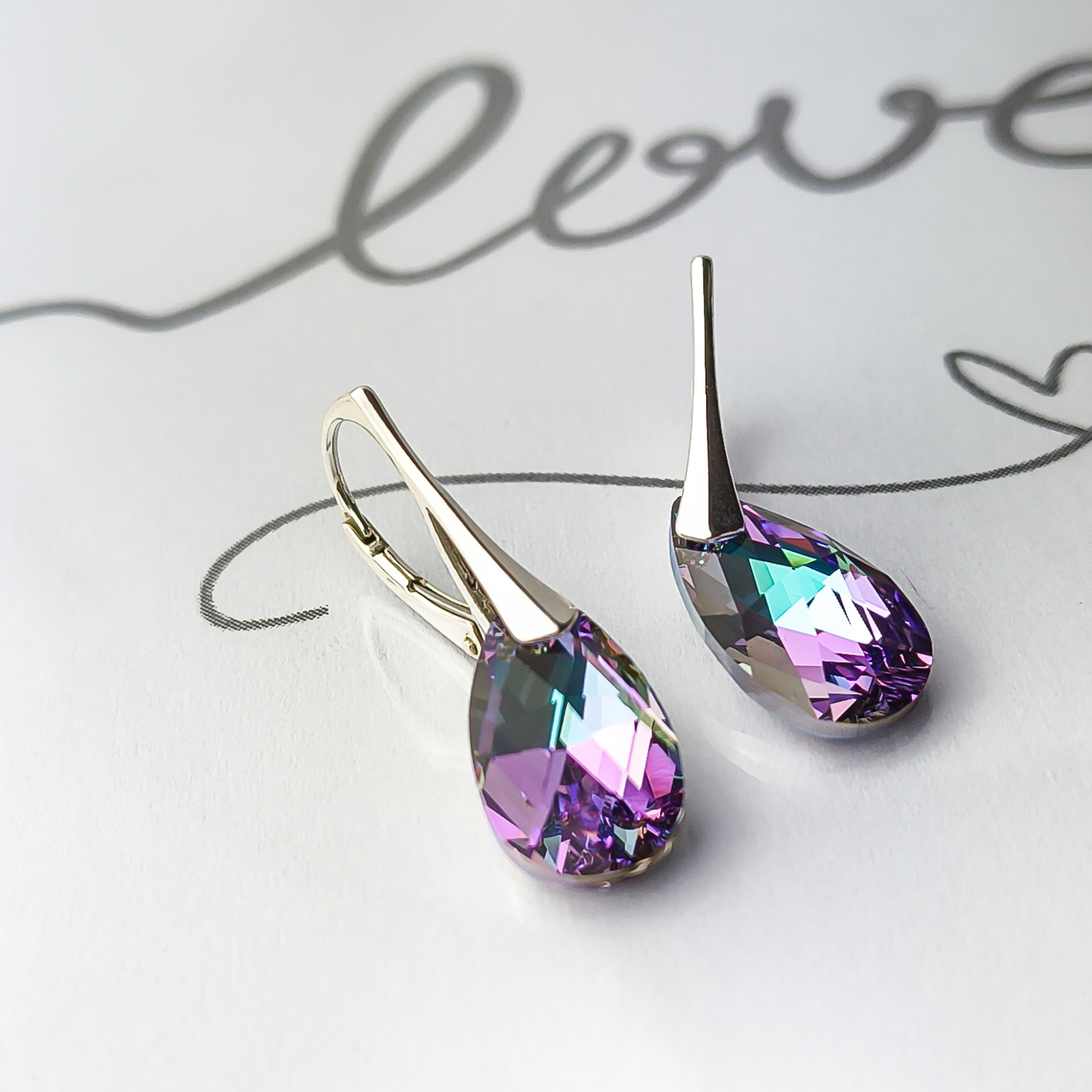 Srebrne kolczyki próby 925 z kryształem Swarovskiego, ich centralnym elementem są fasetowane kryształy w kształcie łezki, które hipnotyzują głębokimi, zmieniającymi się odcieniami. Kryształy mienią się pełną paletą barw – od intensywnego fioletu i różu, przez szmaragdową zieleń, po turkus i złoto.