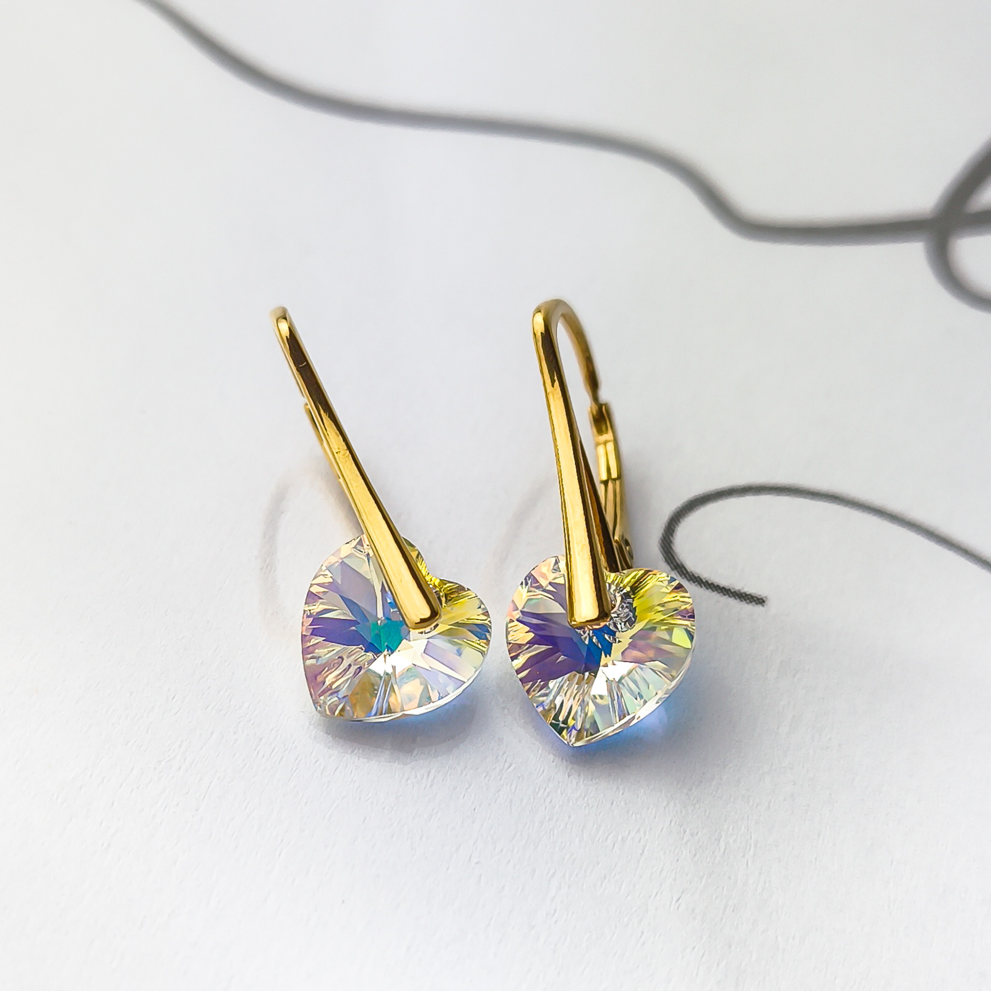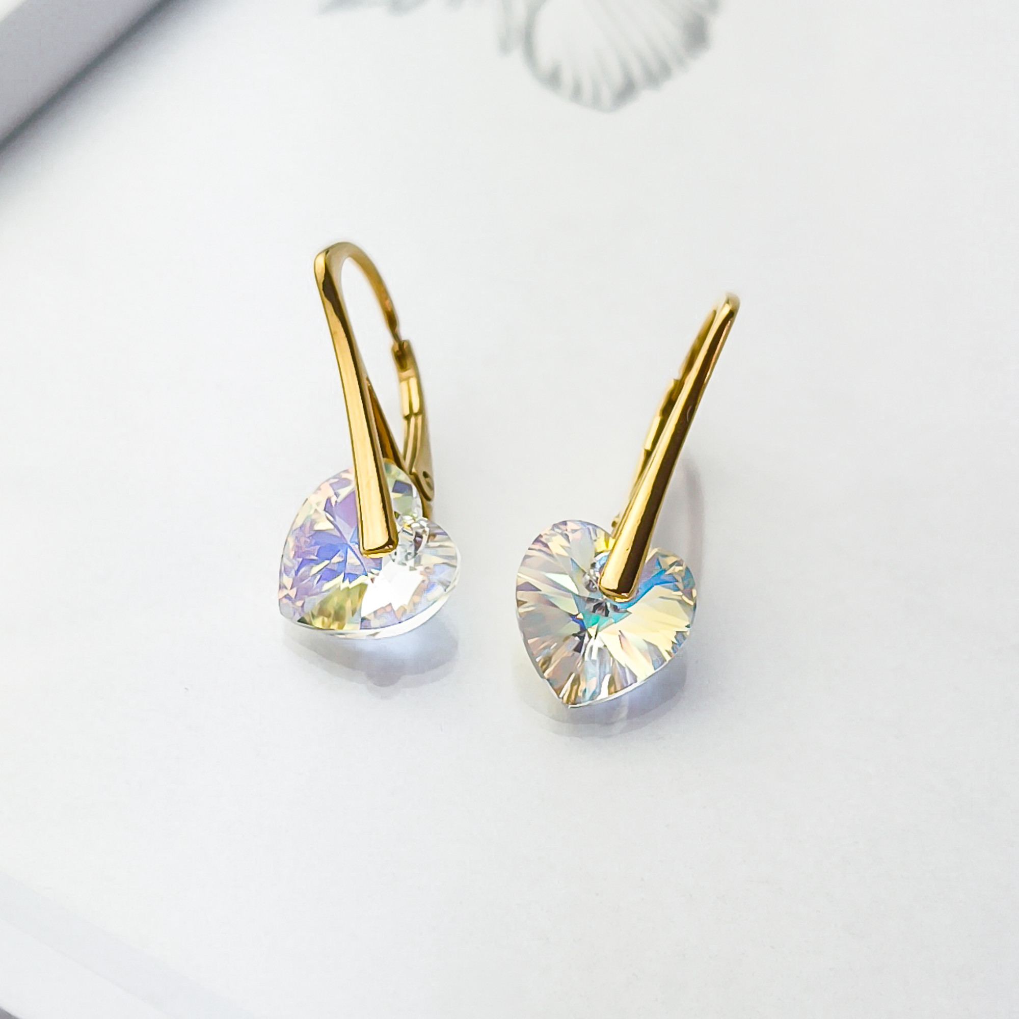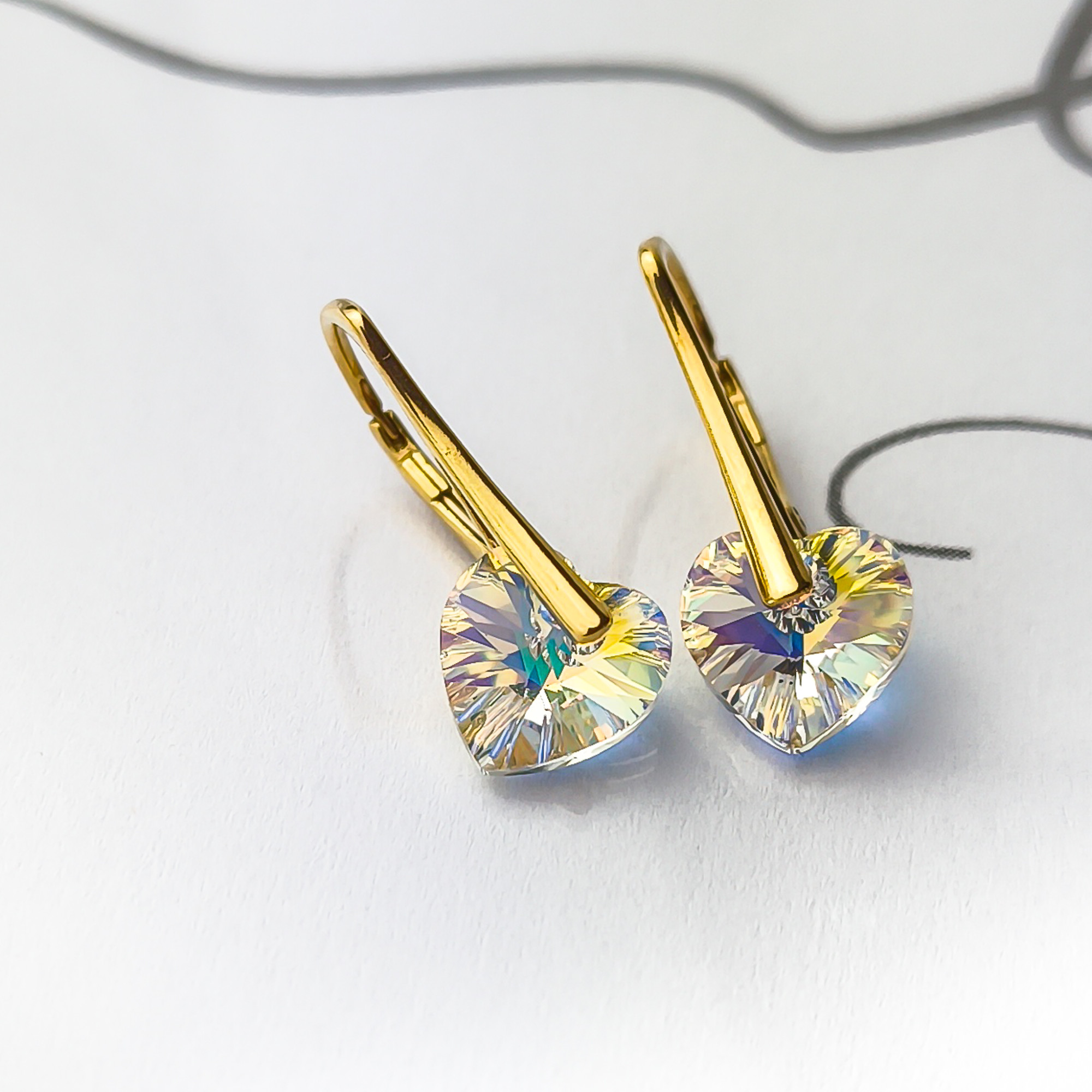 Te przepiękne, złocone kolczyki emanują subtelnym luksusem i romantycznym urokiem. Ich centralnym punktem jest precyzyjnie szlifowany kryształ w kształcie serca, który posiada zjawiskowy efekt Crystal AB.