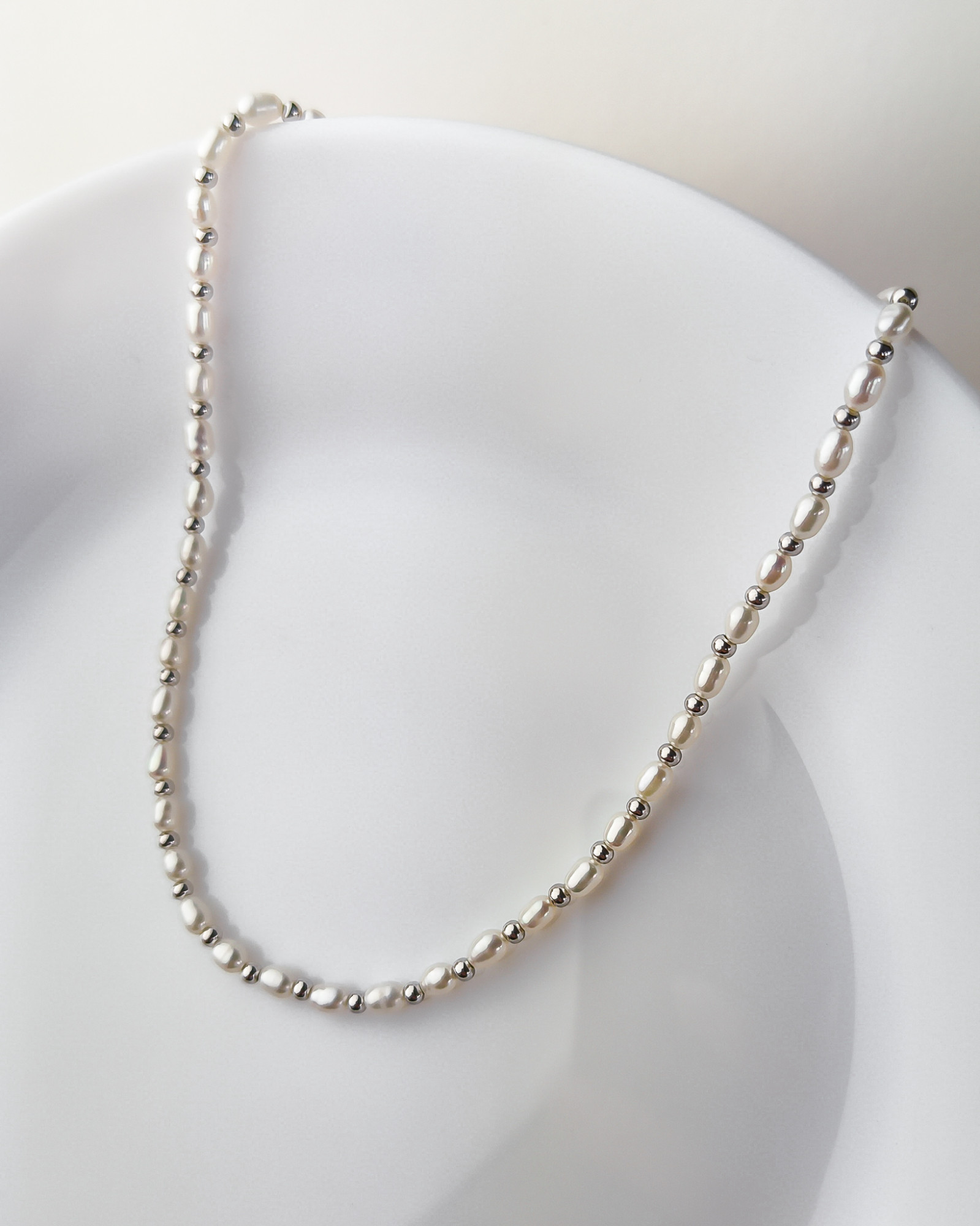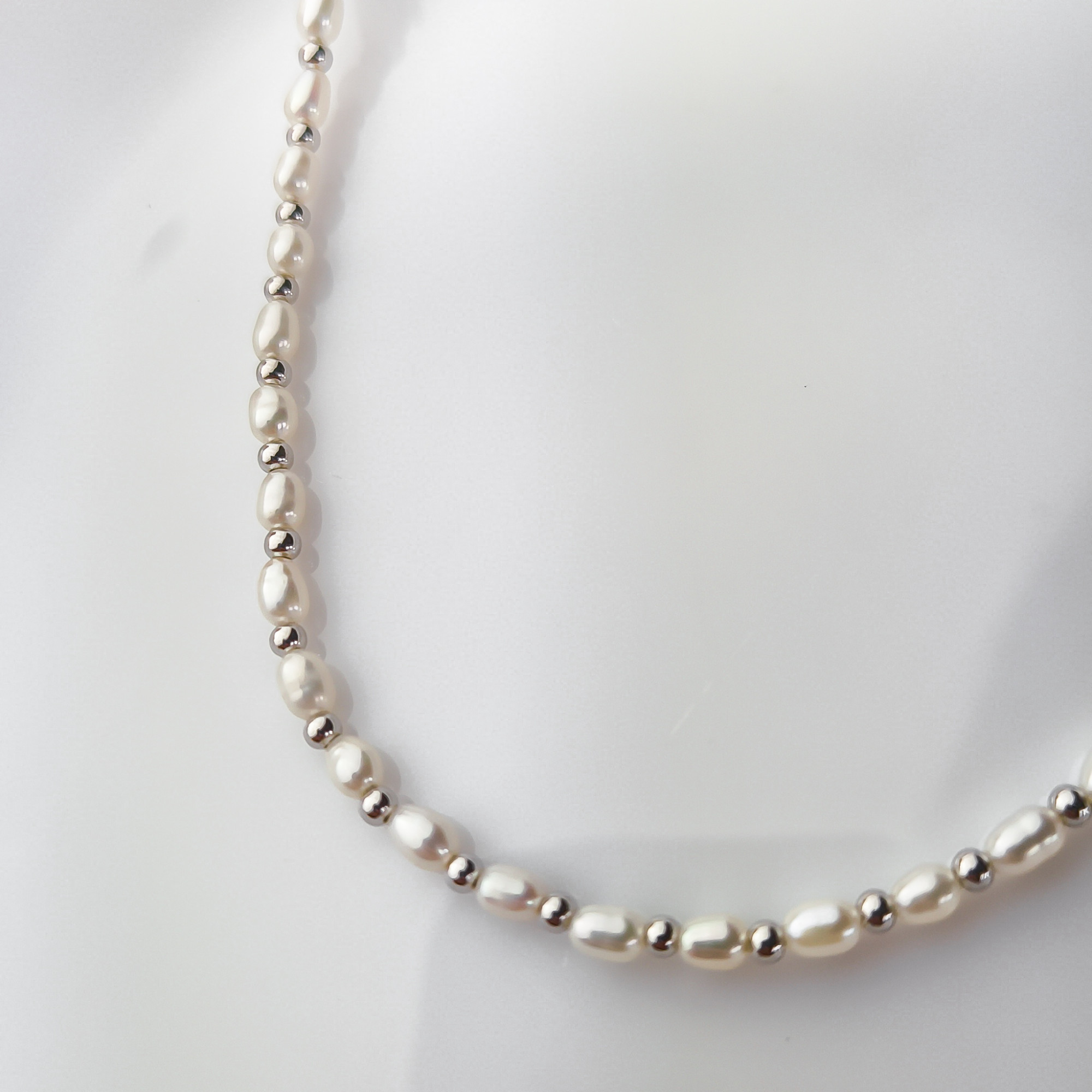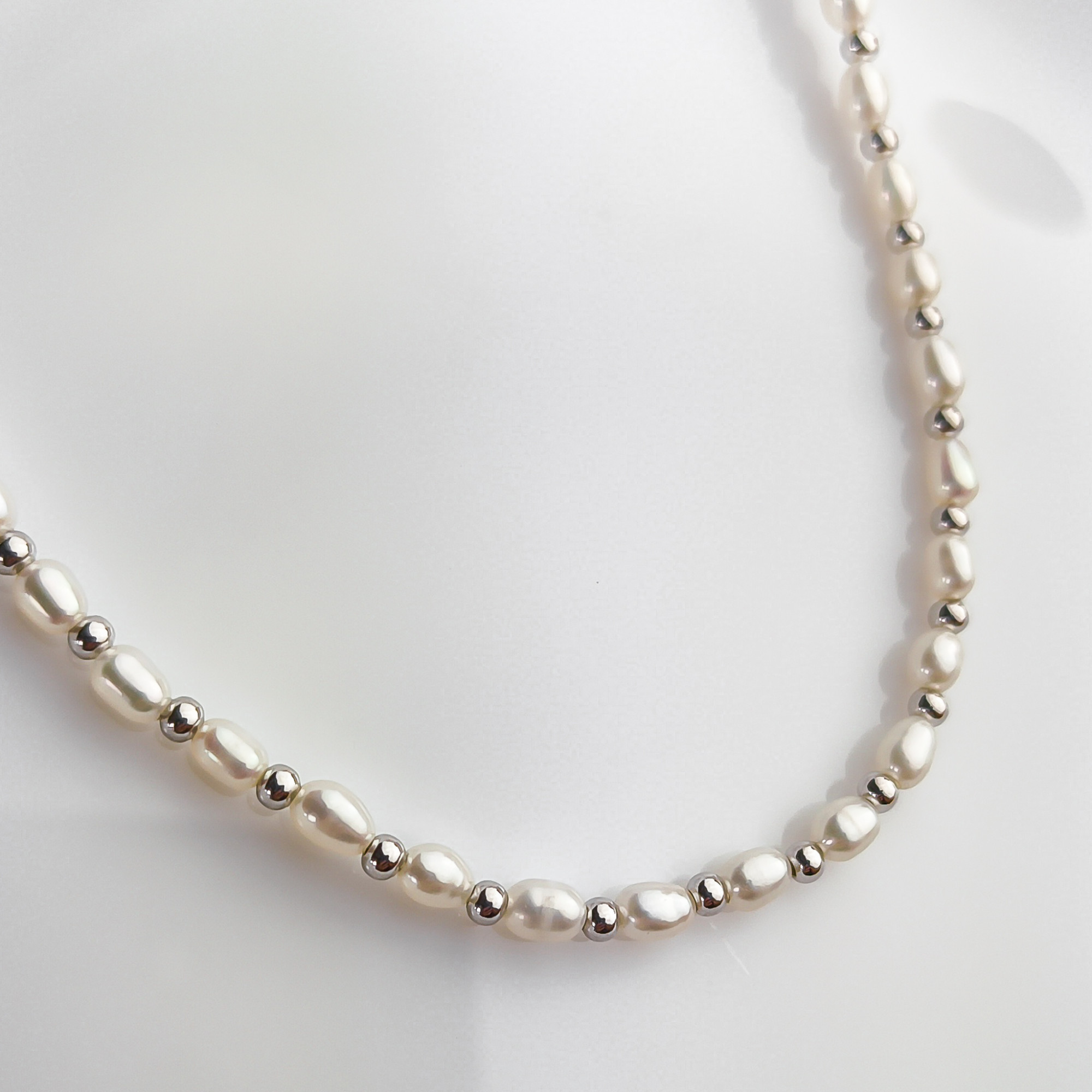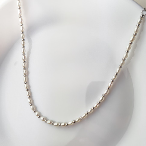 Stylowy srebrny naszyjnik próby 925. Łańcuszek o splocie ankier. Naszyjnik wzbogacony snurem perełek o średnicy 3 x 6 mm. Pomiędzy perłami umieszczono srebrne kuleczki. Sprawdzi się jako gustowny dodatek, do każdej damskiej stylizacji. Biżuteria zapakowana w ozdobne pudełeczko będzie wspaniałym prezentem.