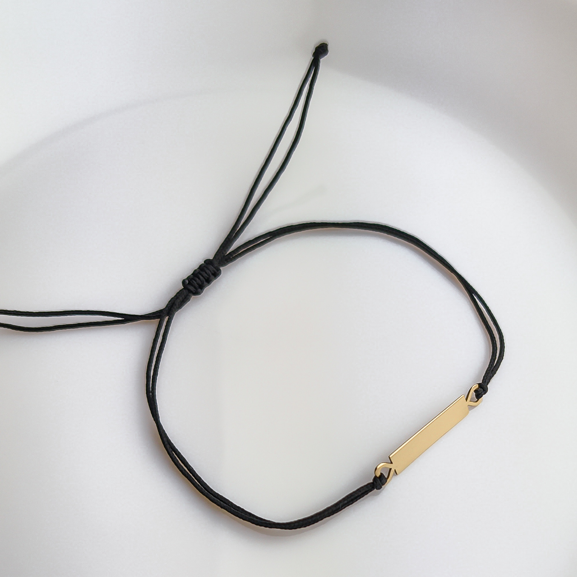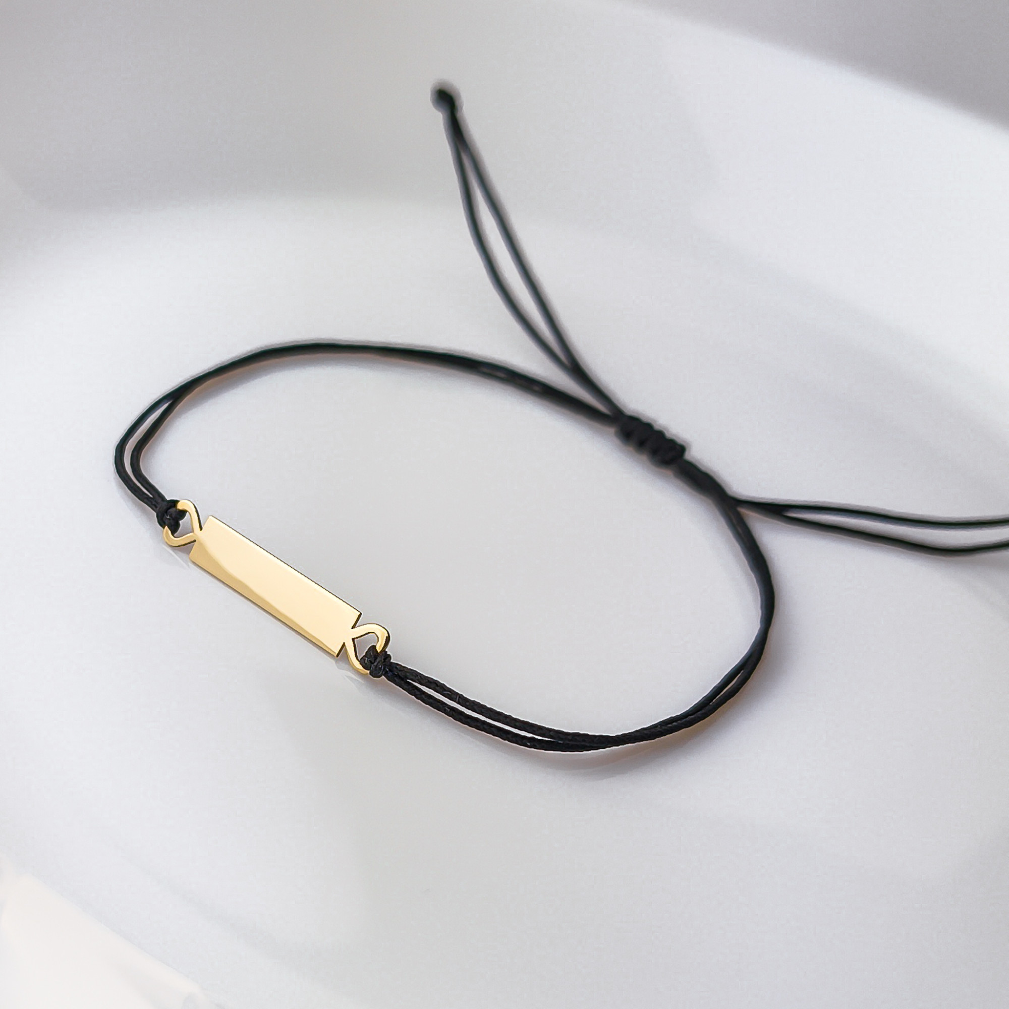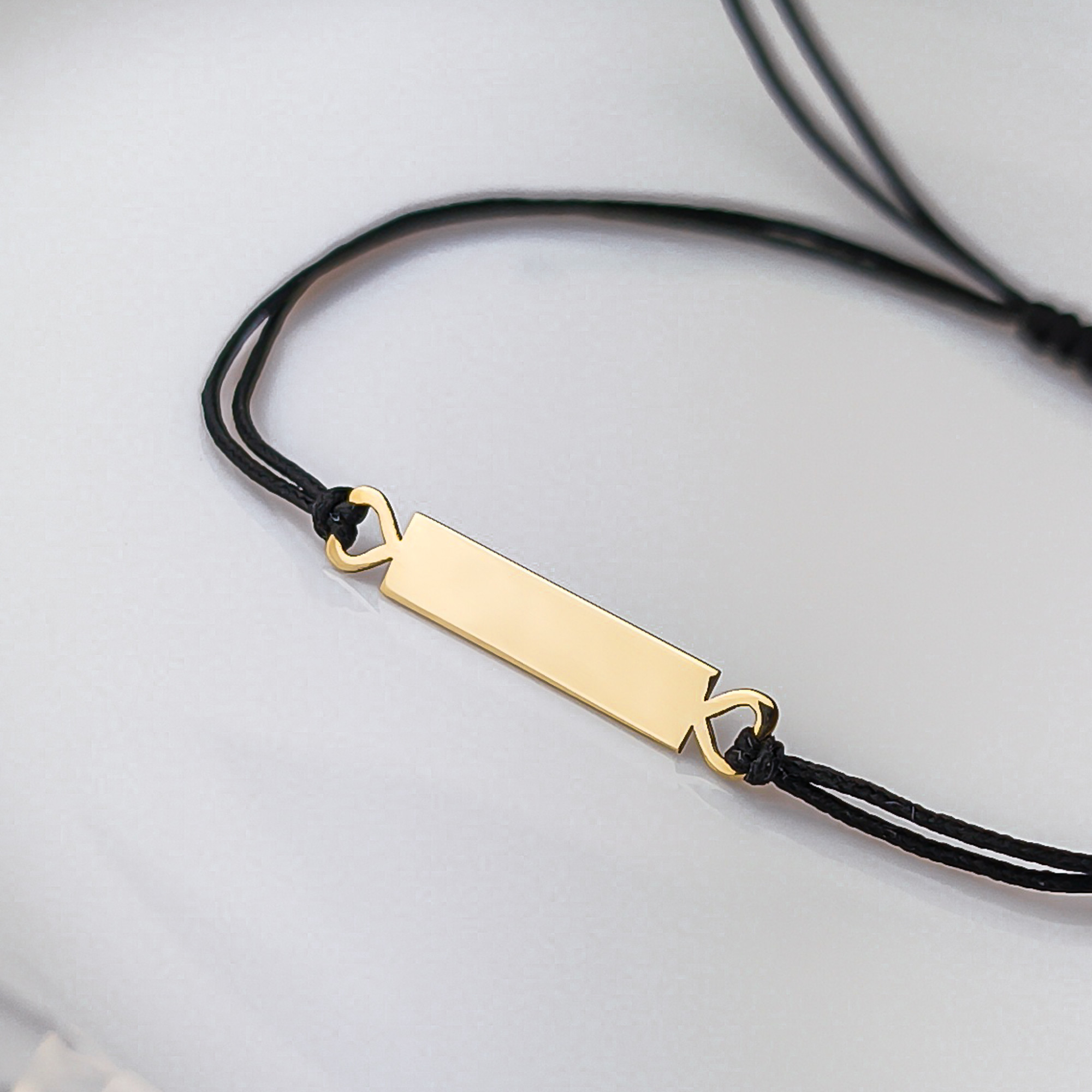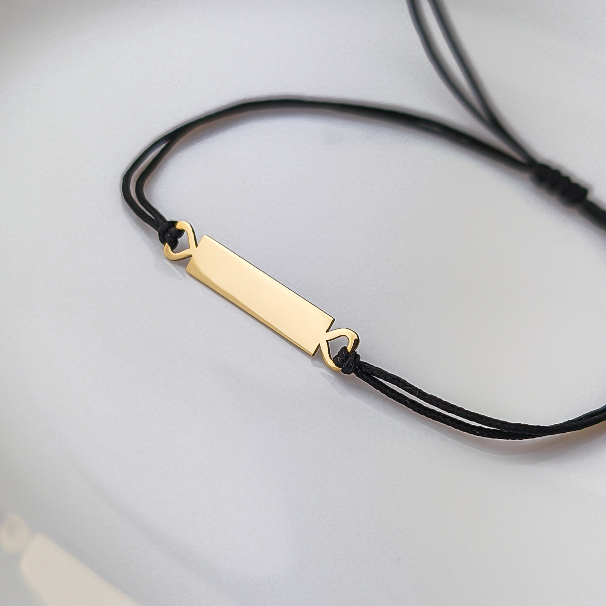 Złota bransoletka na czarnym sznurku blaszka do graweru pr.585