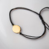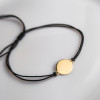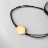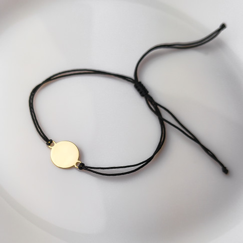 Niezwykle nowoczesna forma bransoletki na czarnym sznurku. Motywem głównym jest błyszczące złote kółko, na którym możemy wykonać grawer - GRATIS. Idealny wybór na oryginalny prezent. Z pewnością doda blasku i wyjątkowego charakteru każdej damskiej stylizacji.