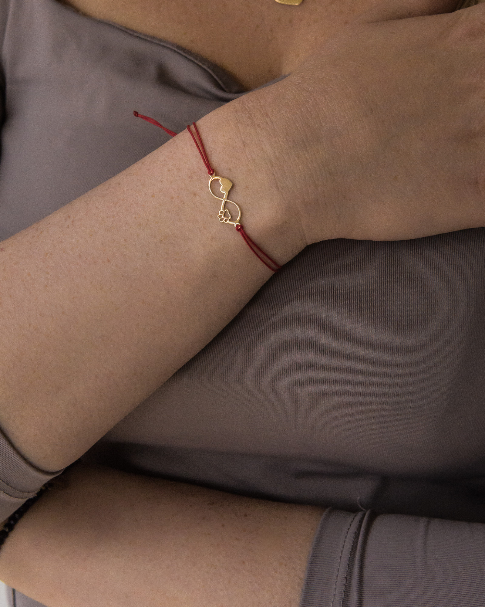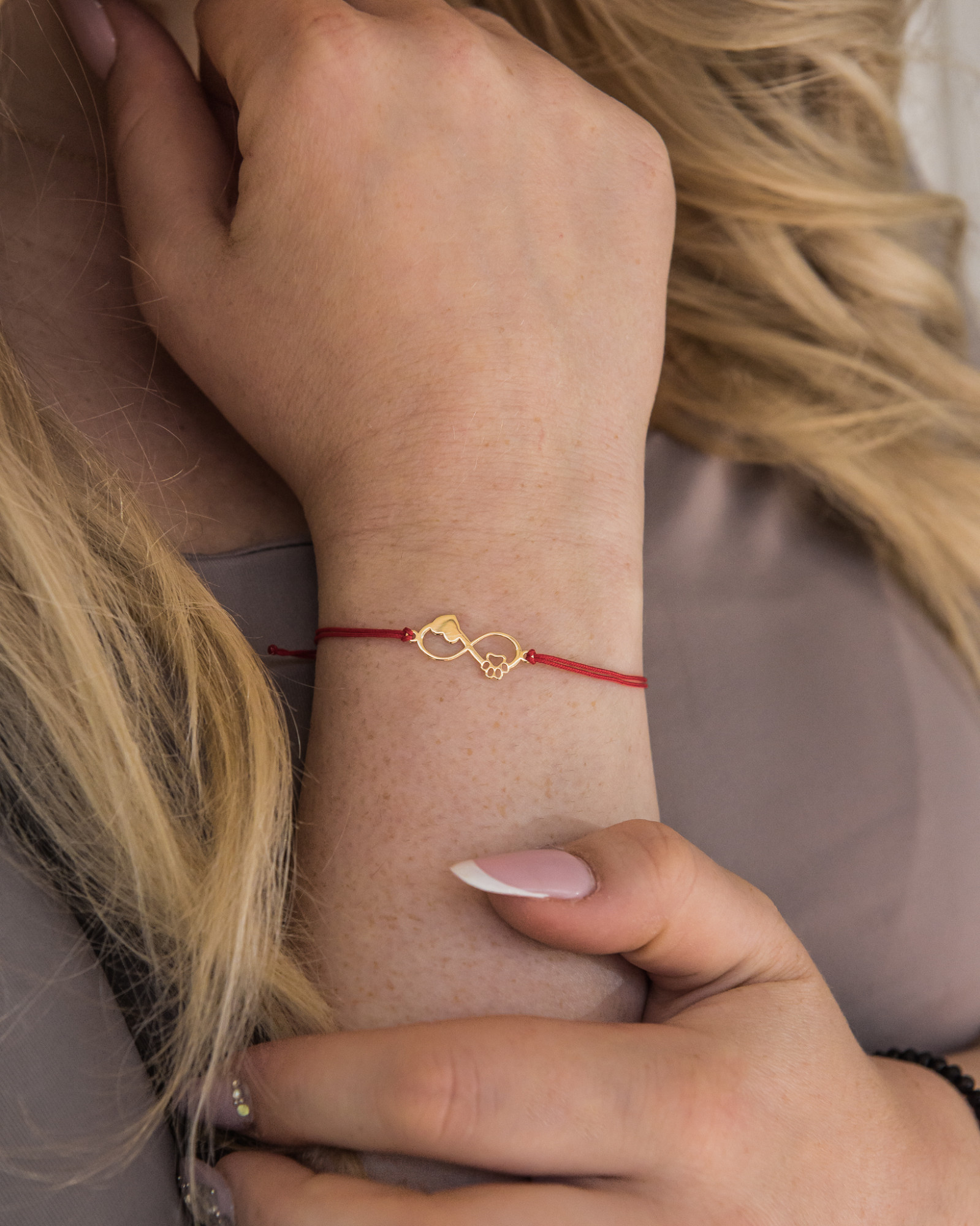 Oryginalna złota bransoletka na czerwonym sznurku. Bransoletka wykonana ze złota o próbie 585 charakteryzuje się perfekcyjnym wykończeniem z dbałością o szczegóły. Symbol nieskończoności z łapką i serduszkiem to idealny dodatek dla każdego miłośnika zwierząt. Czerwony sznureczek dodaje jej lekkości i uroku.