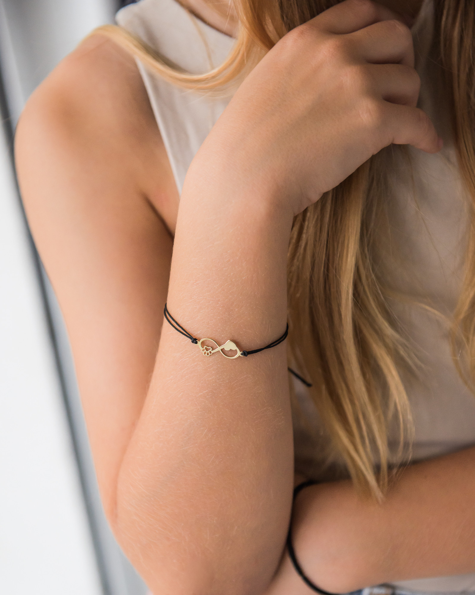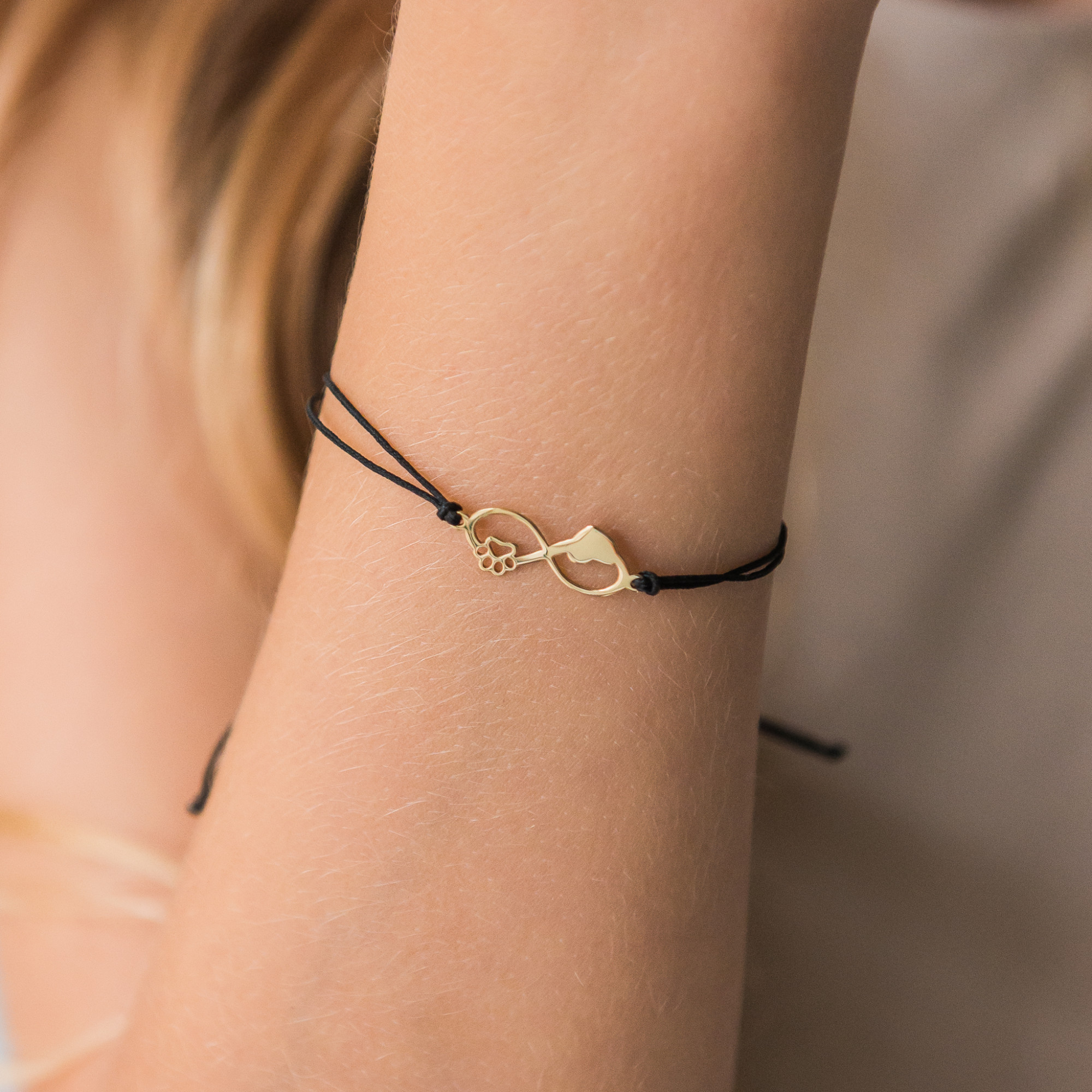 Oryginalna złota bransoletka na czarnym sznurku. Bransoletka wykonana ze złota o próbie 585 charakteryzuje się perfekcyjnym wykończeniem z dbałością o szczegóły. Symbol nieskończoności z łapką i serduszkiem to idealny dodatek dla każdego miłośnika zwierząt. Czarny sznureczek dodaje jej lekkości i uroku.