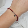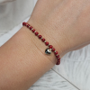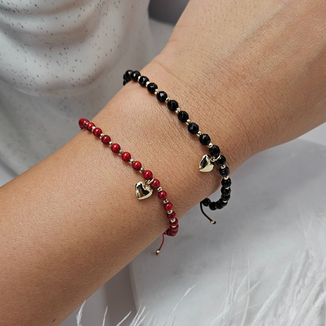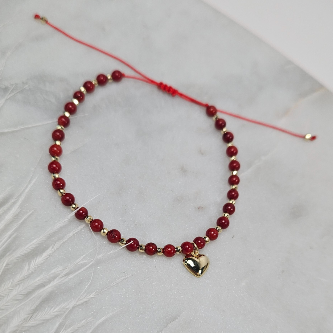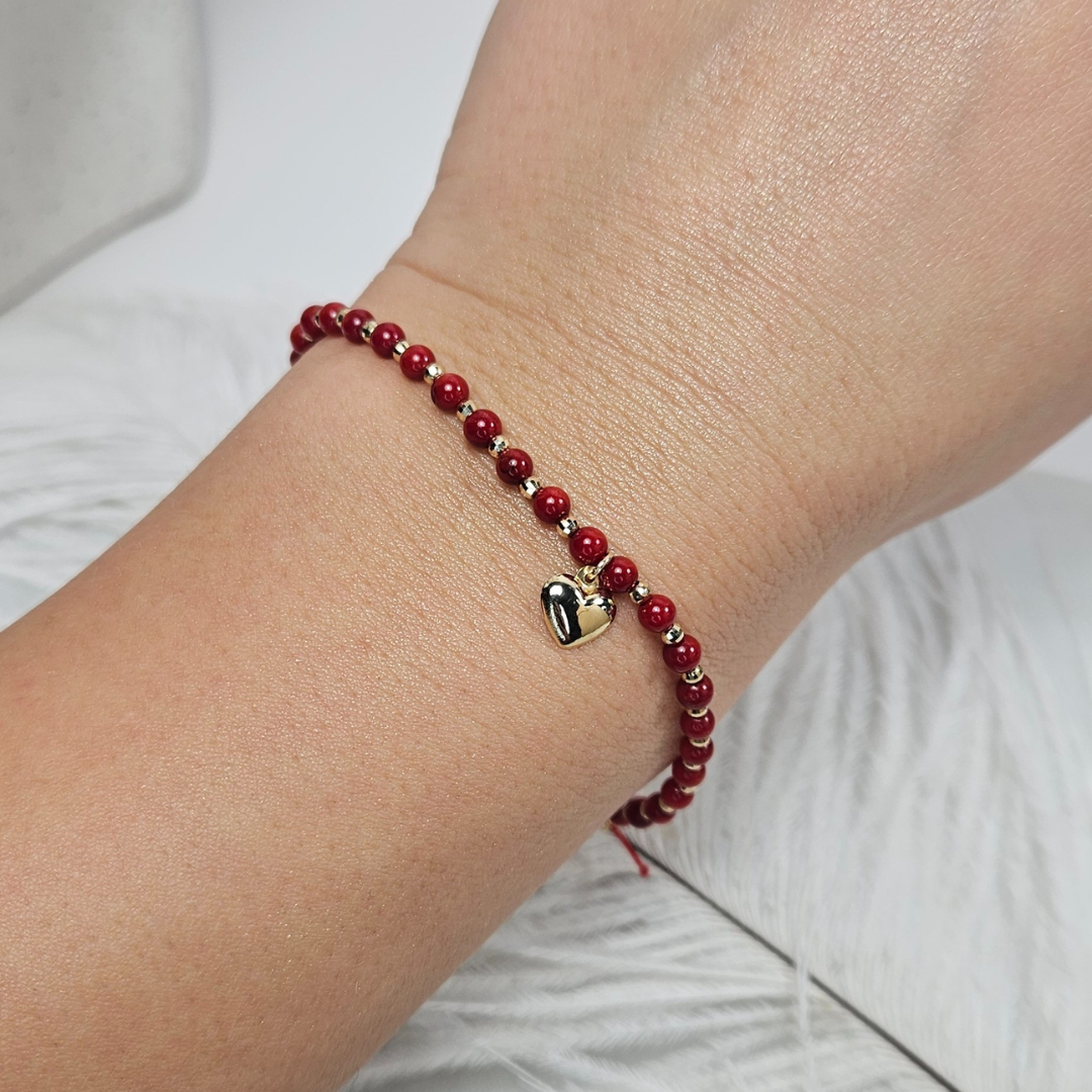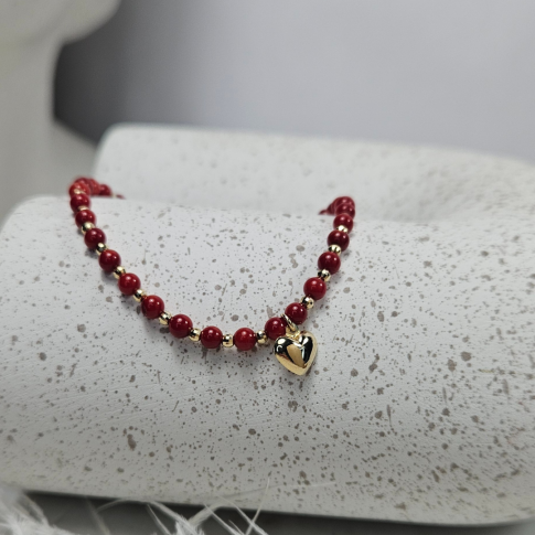 Oryginalna złota bransoletka na czerwonym sznurku, na której umieszczone zostały naturalne kamienie typu korale i złote kulki. Na serduszku możemy wykonać symboliczny grawer - np. literka, inicjały. Bransoletka z pewnością przypadnie do gustu wielu miłośniczkom biżuterii i będzie idealnym dopełnieniem każdej stylizacji. Biżuteria zapakowana w nasze firmowe ozdobne pudełko będzie wspaniałym prezentem.