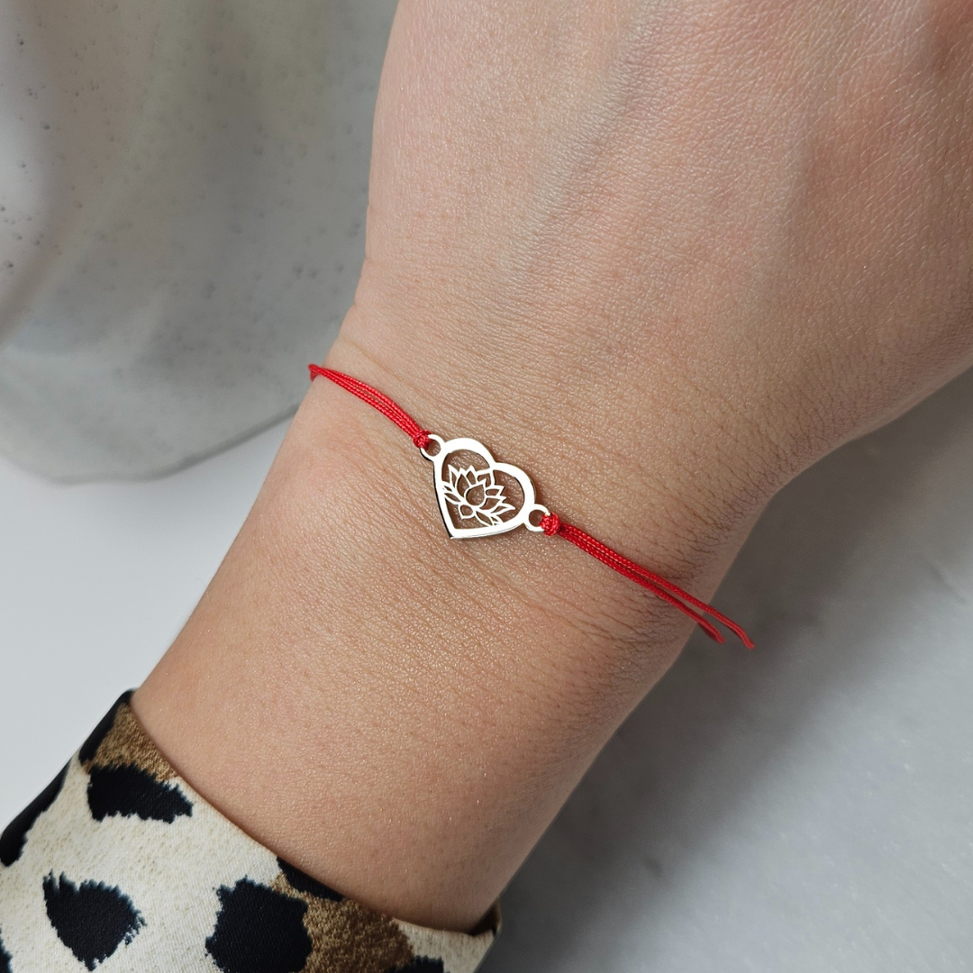 Oryginalna złota bransoletka na czerwonym sznurku, na którym umieszczony został element ozdobny w postaci złotego konturu serca i kwiatu lotosu. Bransoletka wykonana ze złota o próbie 585 charakteryzuje się perfekcyjnym wykończeniem z dbałością o szczegóły. Jej unikatowy styl podkreśli każdą stylizację, zarówno elegancką sukienkę założoną na wyjątkową okazję, jak i klasyczny zestaw koszuli i spodni do pracy. Biżuteria zakupiona u nas pakowana jest w ozdobne pudełka z logo LeksusGold. Dodatkowo mamy możliwość wykonania graweru na blaszce i umieszczeniu jej w pudełku. Skorzystaj z naszych wzorów lub stwórz własny oryginalny tekst graweru - usługa GRATIS.