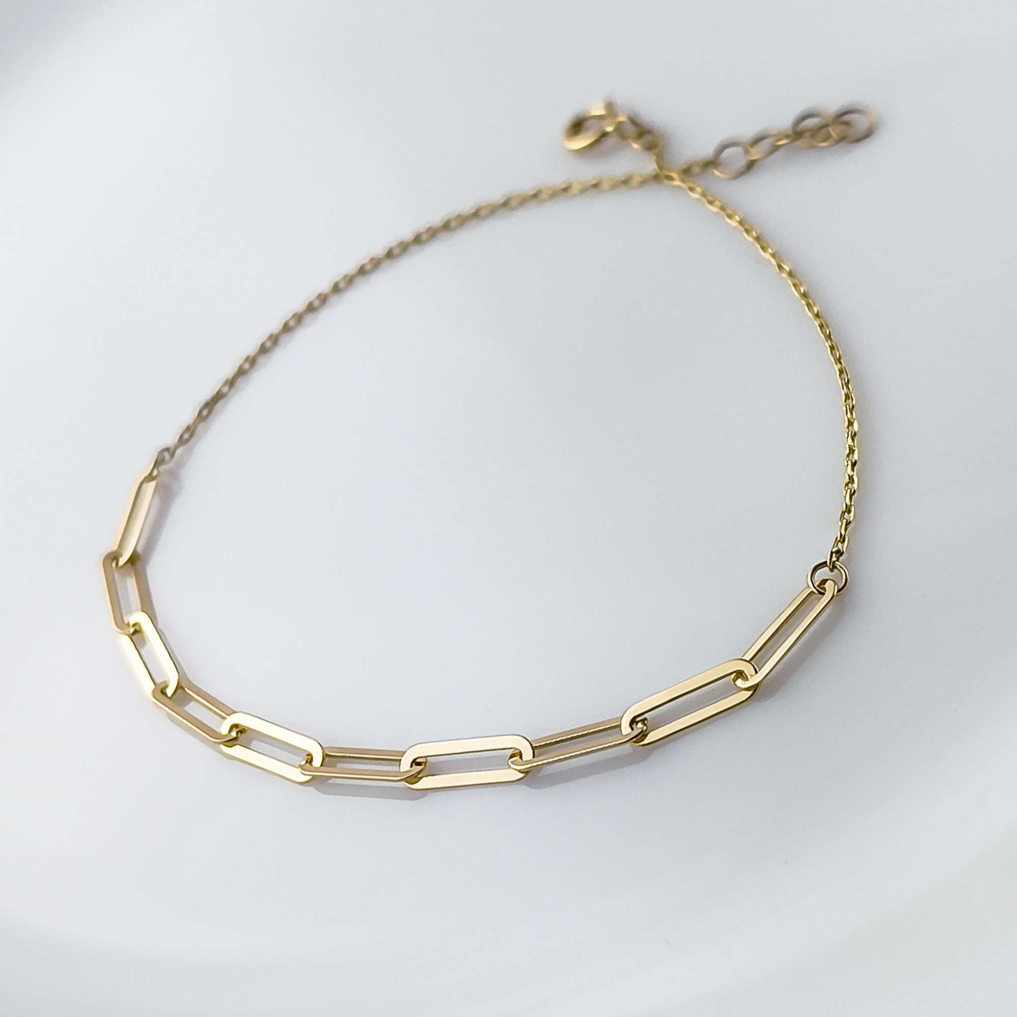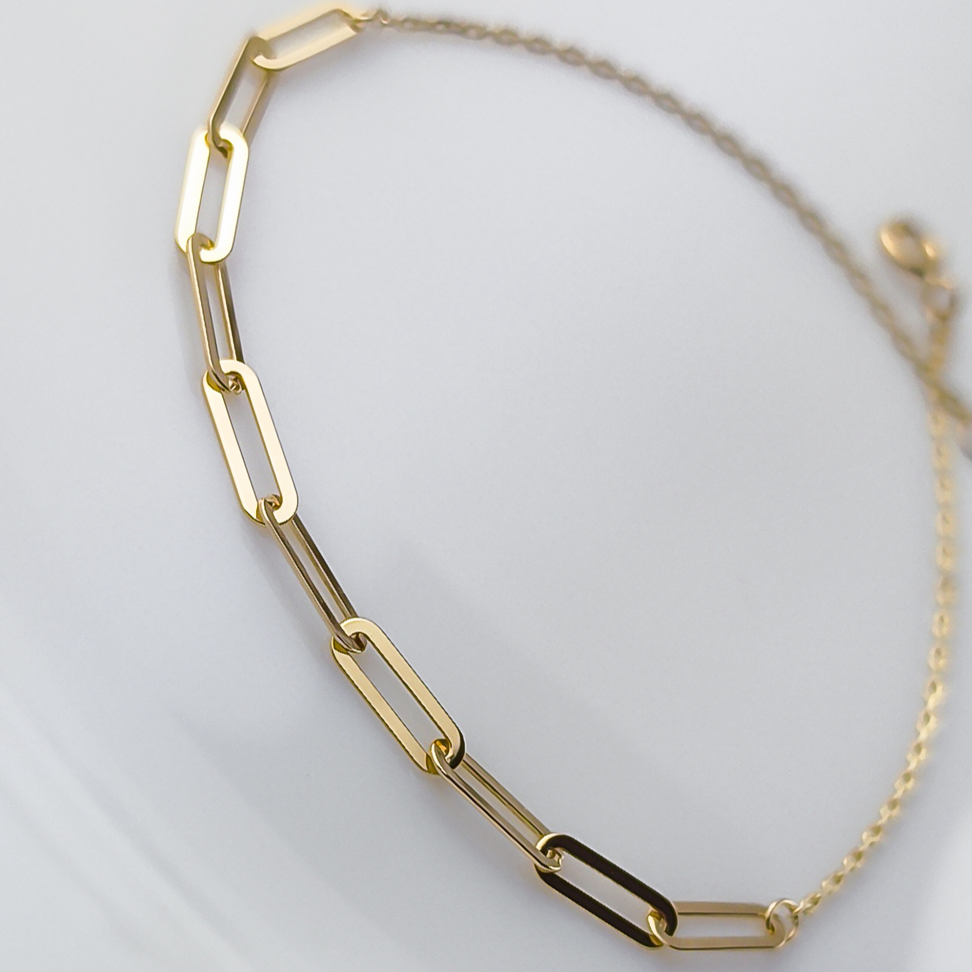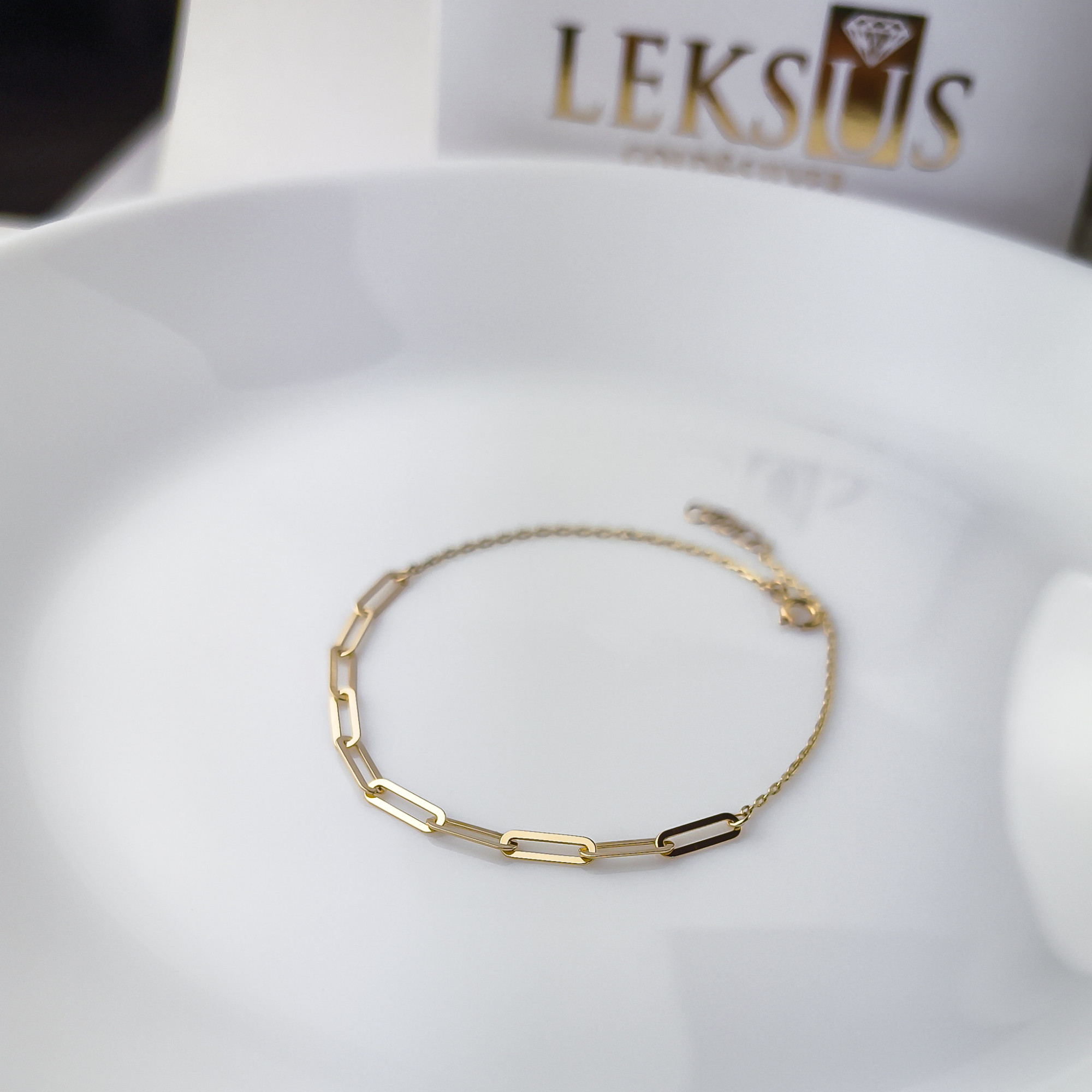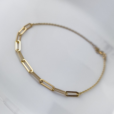 Splot ten charakteryzuje się wydłużonymi, prostokątnymi ogniwami, które nadają mu surowy, a jednocześnie niezwykle elegancki wygląd. To biżuteria, która „nie krzyczy”, ale zdecydowanie przyciąga wzrok swoją geometryczną formą. Dzięki otwartej strukturze ogniw, bransoletka wydaje się bardzo delikatna i lekka, co sprawia, że jest idealny do noszenia przez cały dzień.