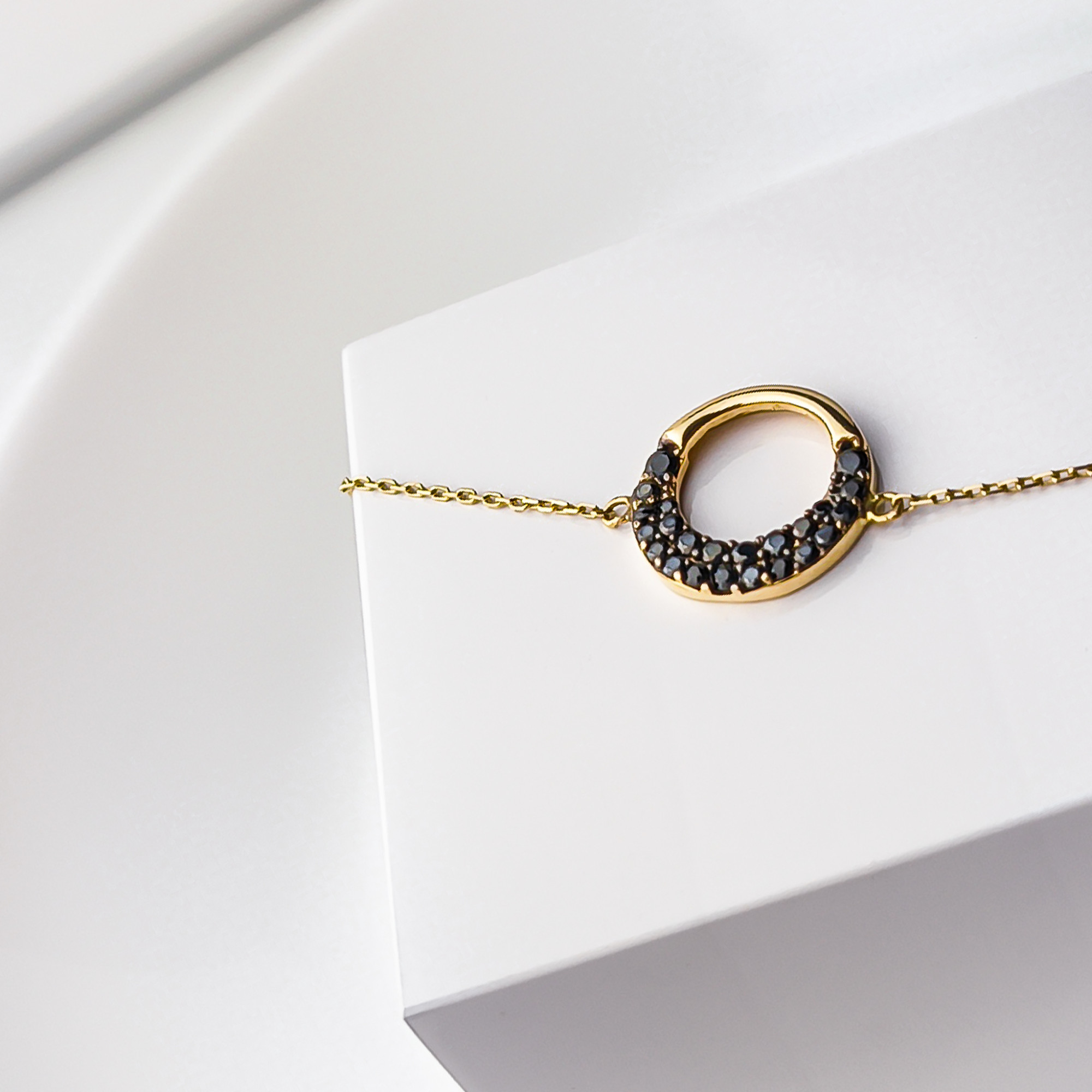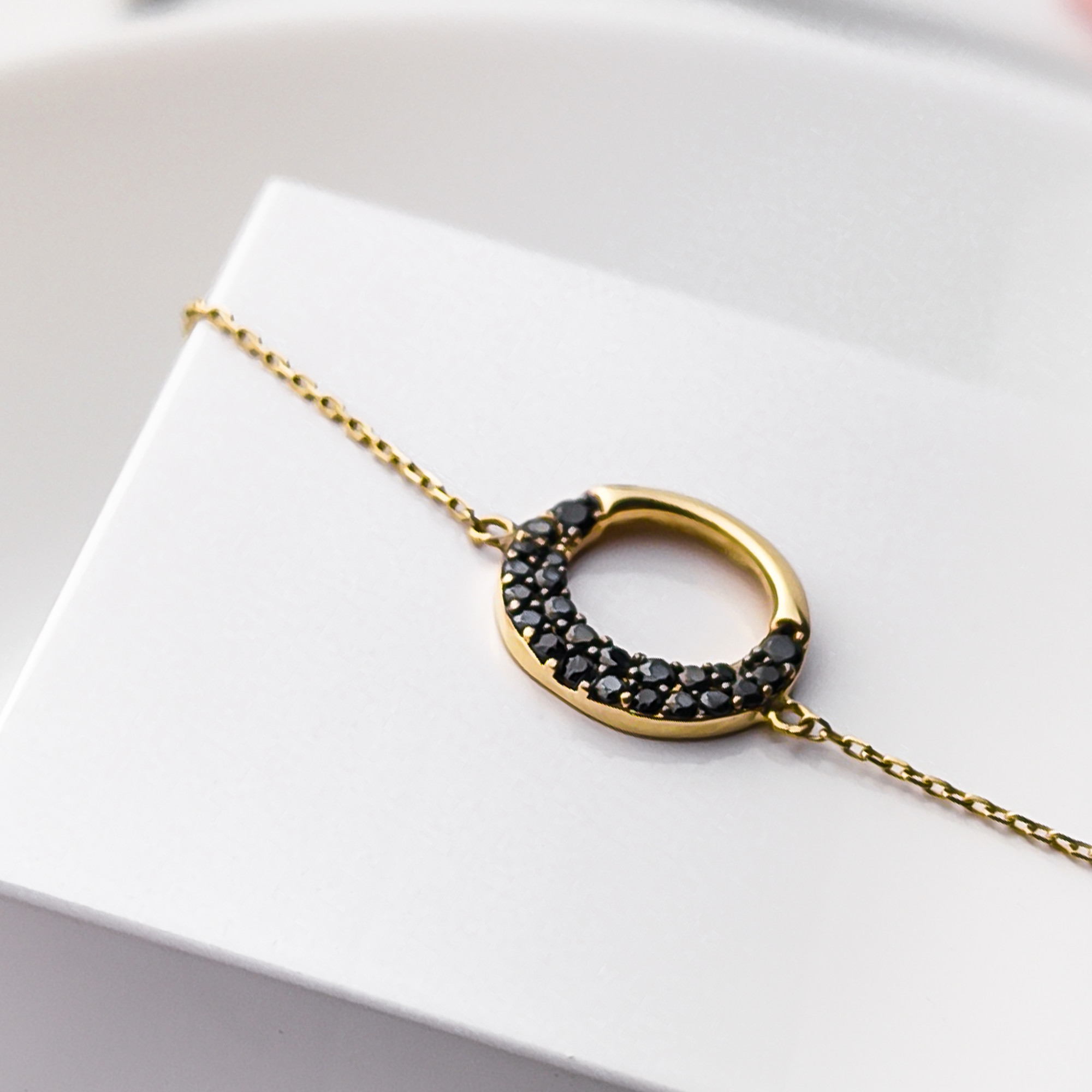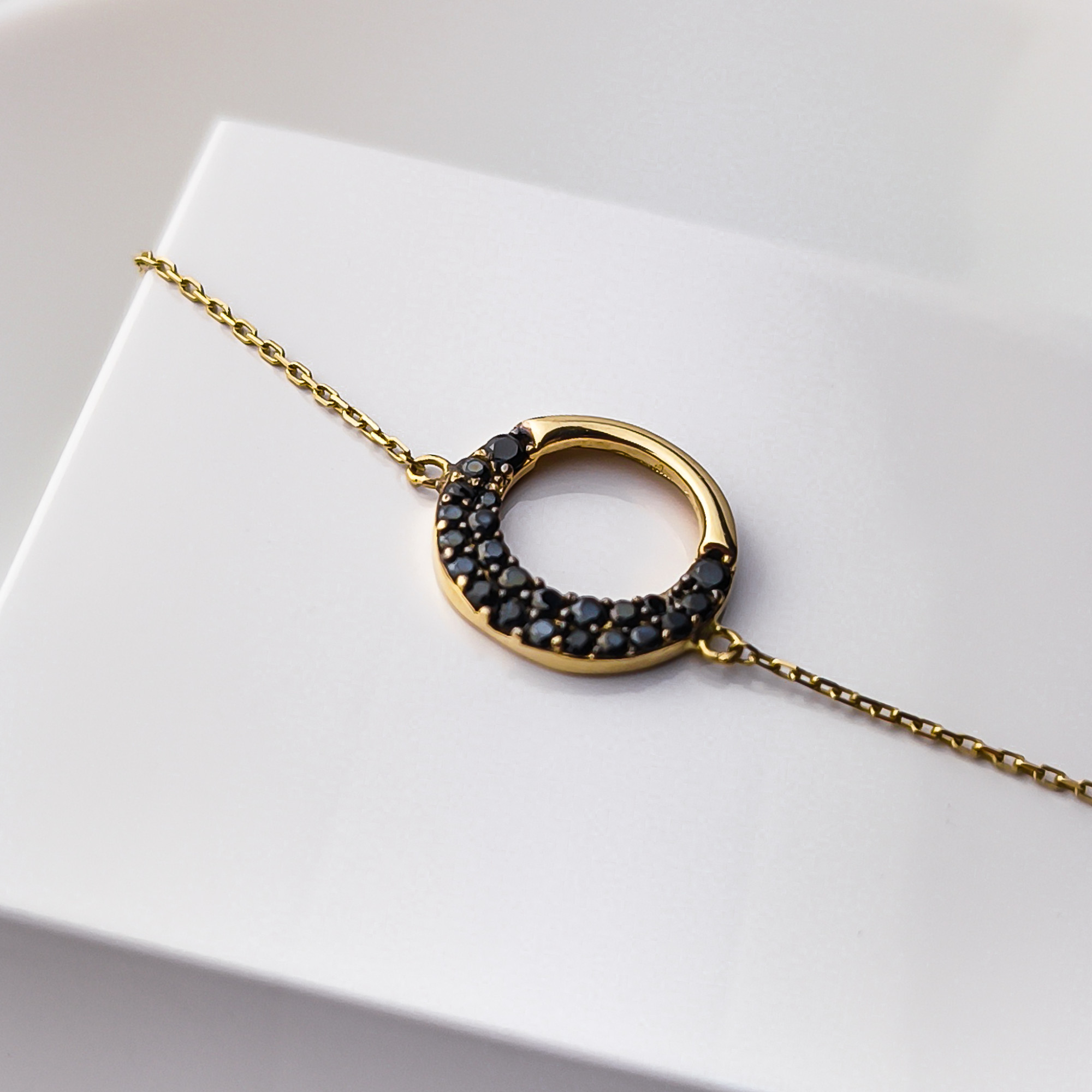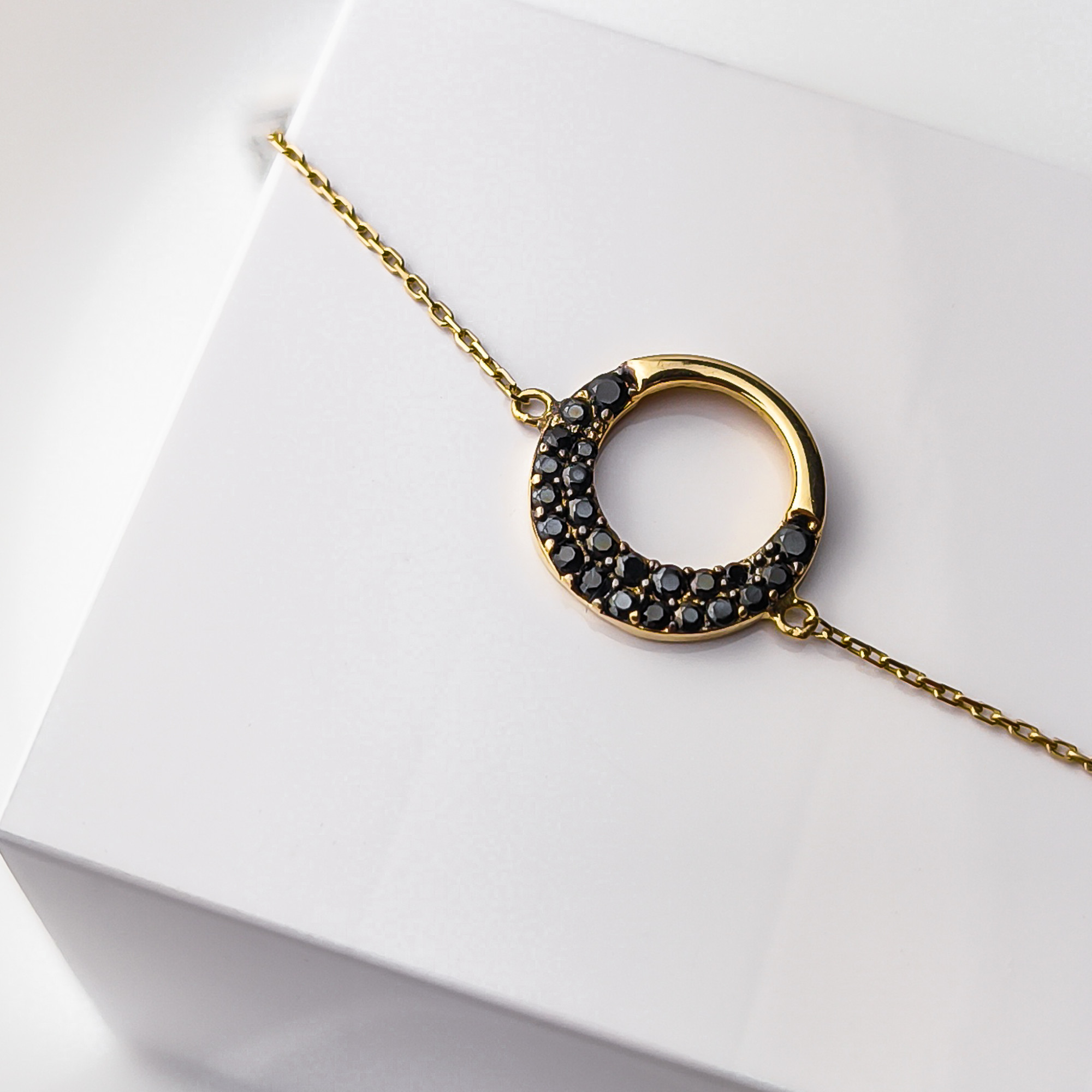 Złota bransoletka wysadzana wysokiej jakości czarnymi cyrkoniami. Bransoletka z pewnością przypadnie do gustu wielu miłośniczkom biżuterii i będzie idealnym dopełnieniem każdej stylizacji. Biżuteria zapakowana w nasze firmowe ozdobne pudełko będzie wspaniałym prezentem.