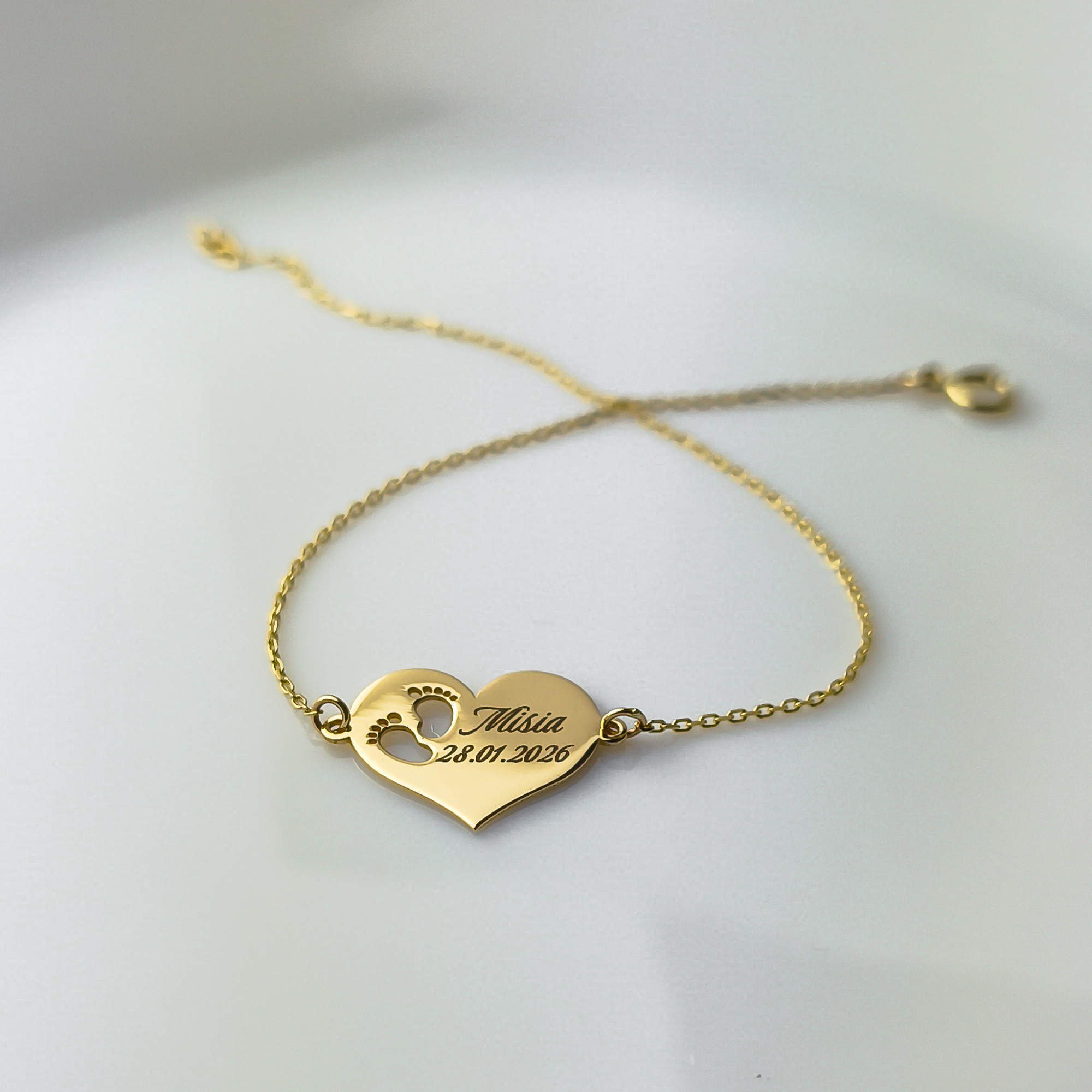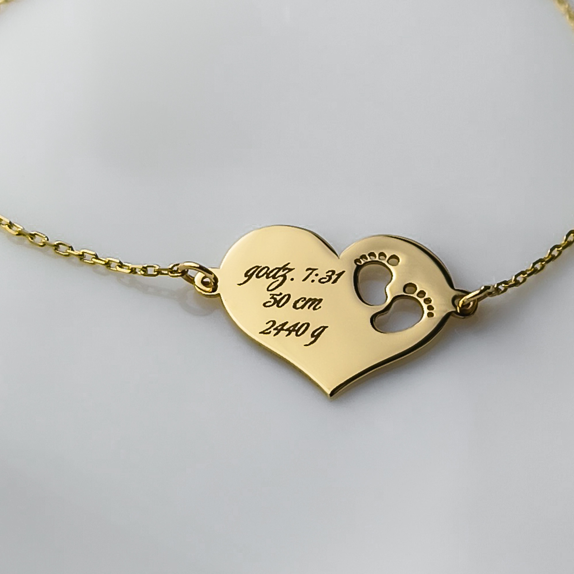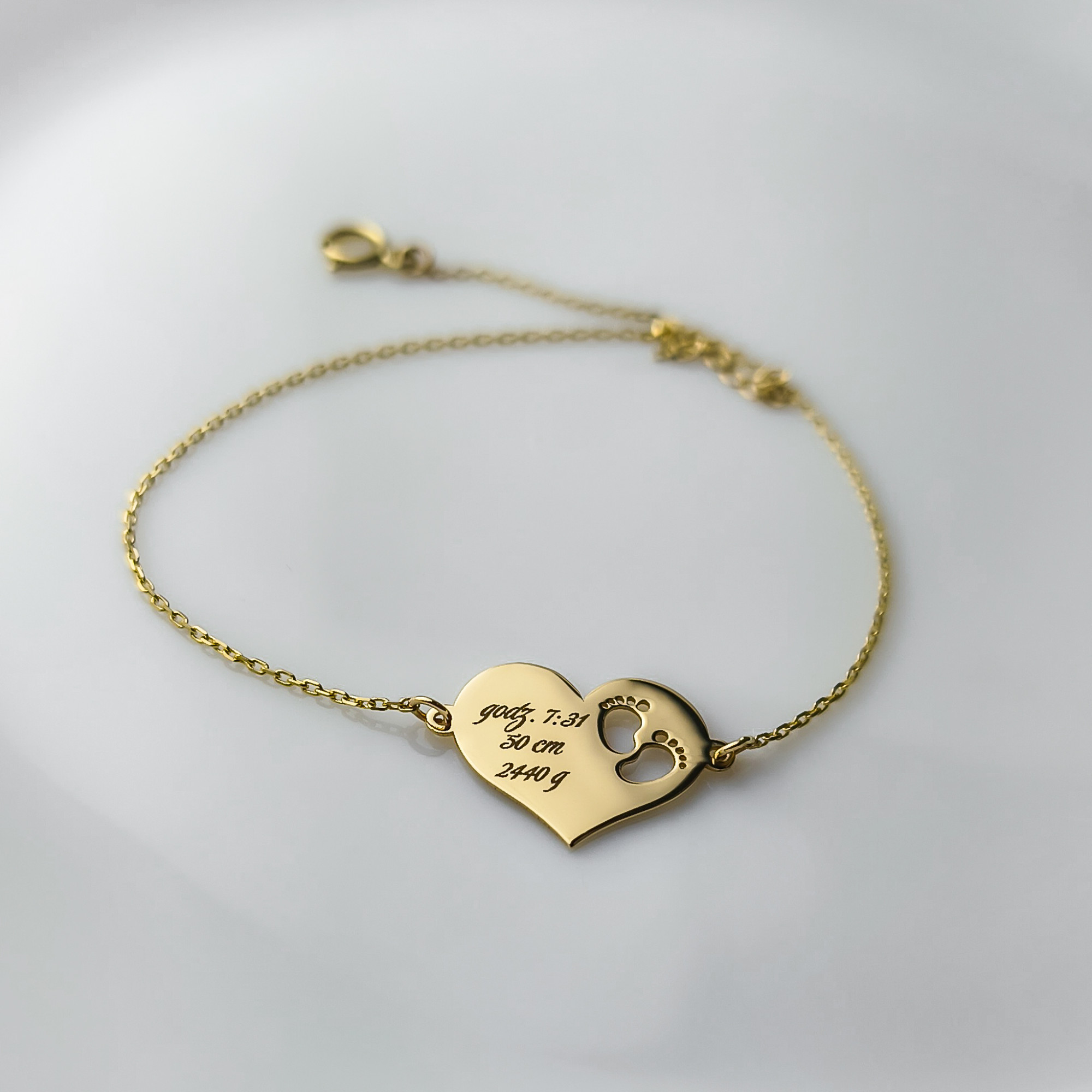 Złota bransoletka z Sercem i stópkami z możliwością graweru - pr. 585