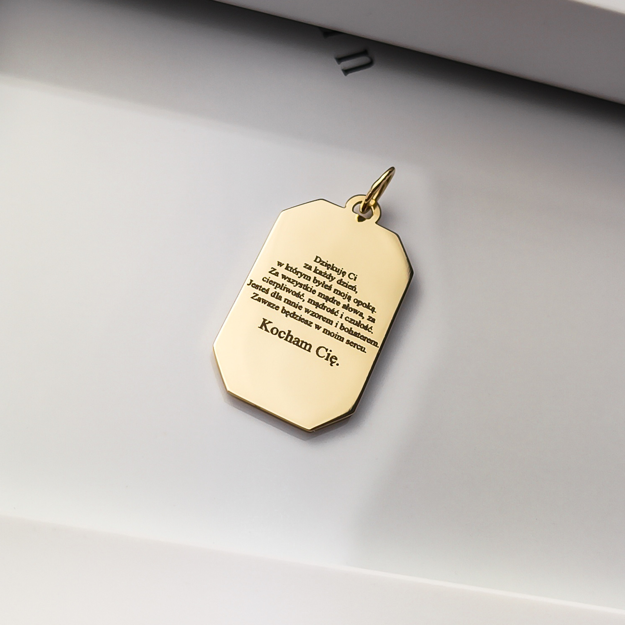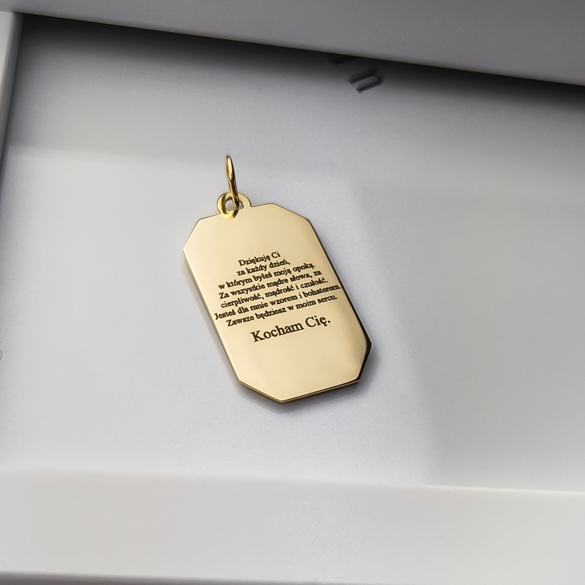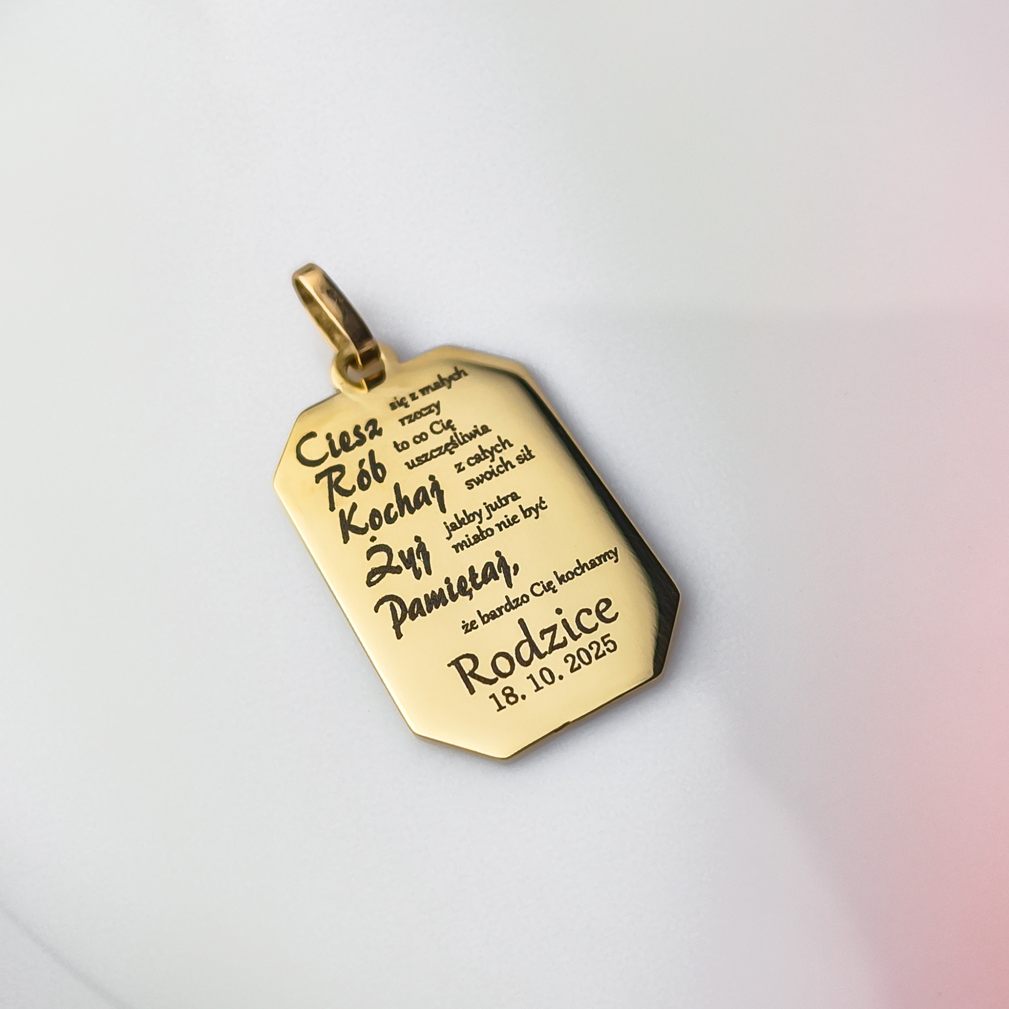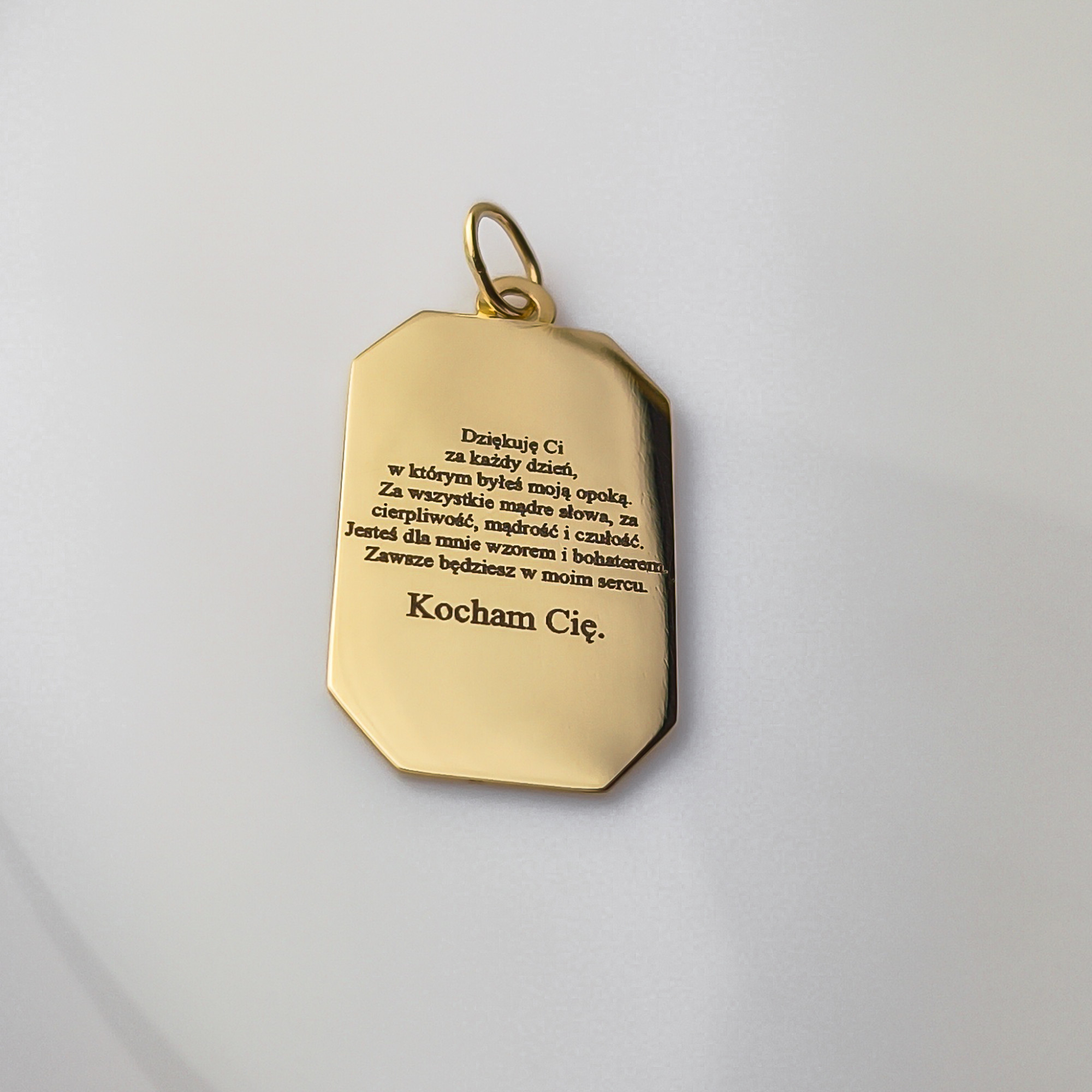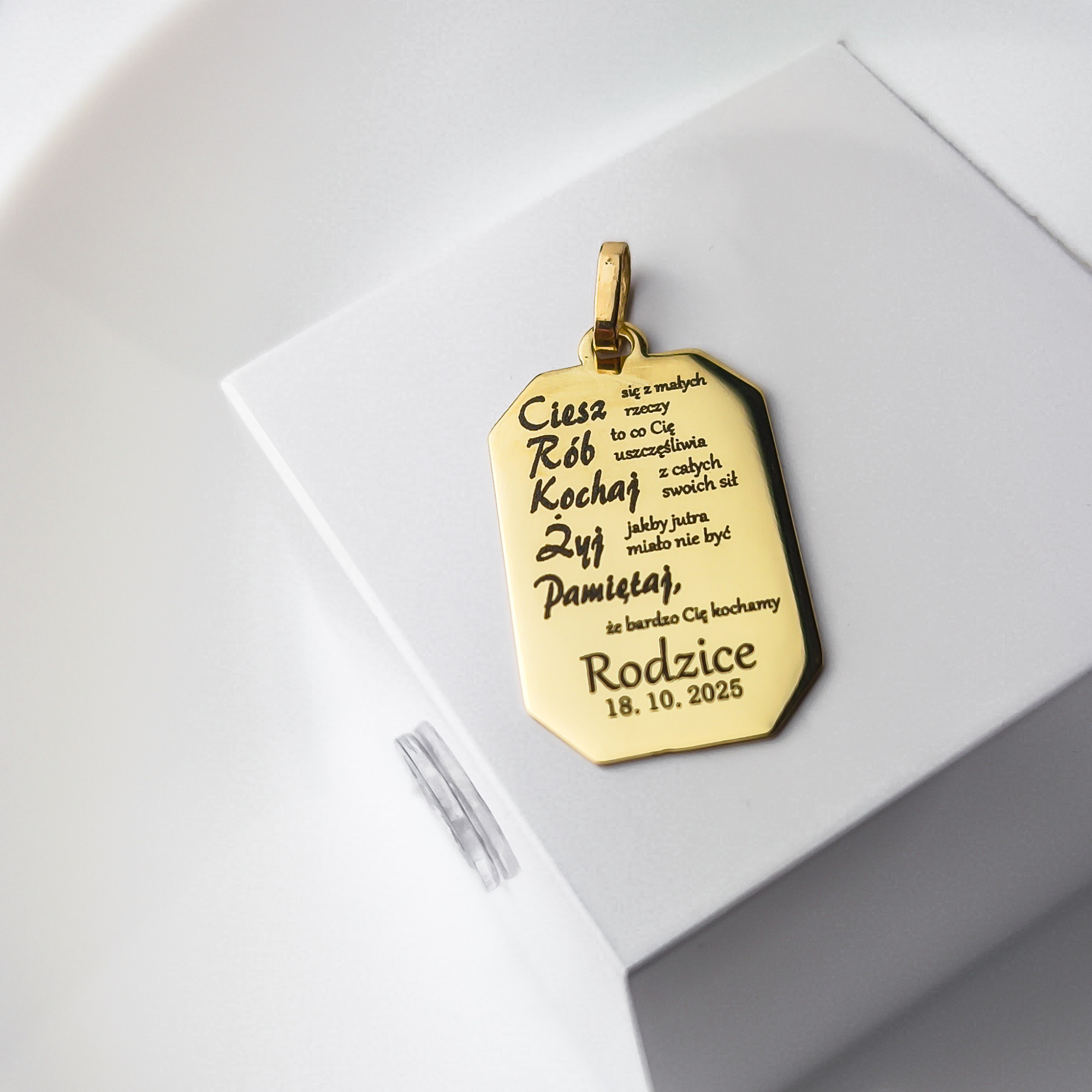 Złota zawieszka idealna pod grawer. Doskonały pomysł na oryginalny prezent. Zawieszka, na której mamy możliwość stworzenia graweru tekstowego lub ze zdjęcia. Wystarczy przesłać do nas zdjęcie w formacie JPG lub PNG - najlepiej SMS - 507080140 lub e-mail - leksusgold@leksusgold.pl lub za pośrednictwem messengera. Zdjęcie może być w kolorze - wykonane telefonem. Wykonujemy grawery tekstowe, graficzne i ze zdjęć.