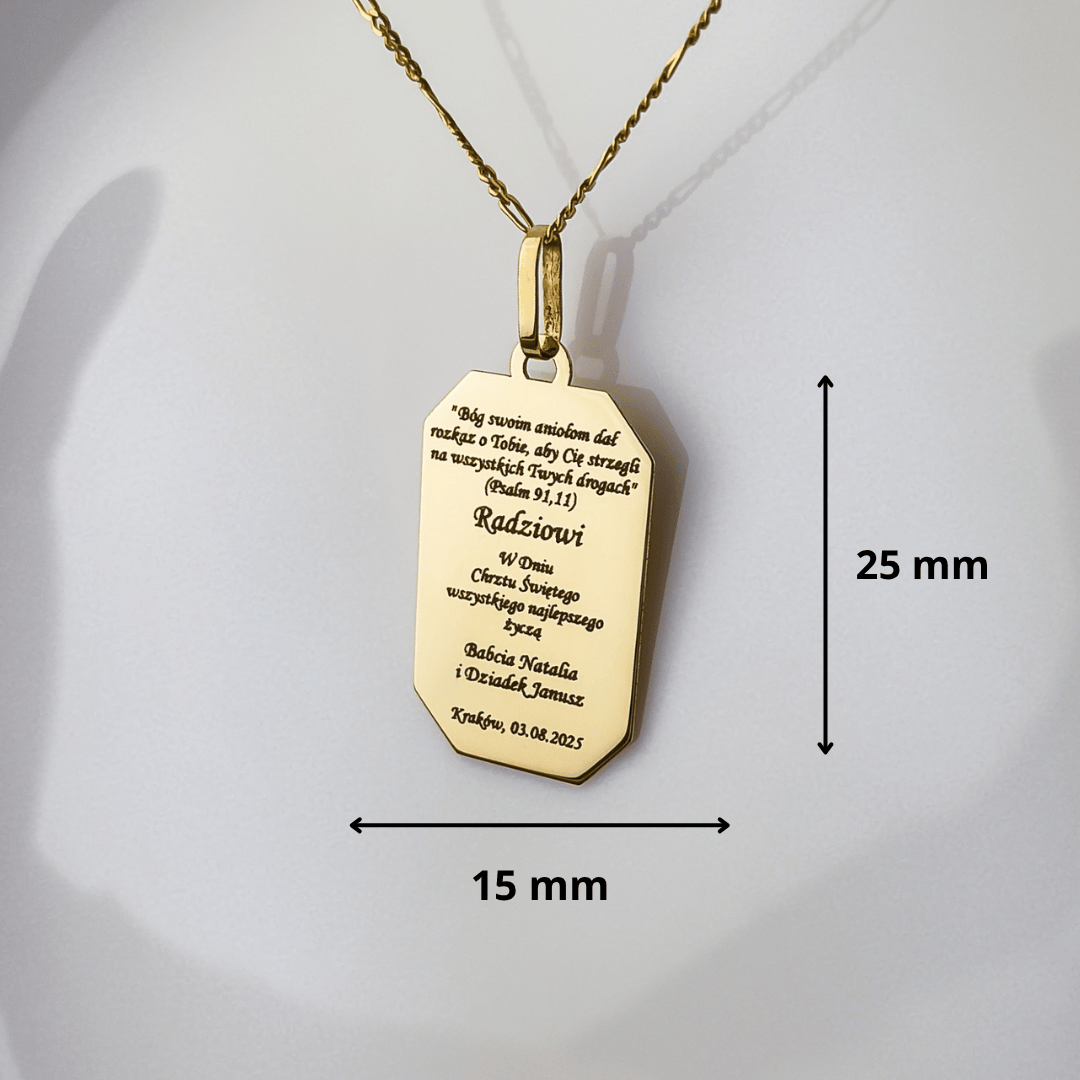 Zawieszka wykonana ze złota próby 585 dzięki czemu wiadomo, że będzie to produkt najwyższej jakości. To doskonały tradycyjny pomysł na prezent z okazji przyjęcia Chrztu Świętego, Komunii Świętej albo Bierzmowania lub innej uroczystości. Pięknie zapakowany w nasze firmowe pudełko będzie niespodzanką dla każdego. Dodatkowo mamy możliwość wykonania graweru na blaszce i umieszczeniu jej w pudełku. Zmiany w dedykacji dotyczą tekstu zaznaczonego kolorem czerwonym. W polu "tekst graweru" lub "wiadomości do sprzedającego" należy umieścić słowa zgodne z twoją dedykacją. Skorzystaj z naszych wzorów lub stwórz własny oryginalny tekst graweru - usługa GRATIS.