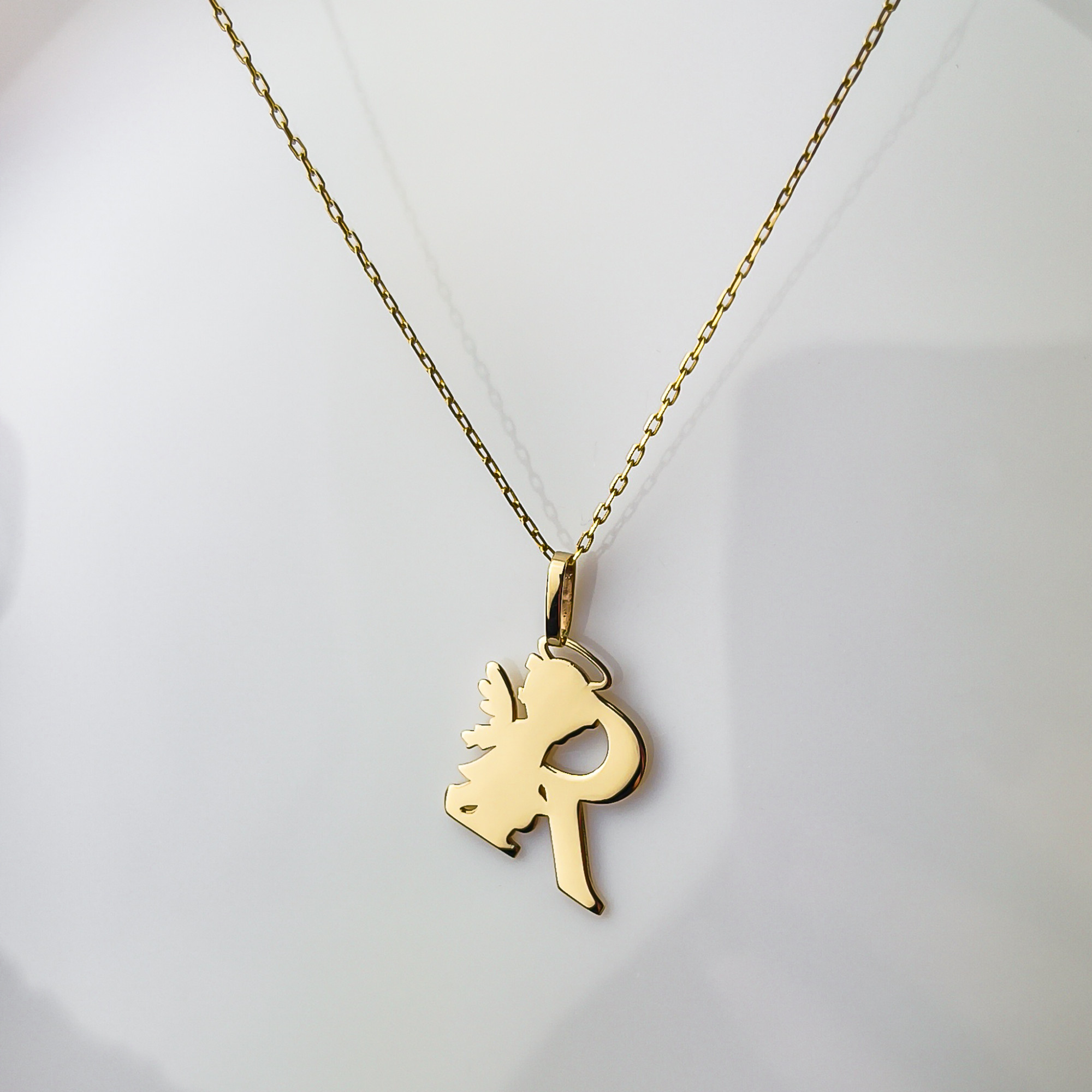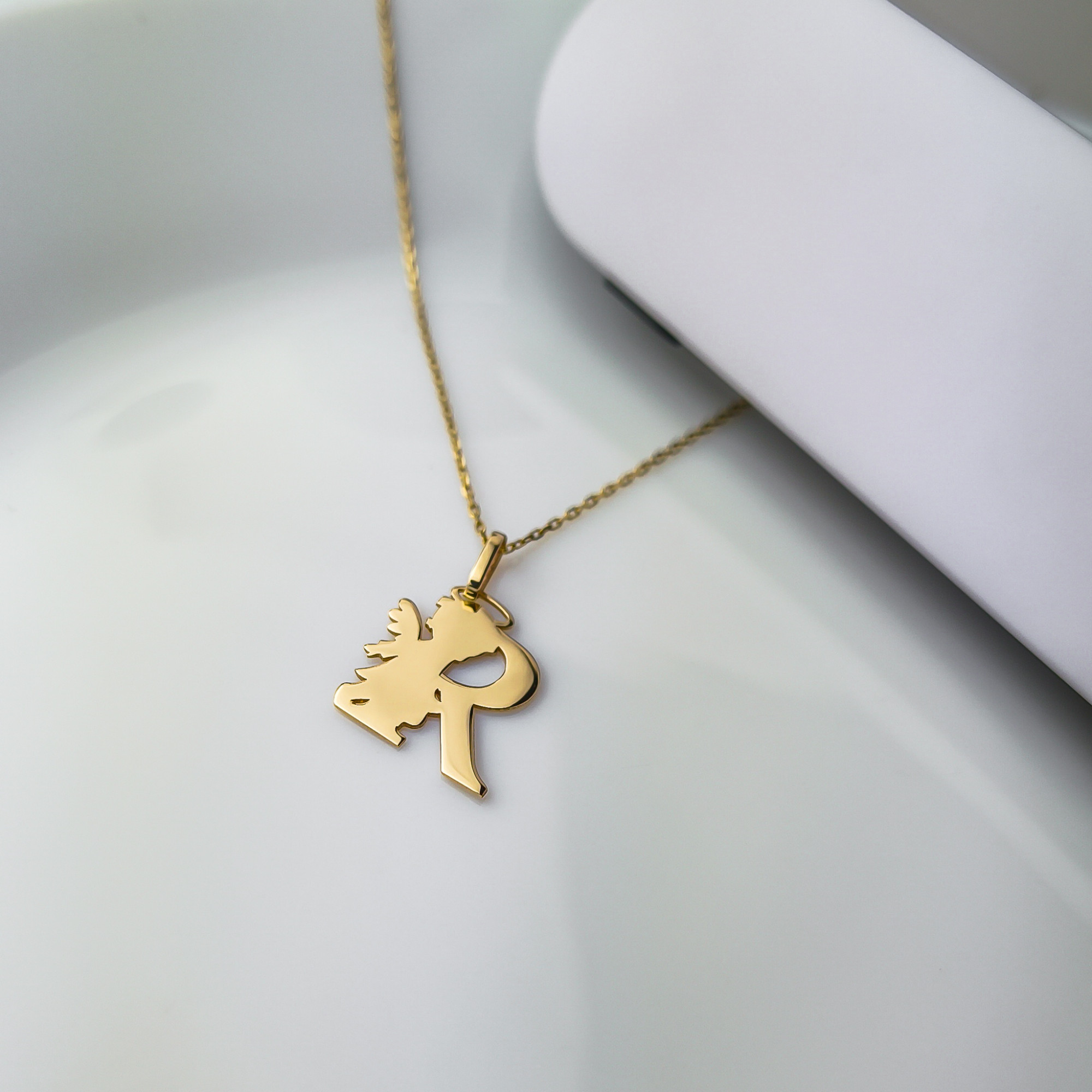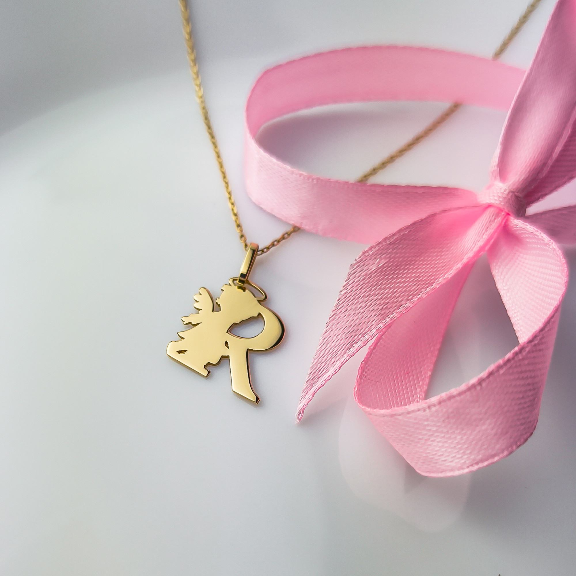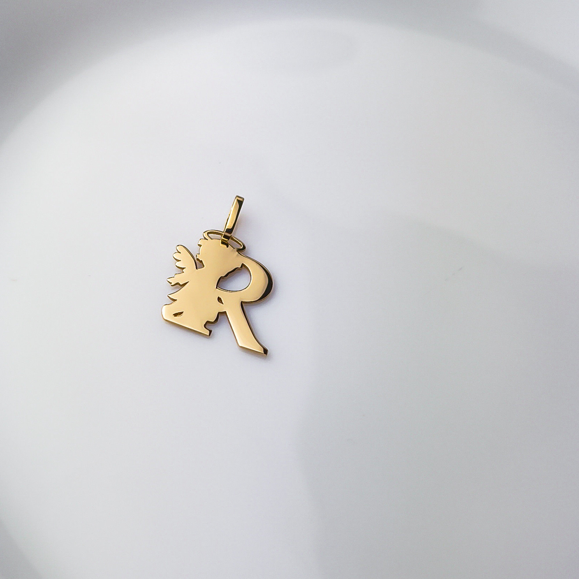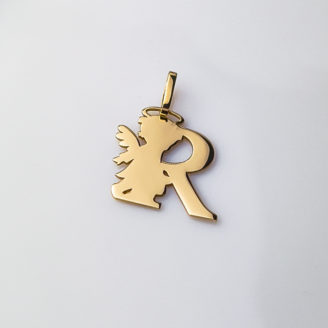 Zawieszka przedstawia literę R, obok której umieszczona jest subtelna sylwetka aniołka, czuwającego nad swoim podopiecznym. To idealny sposób, by nosić blisko serca inicjał ukochanej osoby, dziecka, lub swój własny, z dodatkowym przesłaniem o opiece, błogosławieństwie i obecności anioła stróża.