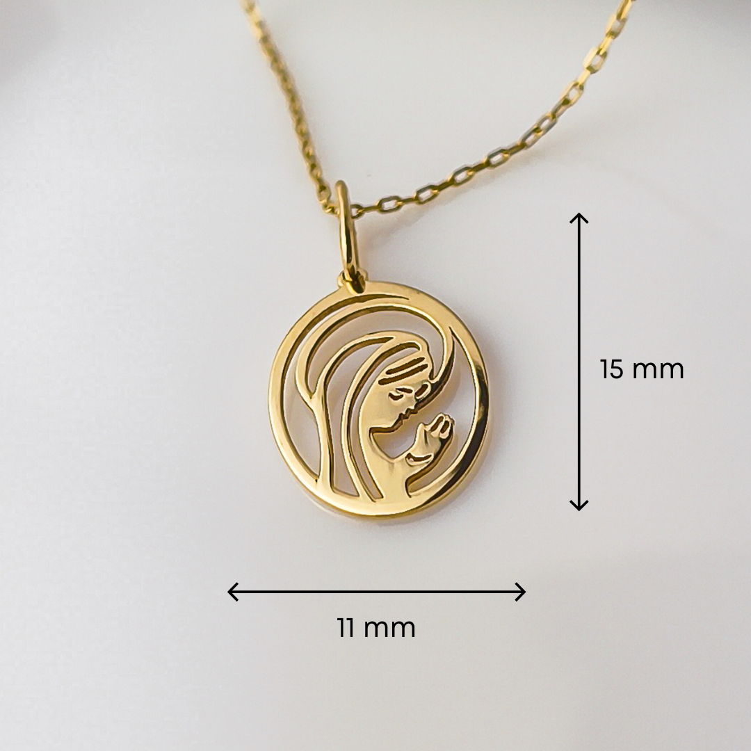 Ta delikatna, ażurowa zawieszka to nowoczesna interpretacja klasycznego symbolu. Minimalistyczny wizerunek Matki Boskiej otoczony subtelnym okręgiem jest wyrazem głębokiej wiary, opieki i miłości.