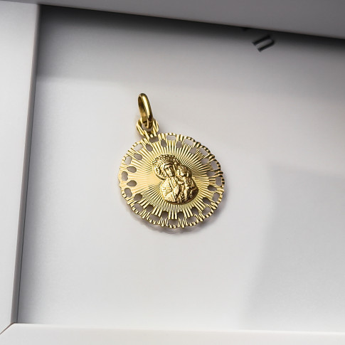 Złota zawieszka z wizerunkiem Matki Boskiej Częstochowskiej wykonana ze złota próby 585. Delikatny wzór o zaokrąglonych kształtach - to doskonały tradycyjny pomysł na prezent z okazji przyjęcia każdego z sakramentów i nie tylko. Na zawieszcze możemy umieścić grawer - tekst dowolny. Dodatkowo mamy możliwość wykonania graweru na blaszce i umieszczeniu jej w pudełku. Skorzystaj z naszych wzorów lub stwórz własny oryginalny tekst graweru - usługa GRATIS.