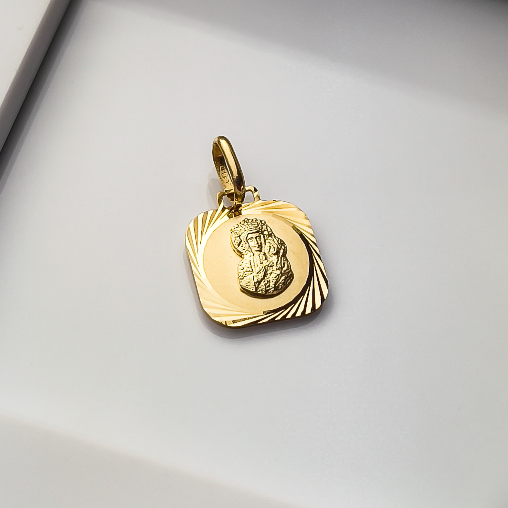 Złota zawieszka z wizerunkiem Matki Boskiej Częstochowskiej wykonana ze złota próby 585. Delikatny wzór o zaokrąglonych kształtach - to doskonały tradycyjny pomysł na prezent z okazji przyjęcia każdego z sakramentów i nie tylko. Na zawieszcze możemy umieścić grawer - tekst dowolny. Dodatkowo mamy możliwość wykonania graweru na blaszce i umieszczeniu jej w pudełku. Skorzystaj z naszych wzorów lub stwórz własny oryginalny tekst graweru - usługa GRATIS.