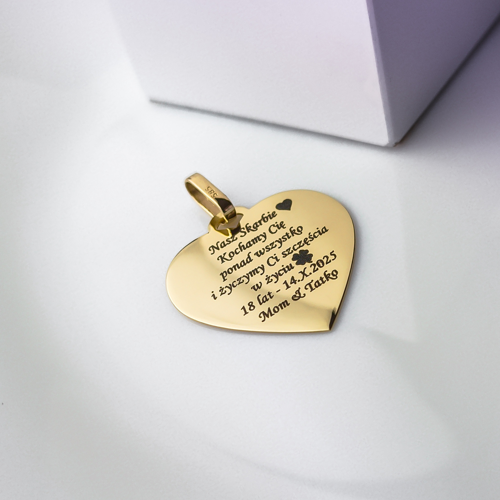 Zawieszka wykonana ze złota o próbie 585 charakteryzuje się perfekcyjnym wykończeniem z dbałością o szczegóły. Jej unikatowy styl podkreśli każdą stylizację, zarówno elegancką sukienkę założoną na wyjątkową okazję, jak i klasyczny zestaw koszuli i spodni. Biżuteria zapakowana w ozdobne pudełeczko będzie wspaniałym prezentem. Dodatkowo mamy możliwość wykonania graweru na blaszce i umieszczeniu jej w pudełku. Skorzystaj z naszych wzorów lub stwórz własny oryginalny tekst graweru - usługa GRATIS.