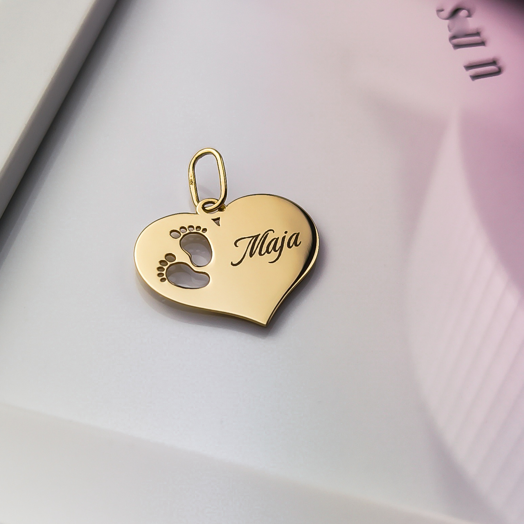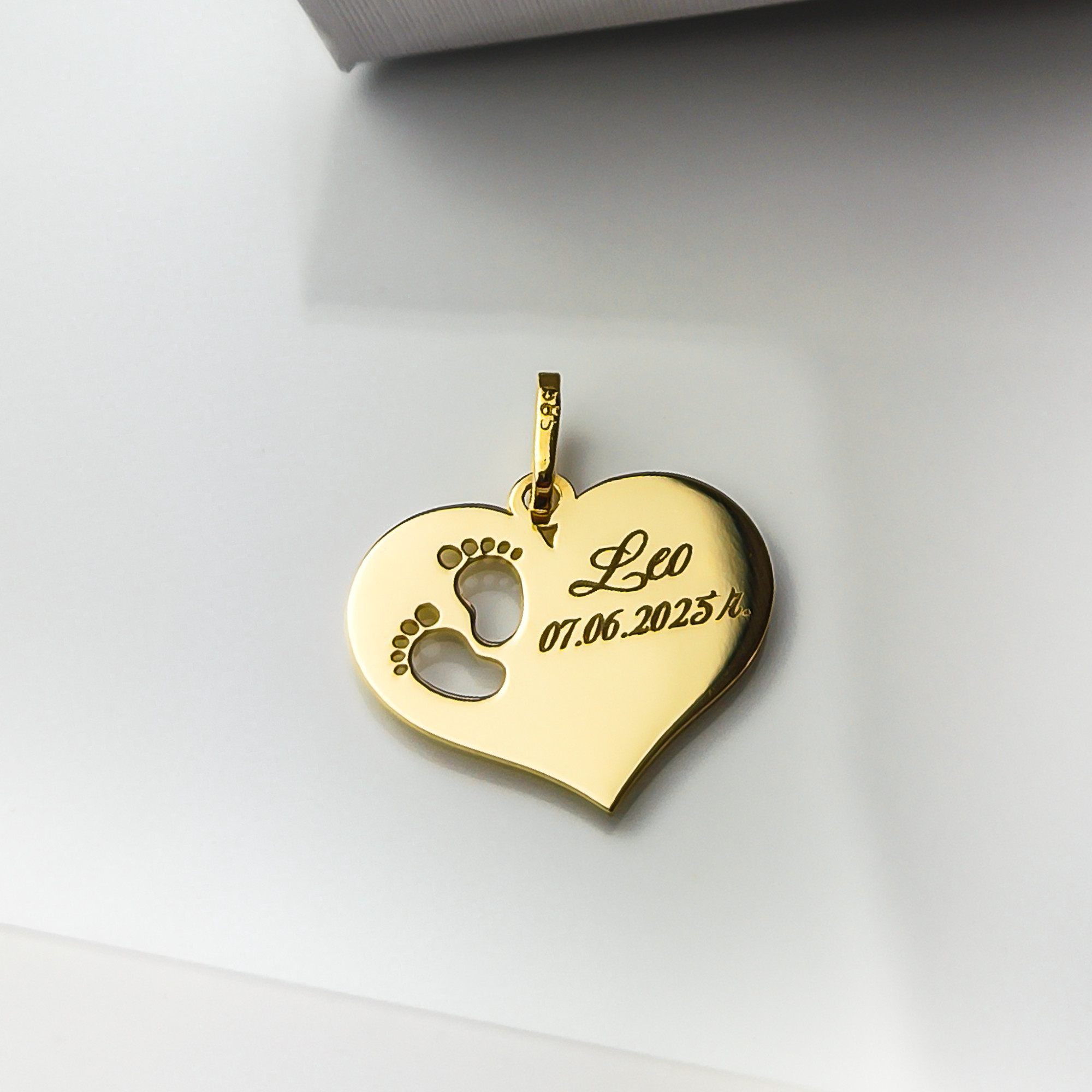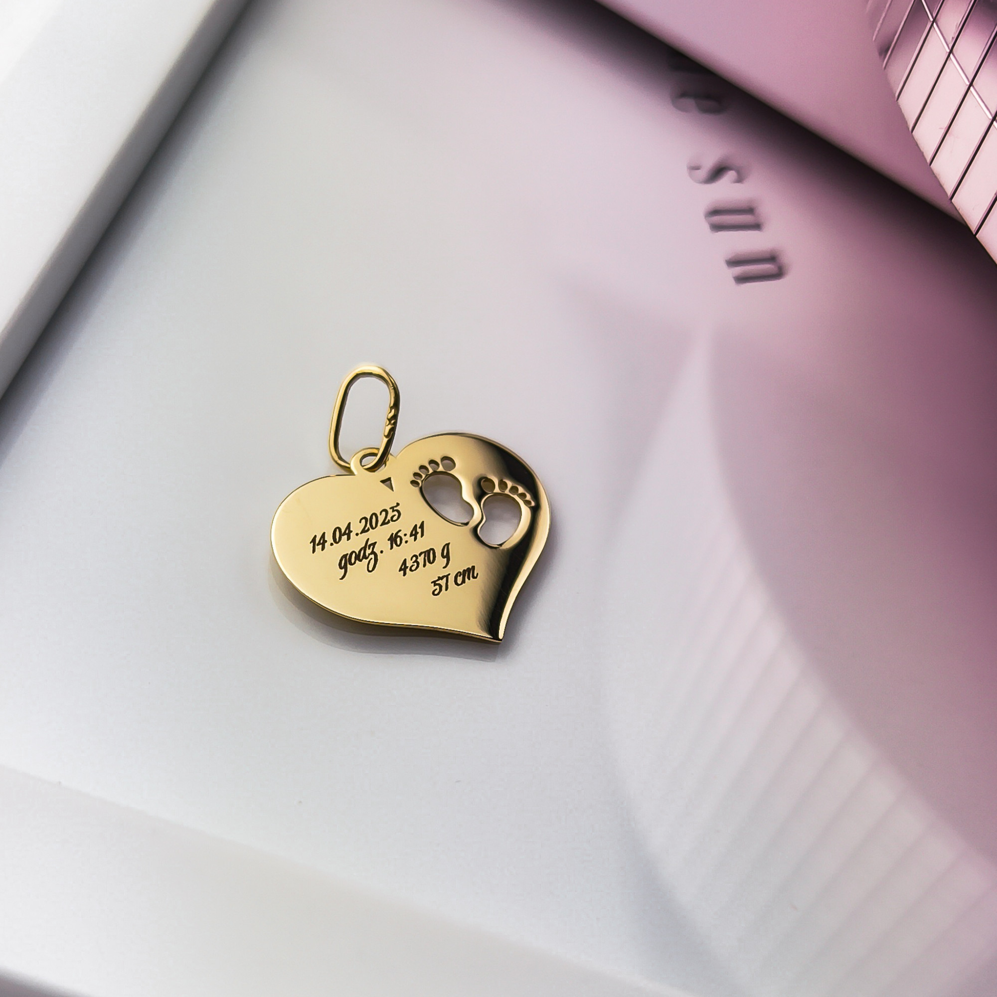 Złota zawieszka w kształcie serca z wyciętymi stópkami. Wykonana z wysokiej jakości złota, idealna na prezent dla mamy lub przyszłej mamy. Zawieszka, która pasuje do wszystkiego!