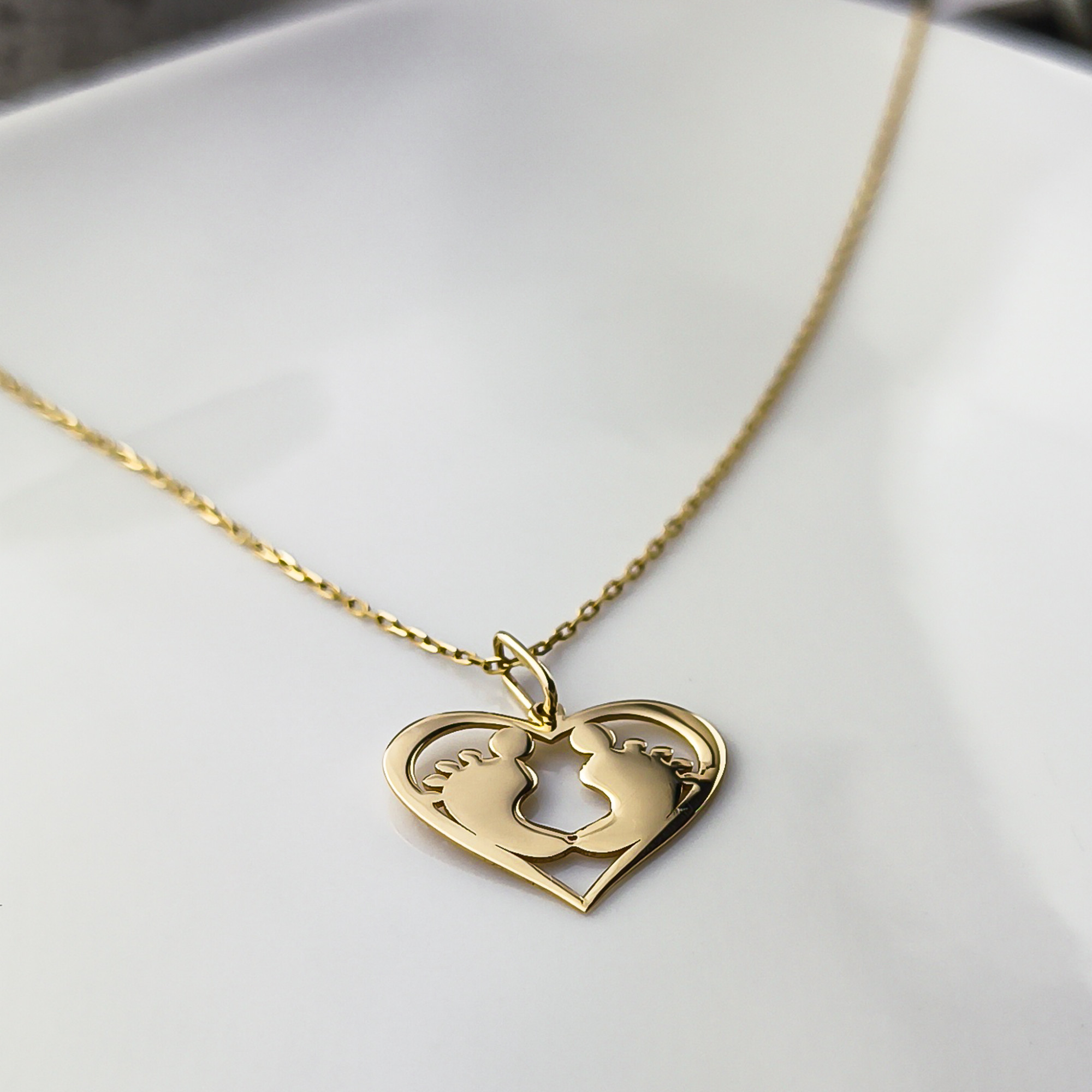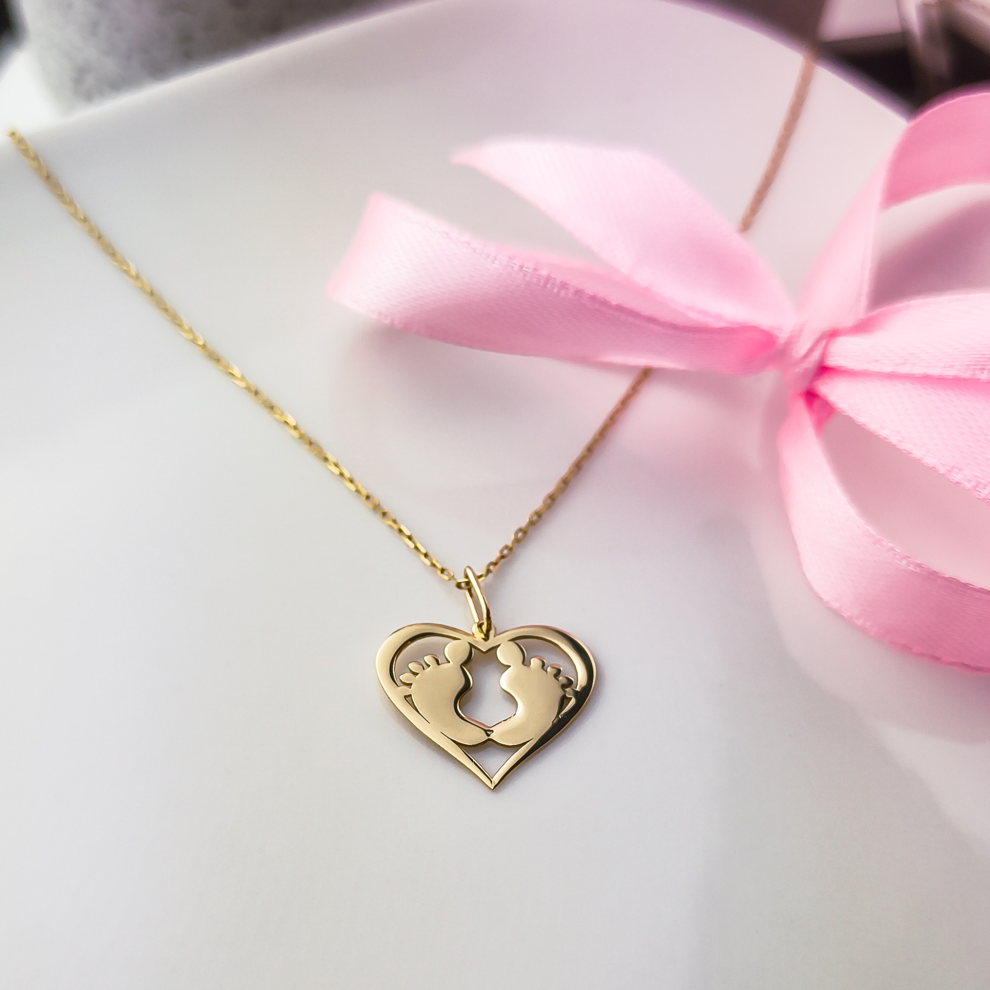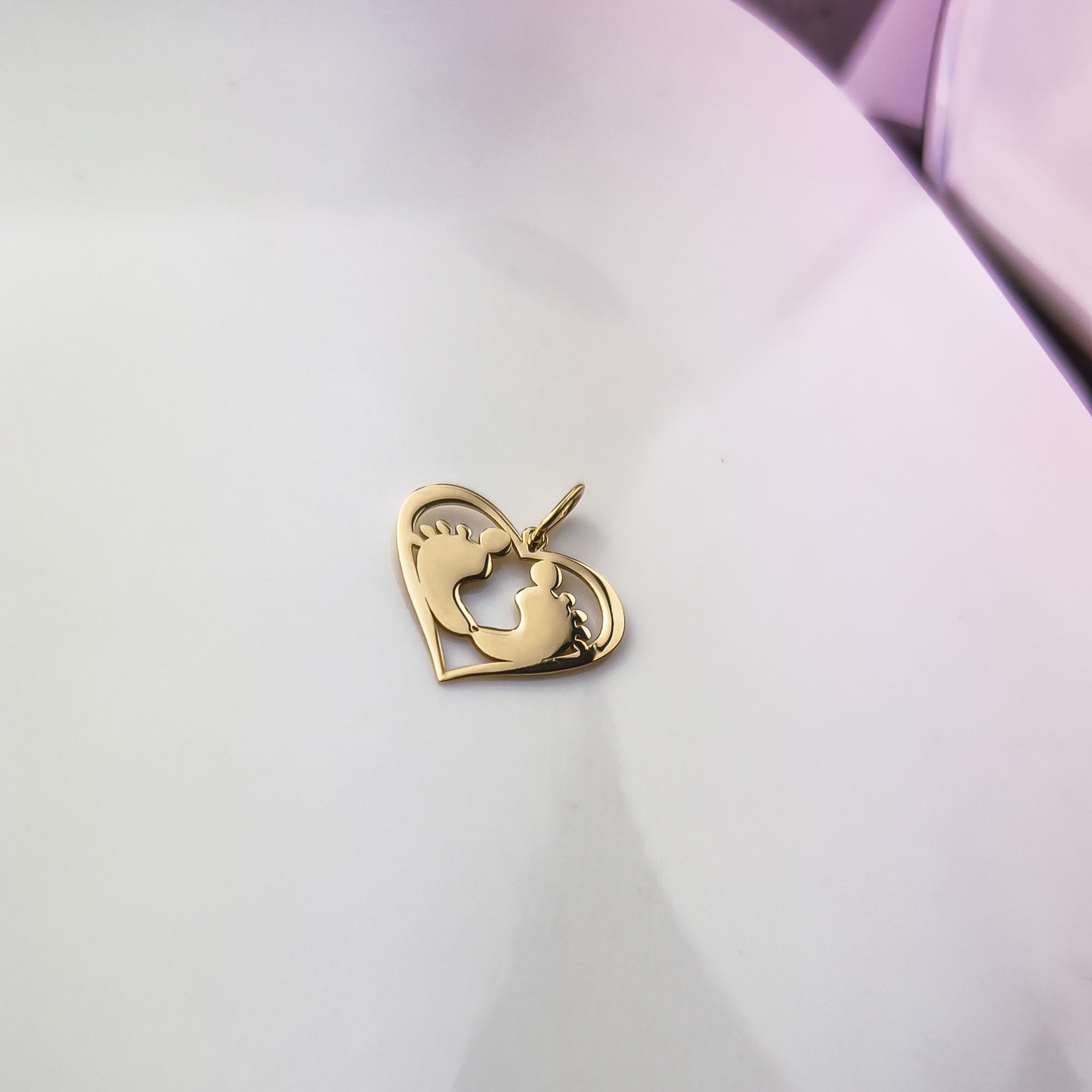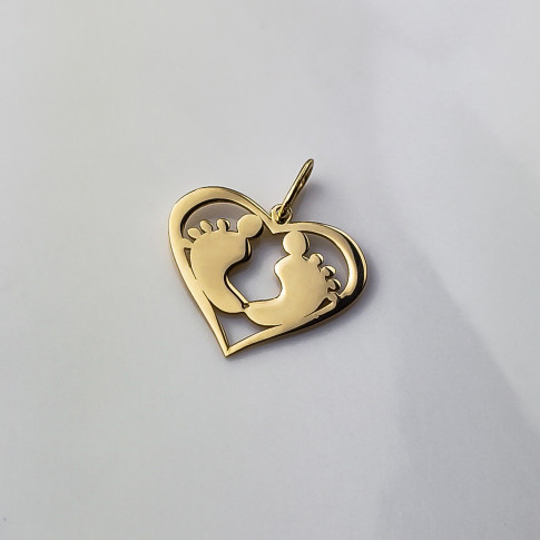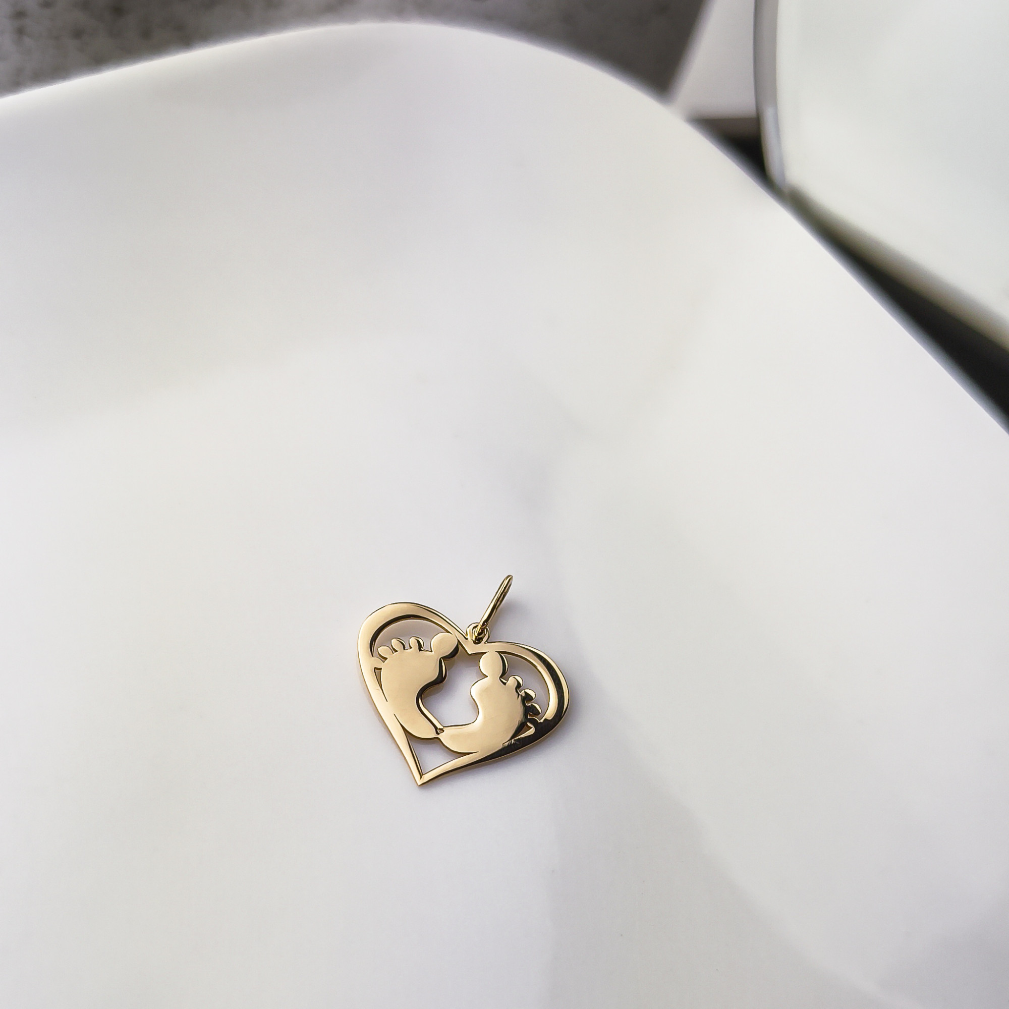 Złota zawieszka w kształcie serca z wyciętymi stópkami. Wykonana z wysokiej jakości złota, idealna na prezent dla mamy lub przyszłej mamy. Zawieszka, która pasuje do wszystkiego!