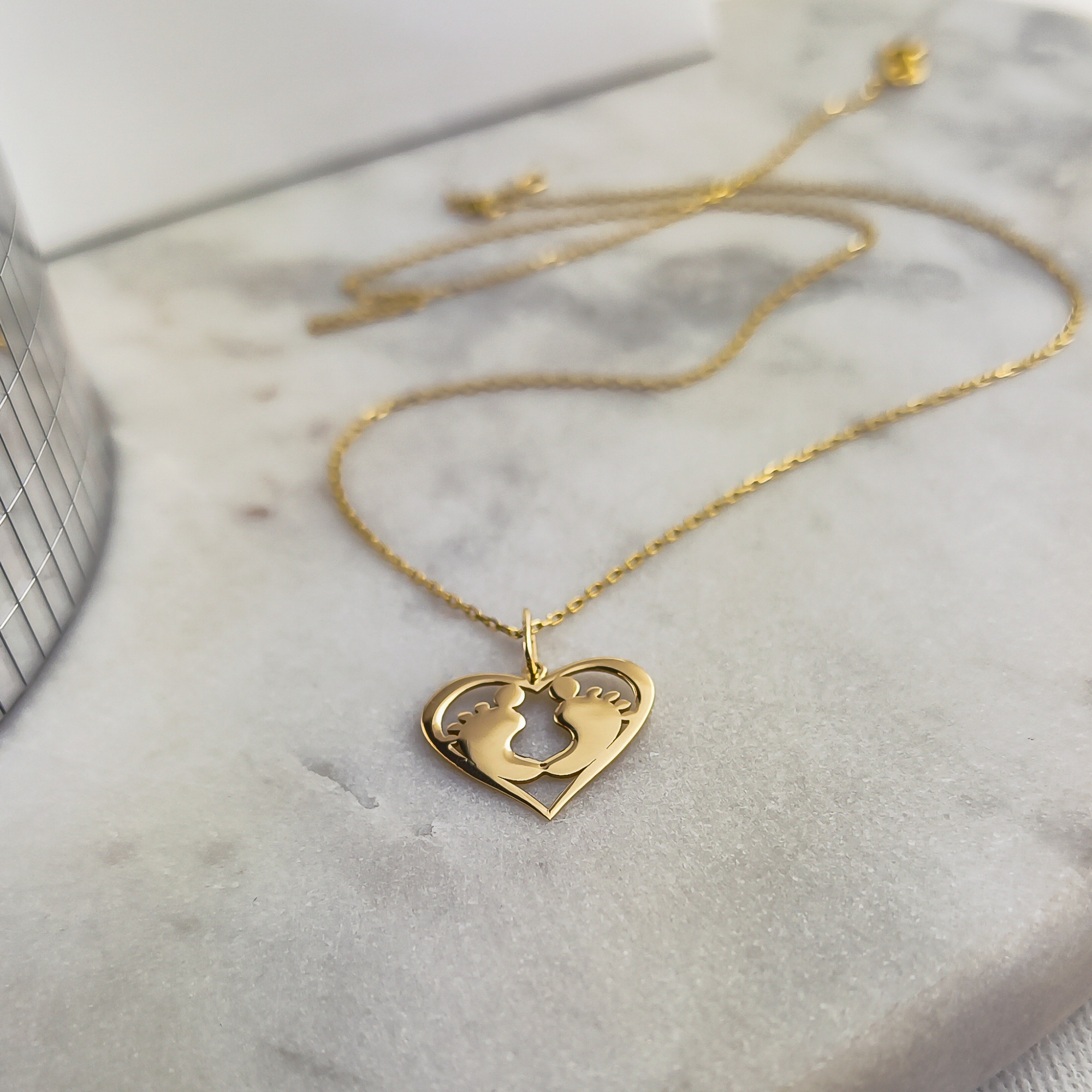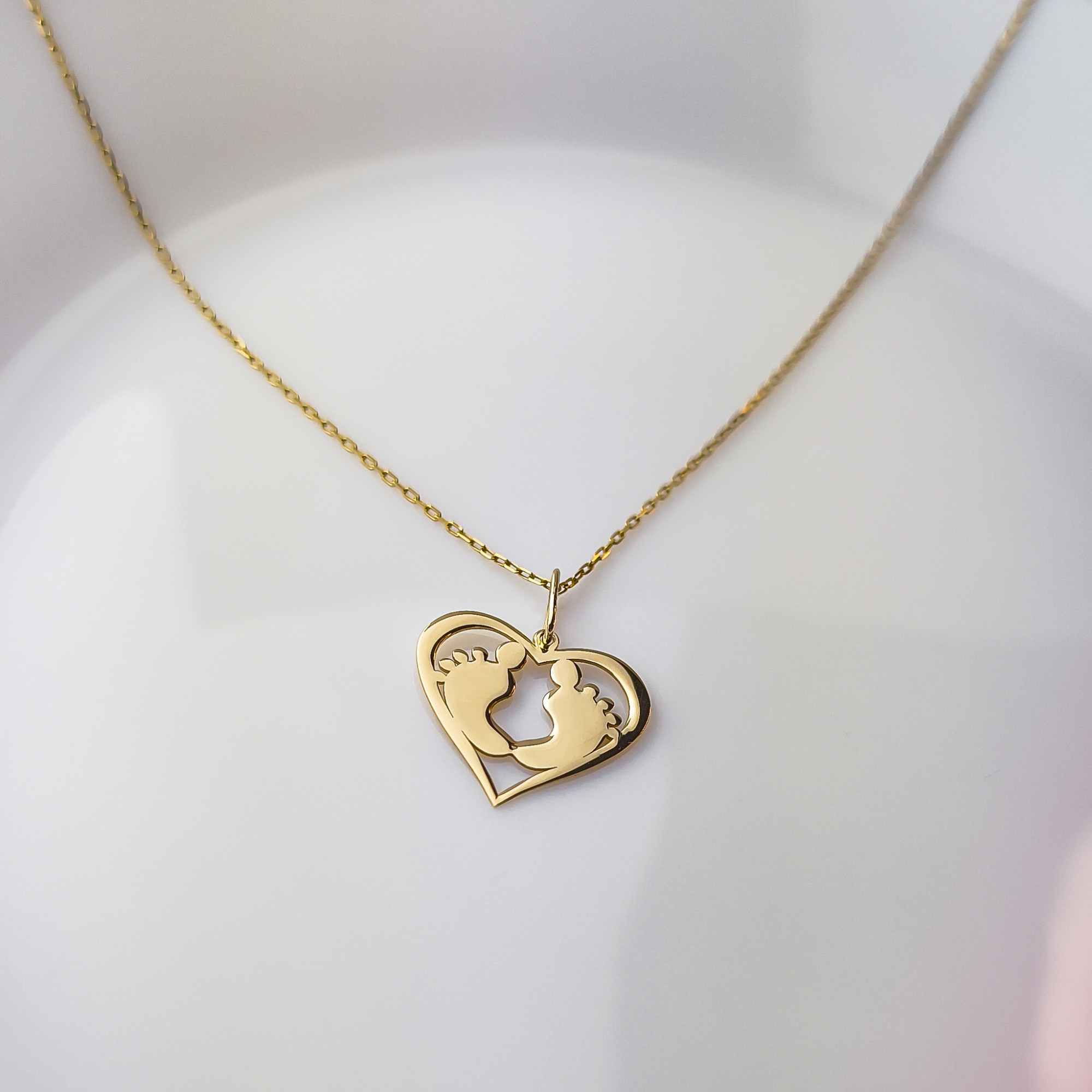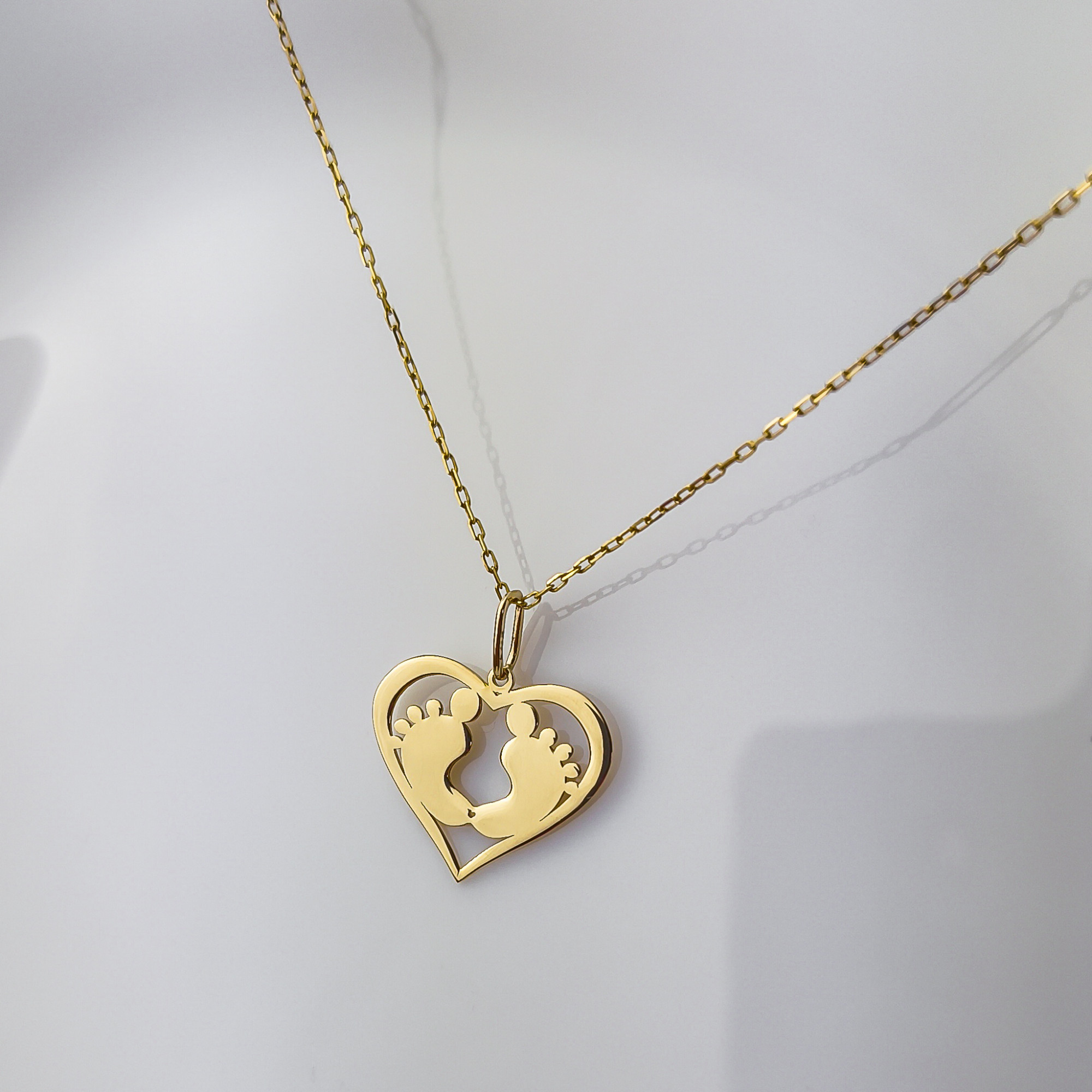 Złota zawieszka w kształcie serca z wyciętymi stópkami. Wykonana z wysokiej jakości złota, idealna na prezent dla mamy lub przyszłej mamy. Zawieszka, która pasuje do wszystkiego!