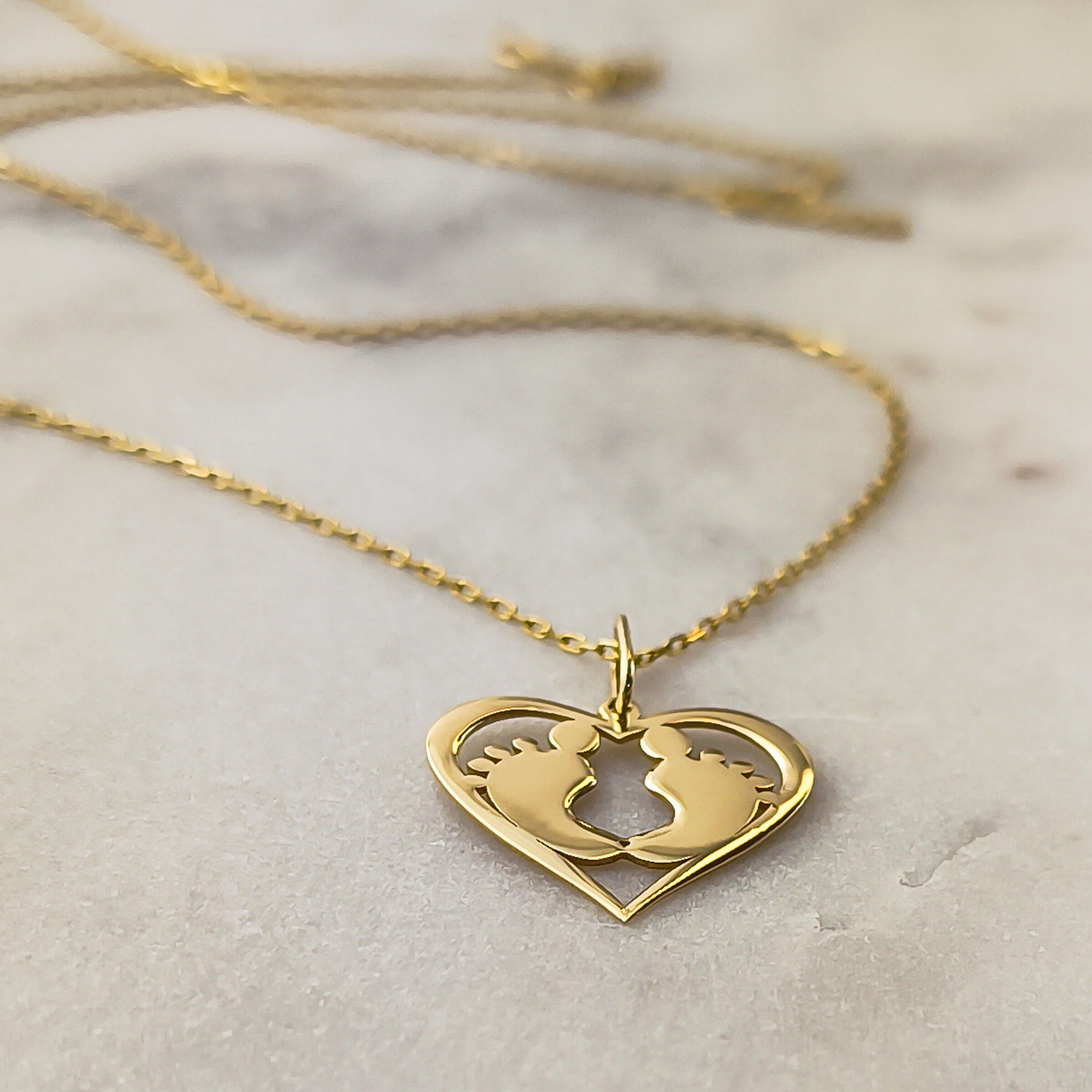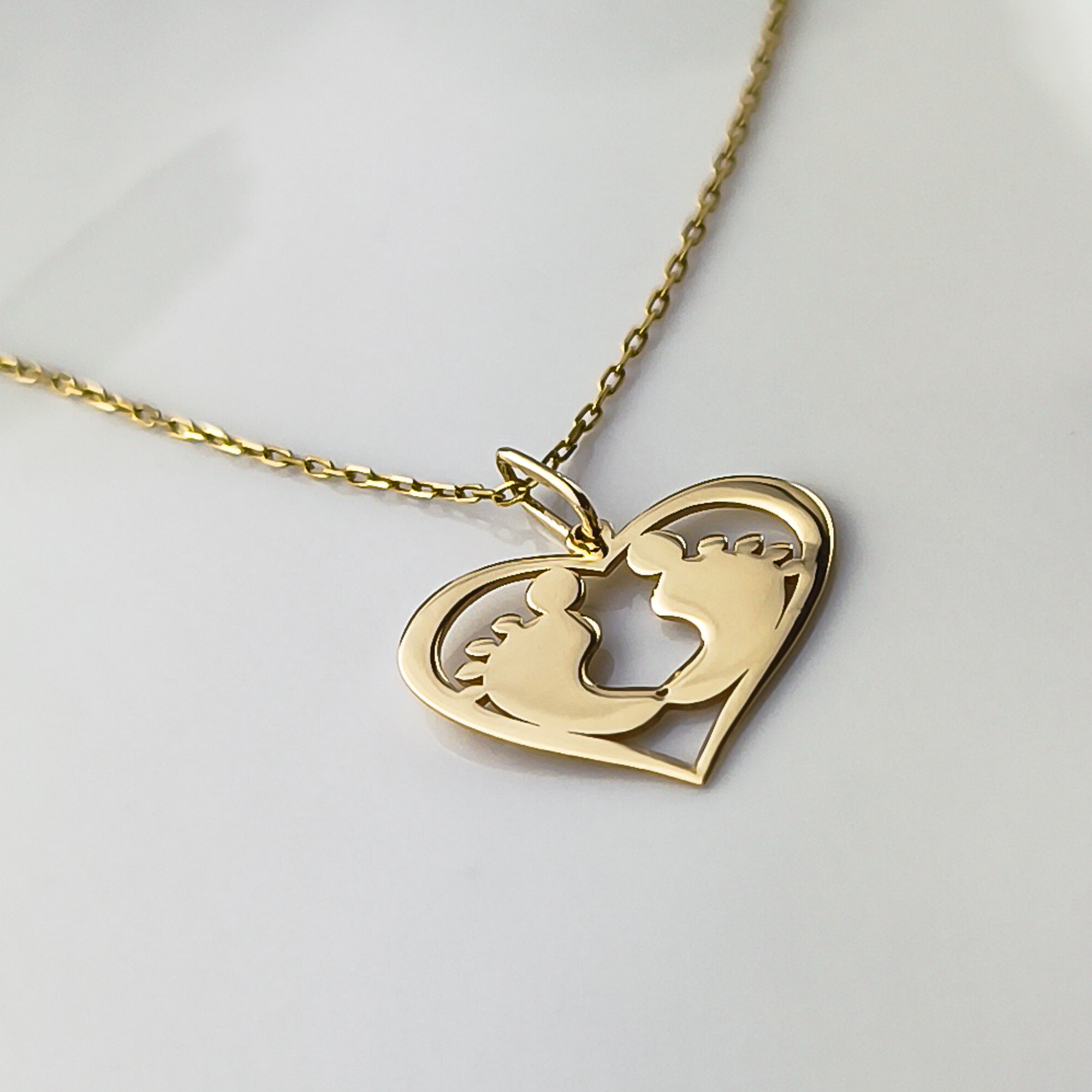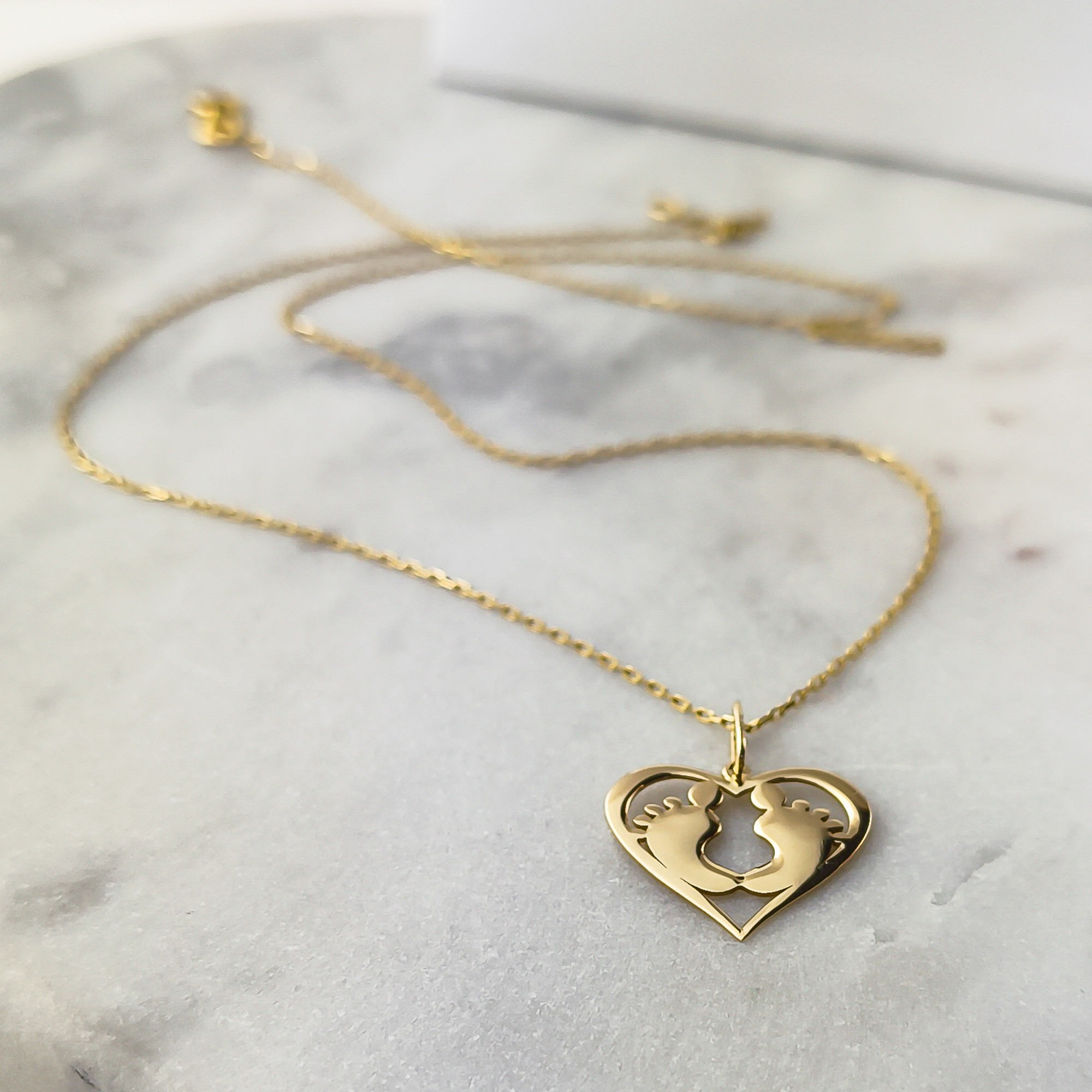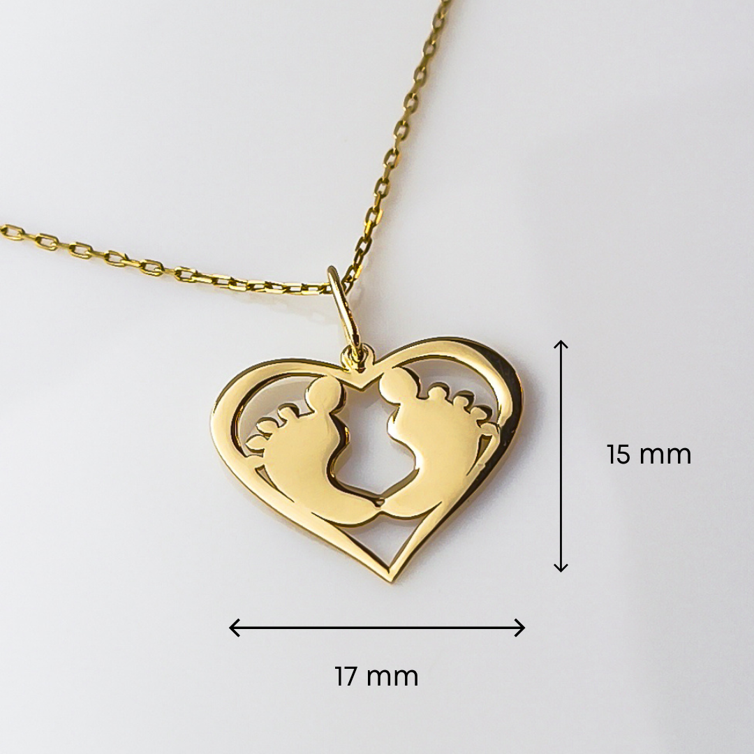 Złota zawieszka w kształcie serca z wyciętymi stópkami. Wykonana z wysokiej jakości złota, idealna na prezent dla mamy lub przyszłej mamy. Zawieszka, która pasuje do wszystkiego!