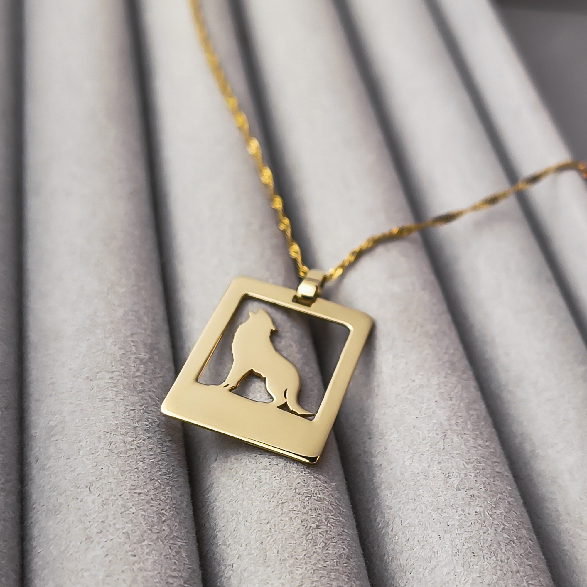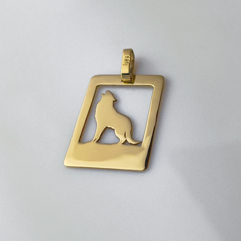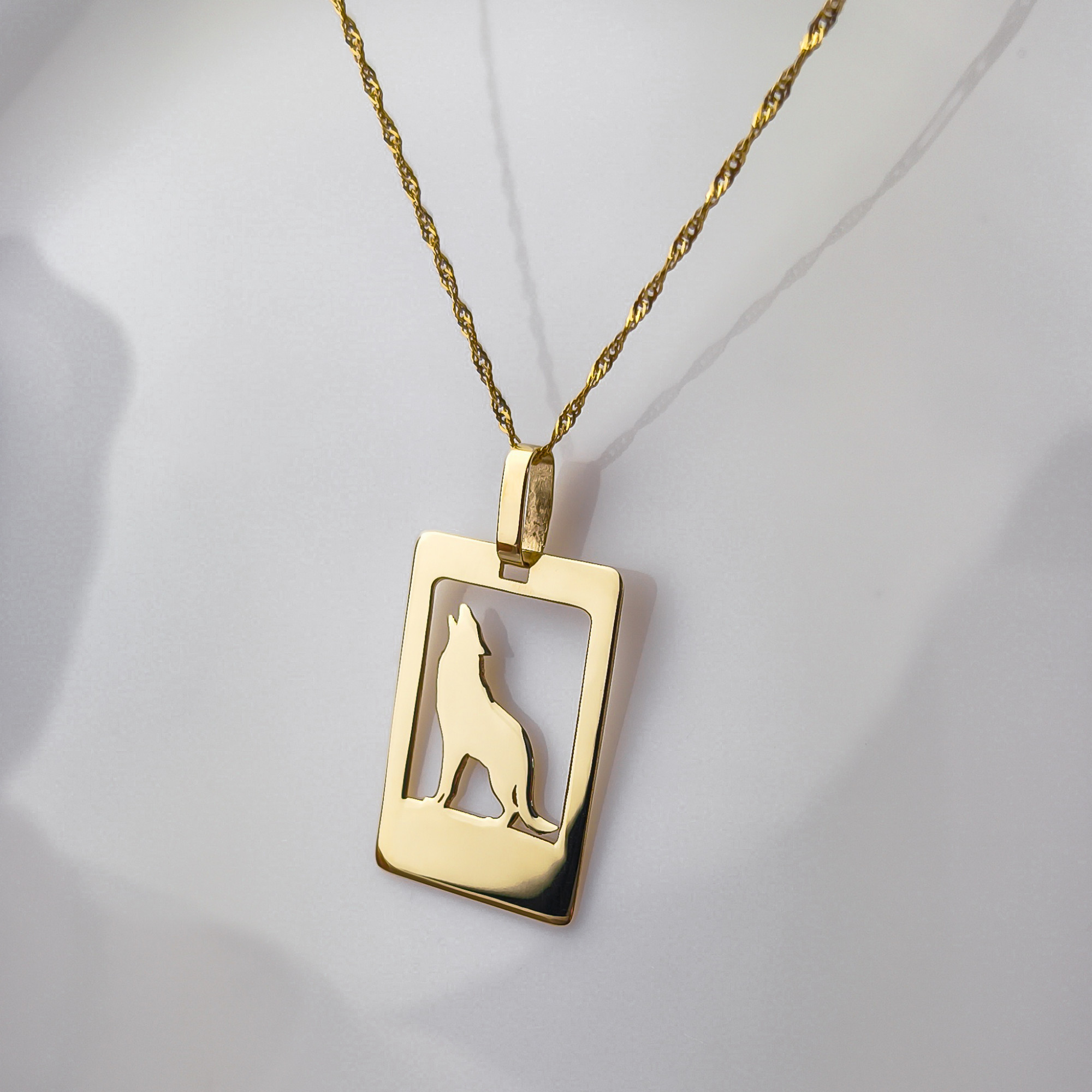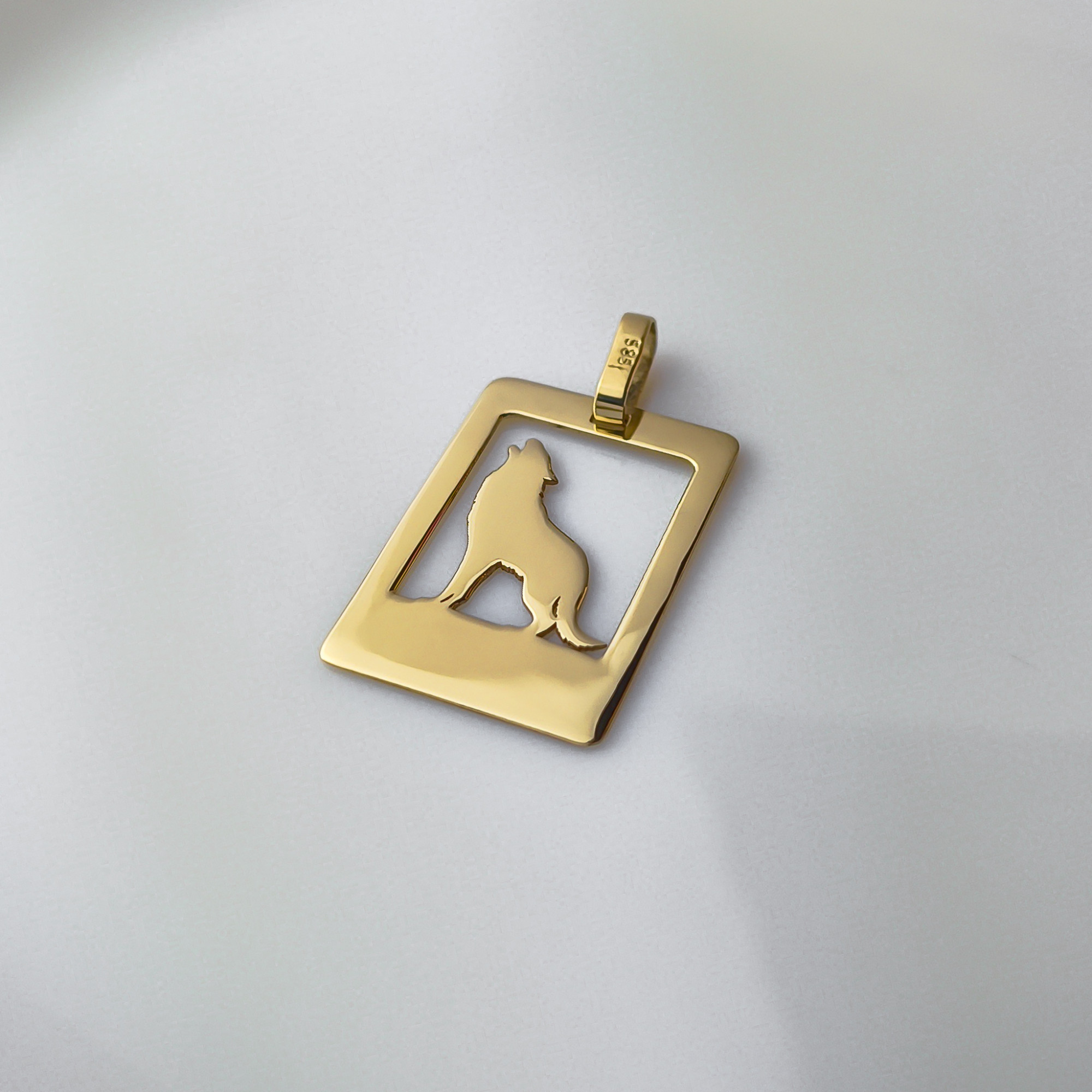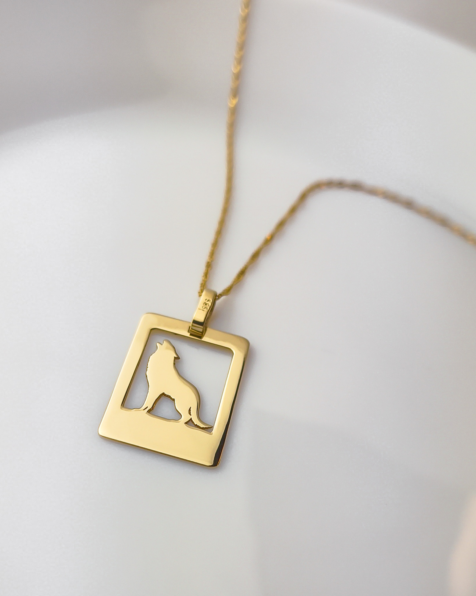 Elegancka zawieszka wykonana ze złota próby 585, przedstawiająca przedstawiająca sylwetkę wilka osadzoną w nowoczesnej, prostokątnej ramce. Precyzyjnie wycięty motyw nadaje biżuterii wyrazisty charakter, a jednocześnie zachowuje elegancką, minimalistyczną formę.