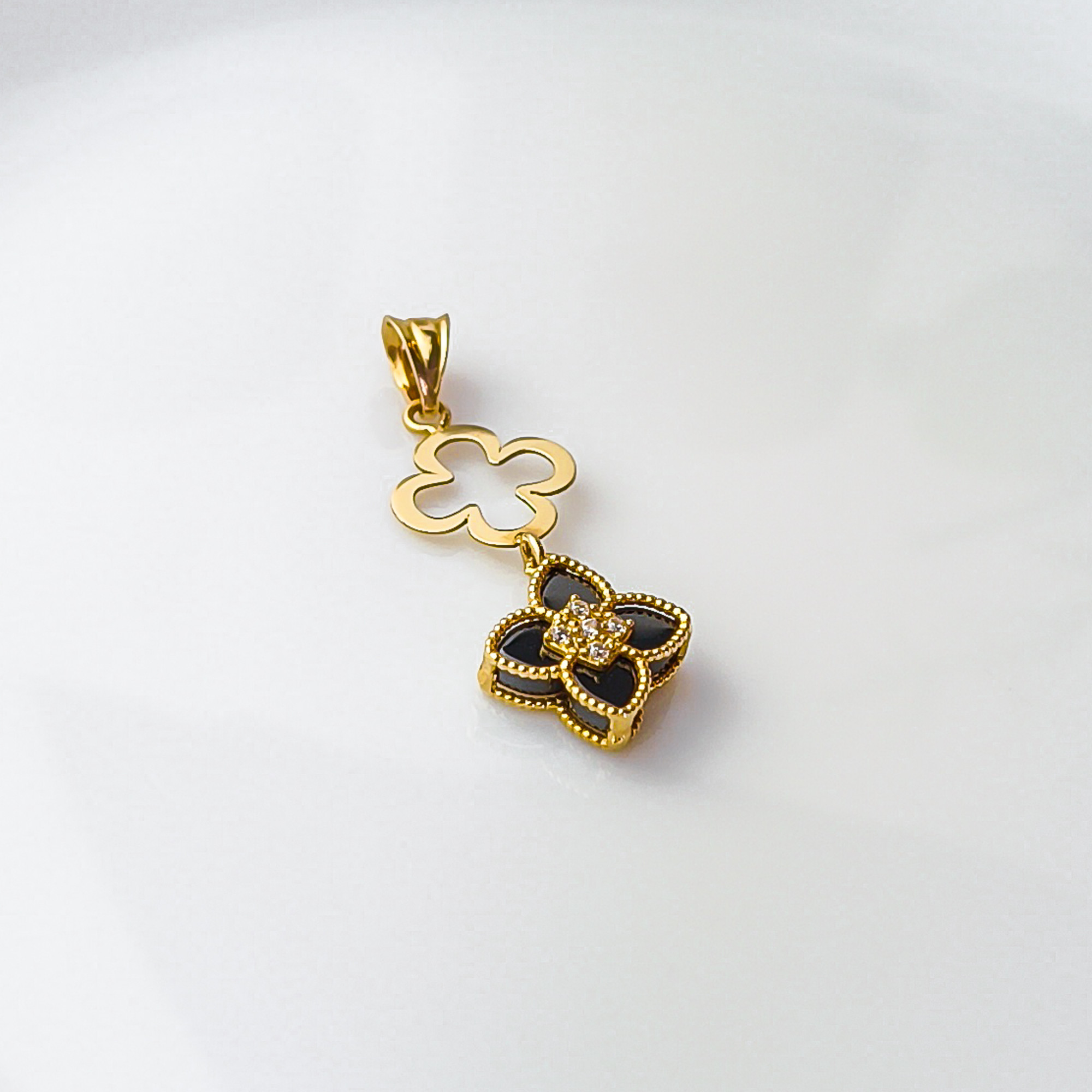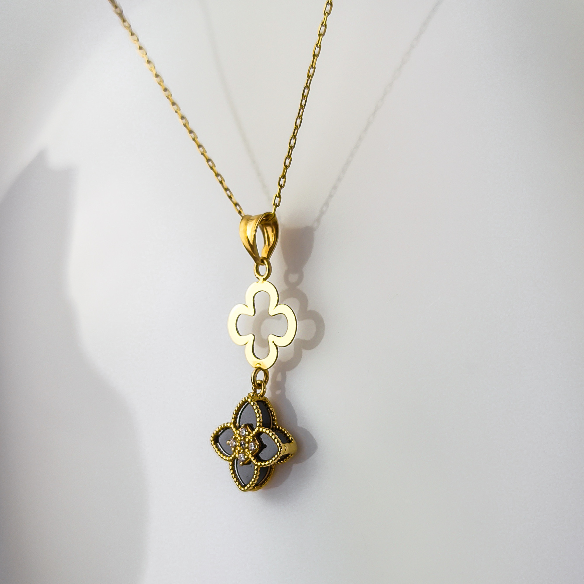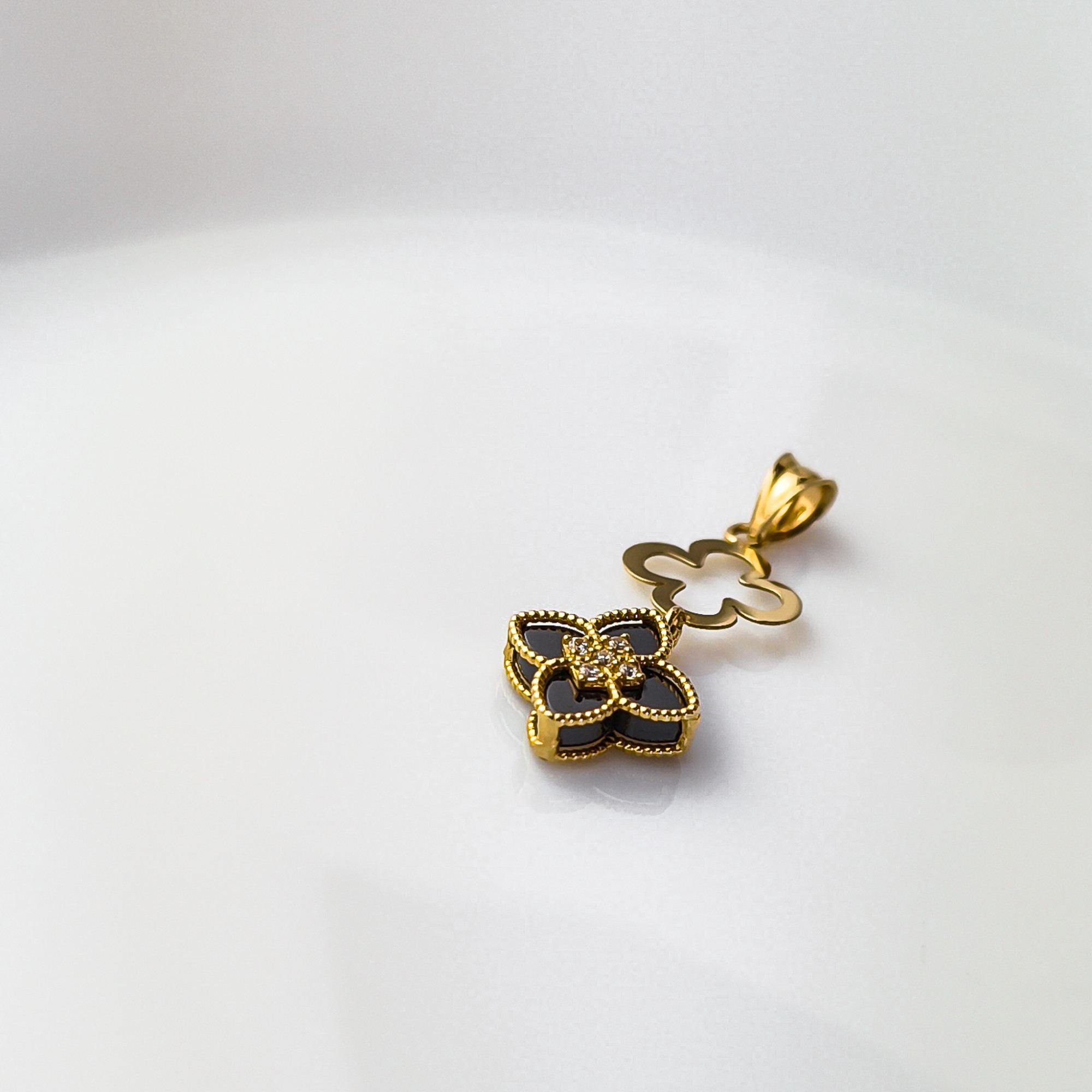 Motyw czterolistnego kwiatu (lub koniczyny) to odwieczny symbol szczęścia i harmonii. W połączeniu z czarnym kamieniem staje się on niezwykle eleganckim talizmanem, który pasuje zarówno do „małej czarnej”, jak i do stylowego garnituru czy jedwabnej bluzki.