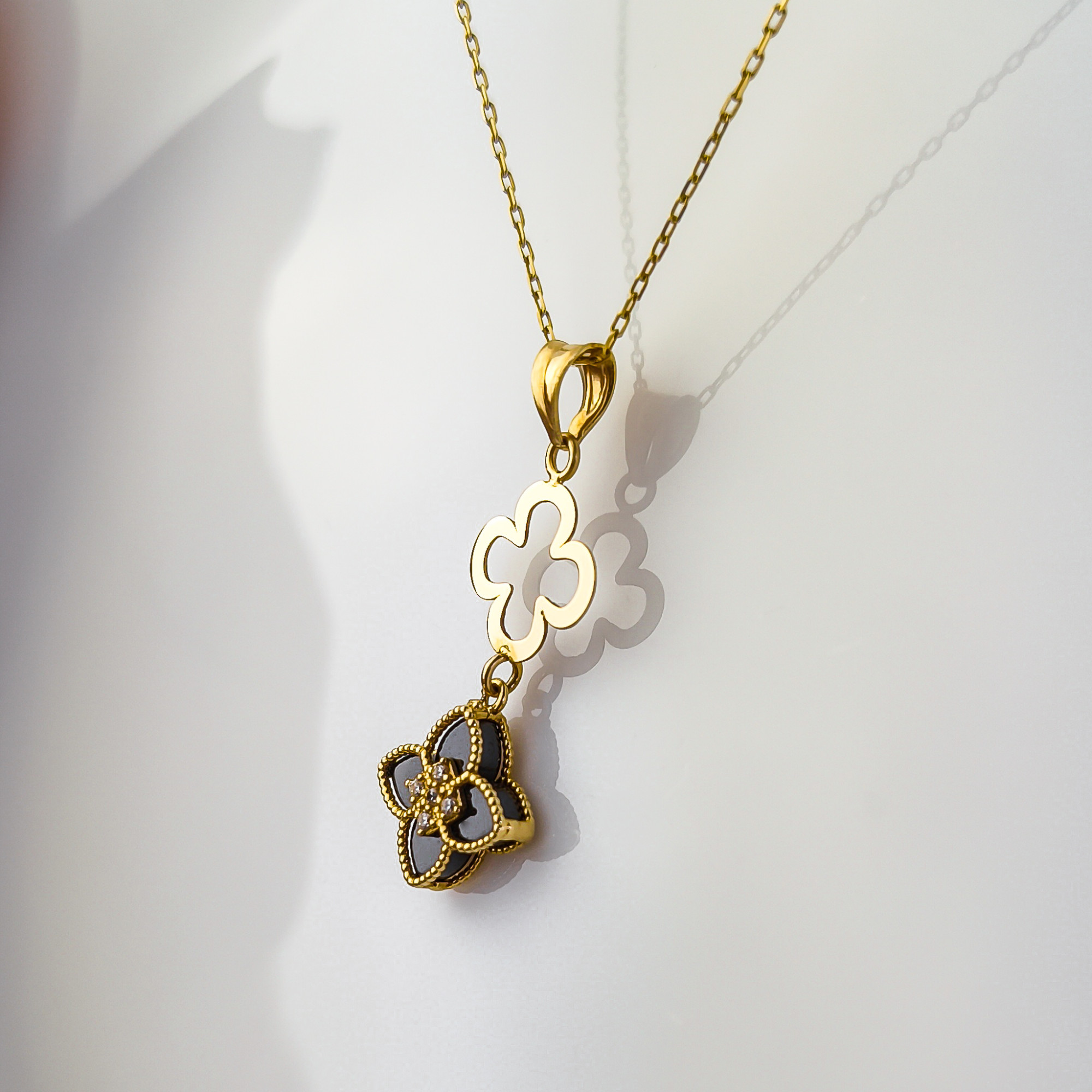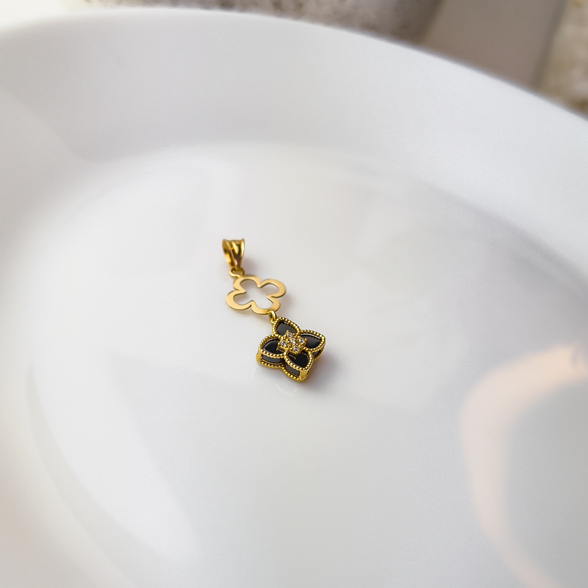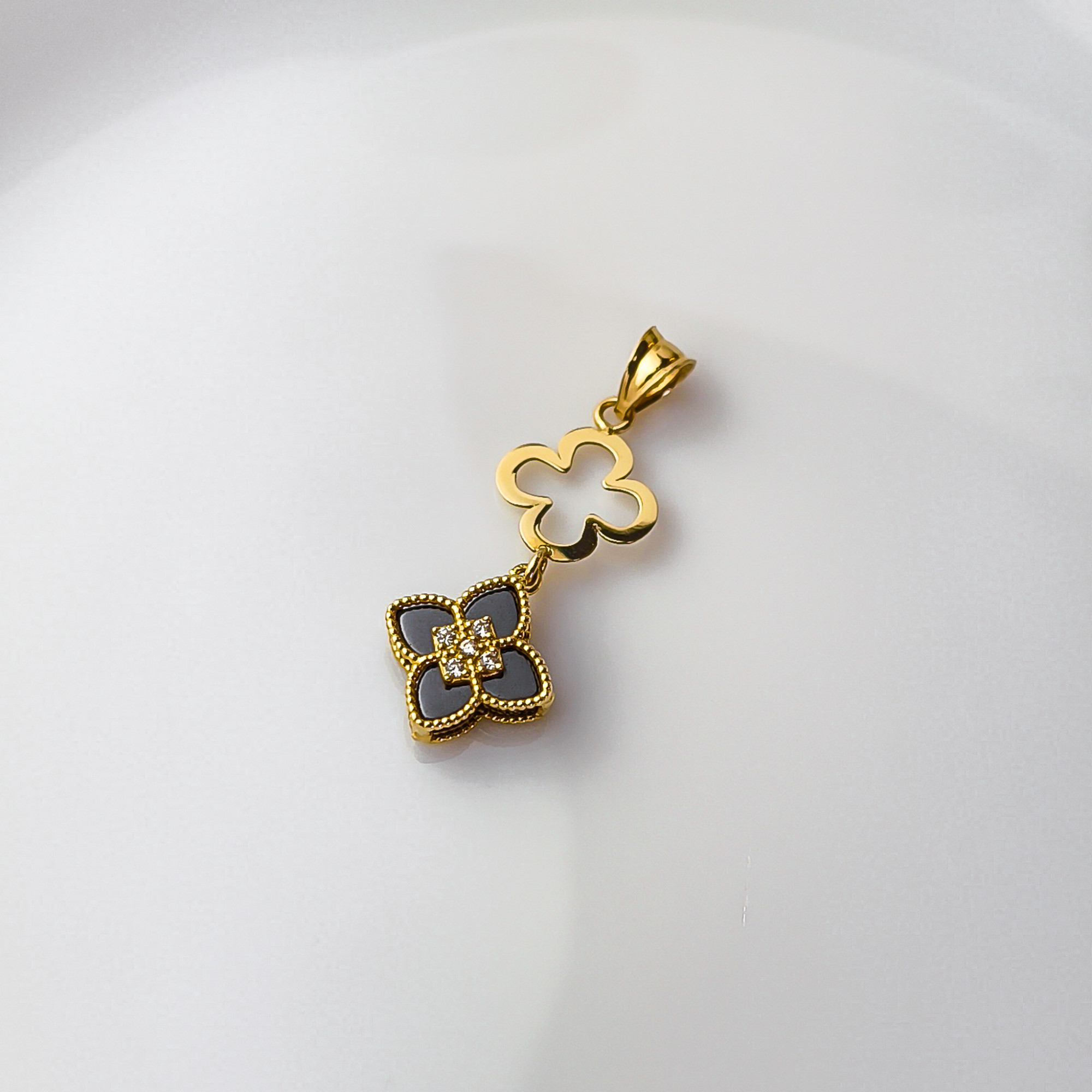 Motyw czterolistnego kwiatu (lub koniczyny) to odwieczny symbol szczęścia i harmonii. W połączeniu z czarnym kamieniem staje się on niezwykle eleganckim talizmanem, który pasuje zarówno do „małej czarnej”, jak i do stylowego garnituru czy jedwabnej bluzki.