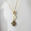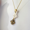 Zawieszka wykonana ze złota próby 585, składa się z dwóch elementów – subtelnego, ażurowego konturu u góry oraz pełnego, bogato zdobionego kwiatu na dole. To sprawia, że biżuteria pięknie „pracuje” przy każdym ruchu, przyciągając spojrzenia swoją dynamiką.