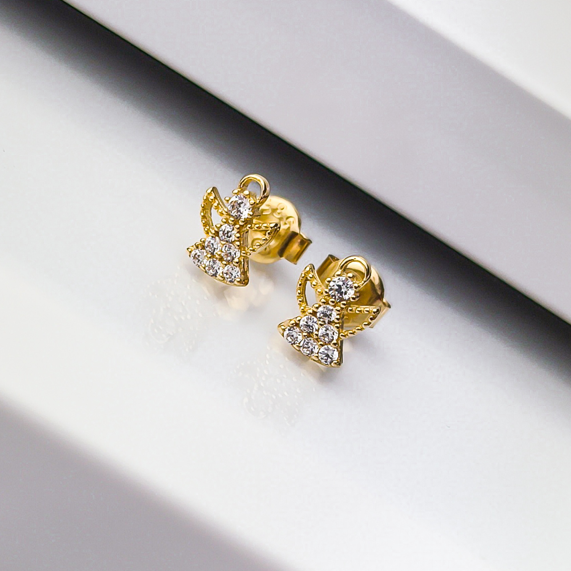 Subtelne złote kolczyki w kształcie Aniołka, w którym środku umieszczono cyrkonie. Kolczyki wykonane zostały ze złota próby 585. Ich delikatny wzór przypadł do gustu wielu wielbicielkom klasycznych kształtów, dodając je do stylizacji podkreślimy kobiecą urodę. Kolczyki zapakowane w ozdobne pudełeczko będą świetnym prezentem dla bliskiej osoby. Dodatkowo mamy możliwość wykonania graweru na blaszce i umieszczeniu jej w pudełku. Skorzystaj z naszych wzorów lub stwórz własny oryginalny tekst graweru - usługa GRATIS.