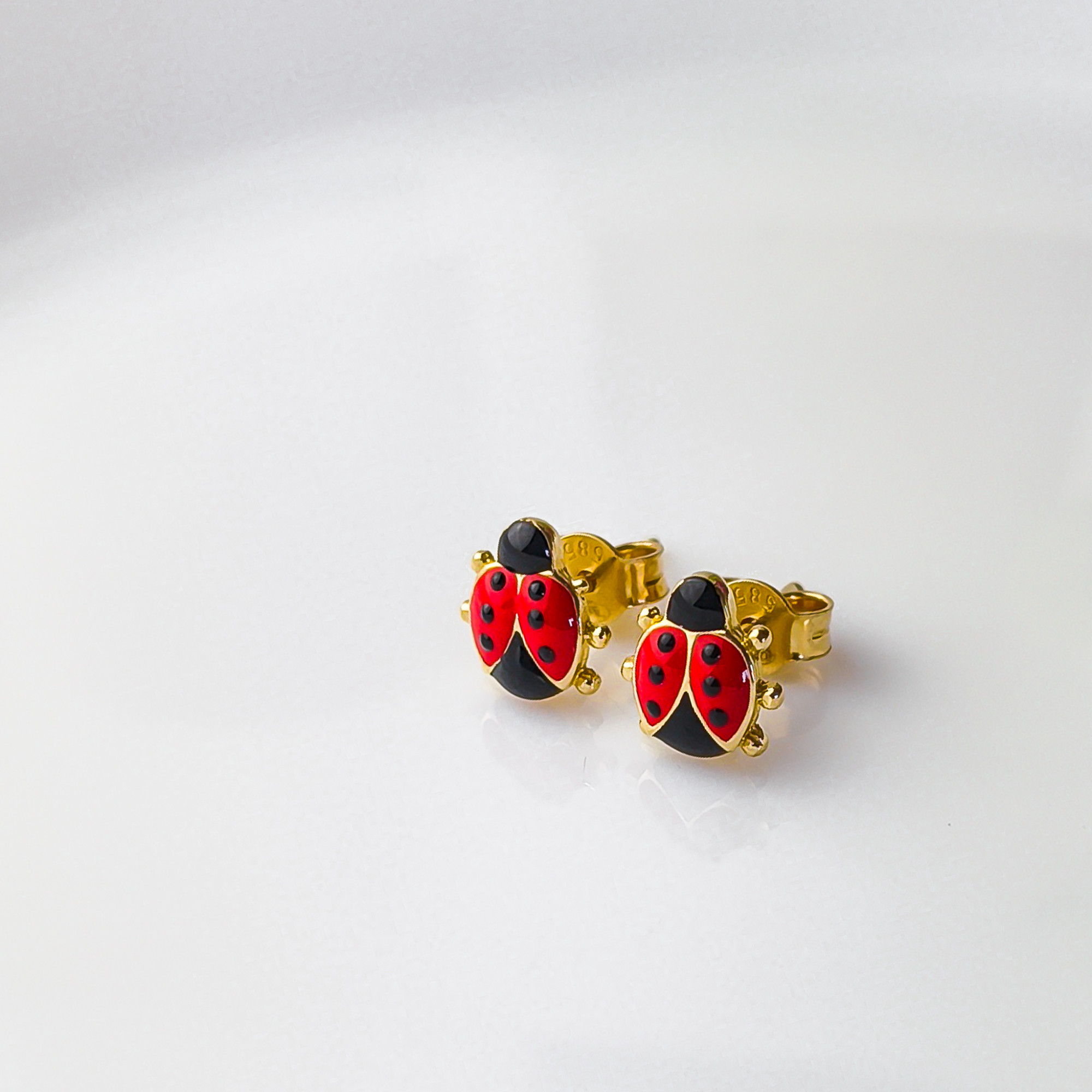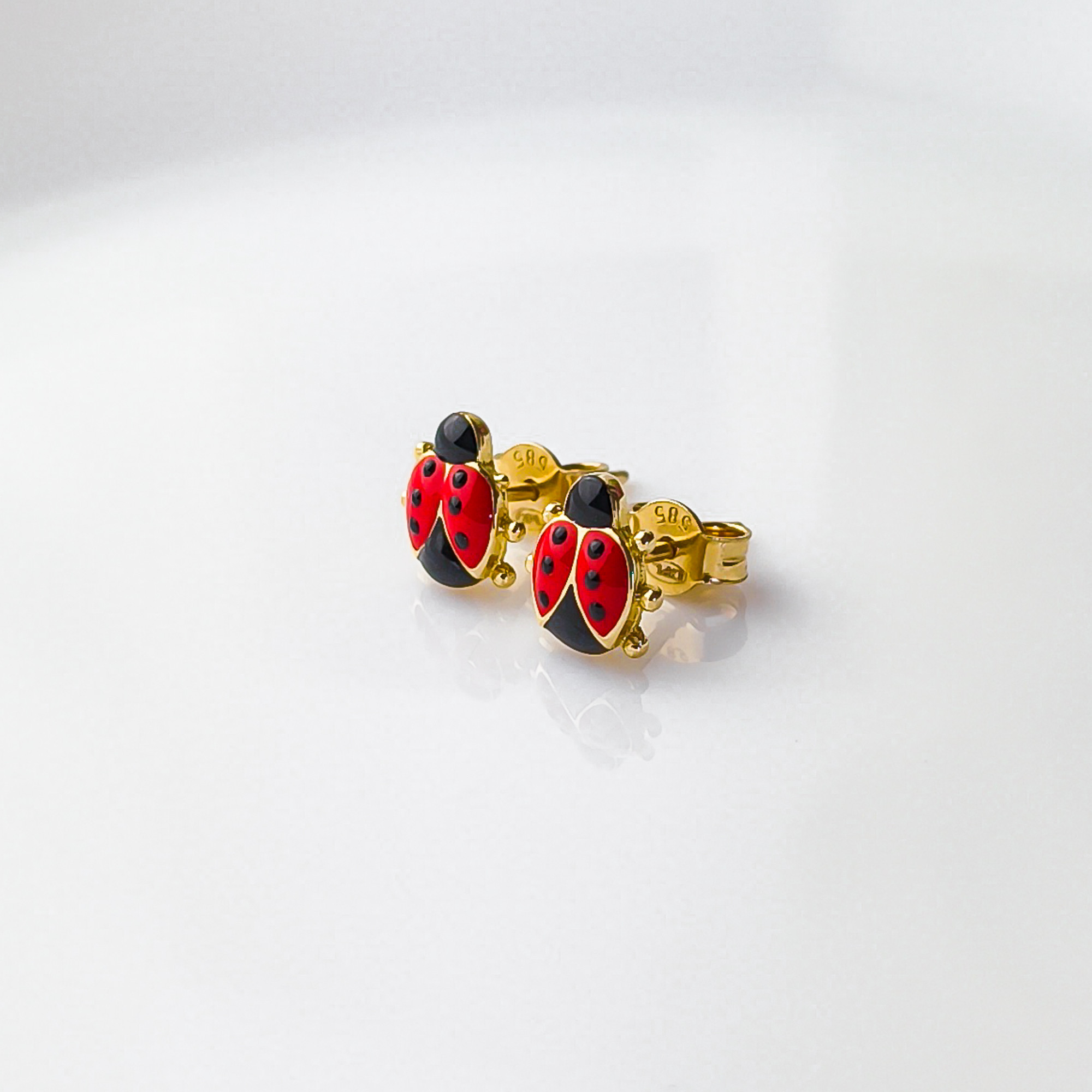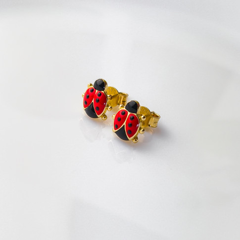 Urocze kolczyki wykonane z wysokiej jakości złota próby 585, ozdobione kolorowym motywem biedronki. Intensywna czerwień w połączeniu z czarnymi detalami nadaje biżuterii radosnego i przyciągającego wzrok charakteru, idealnego dla najmłodszych.