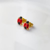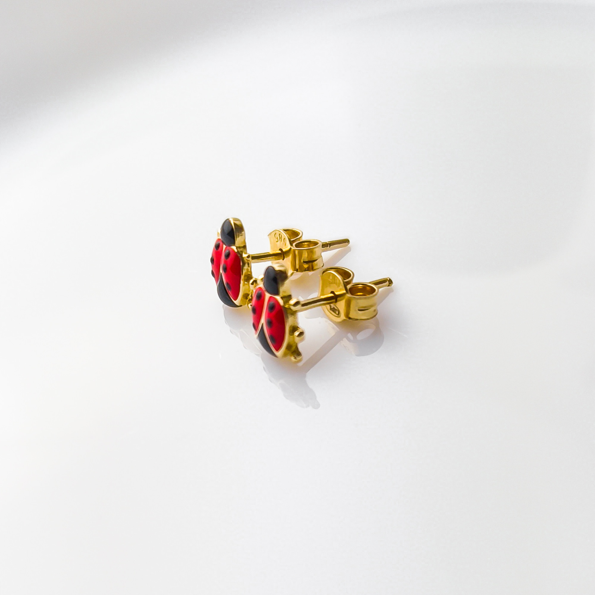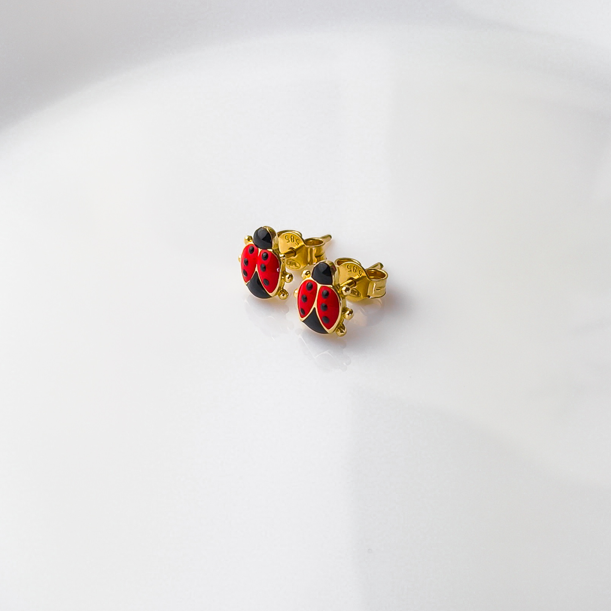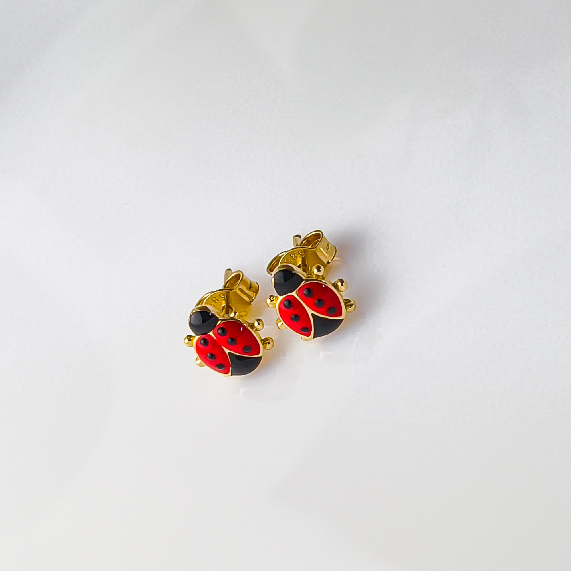 Urocze kolczyki wykonane z wysokiej jakości złota próby 585, ozdobione kolorowym motywem biedronki. Intensywna czerwień w połączeniu z czarnymi detalami nadaje biżuterii radosnego i przyciągającego wzrok charakteru, idealnego dla najmłodszych.
