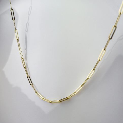 Splot ten charakteryzuje się wydłużonymi, prostokątnymi ogniwami, które nadają mu surowy, a jednocześnie niezwykle elegancki wygląd. To biżuteria, która „nie krzyczy”, ale zdecydowanie przyciąga wzrok swoją geometryczną formą. Dzięki otwartej strukturze ogniw, łańcuszek wydaje się bardzo delikatny i lekki na szyi, co sprawia, że jest idealny do noszenia przez cały dzień.