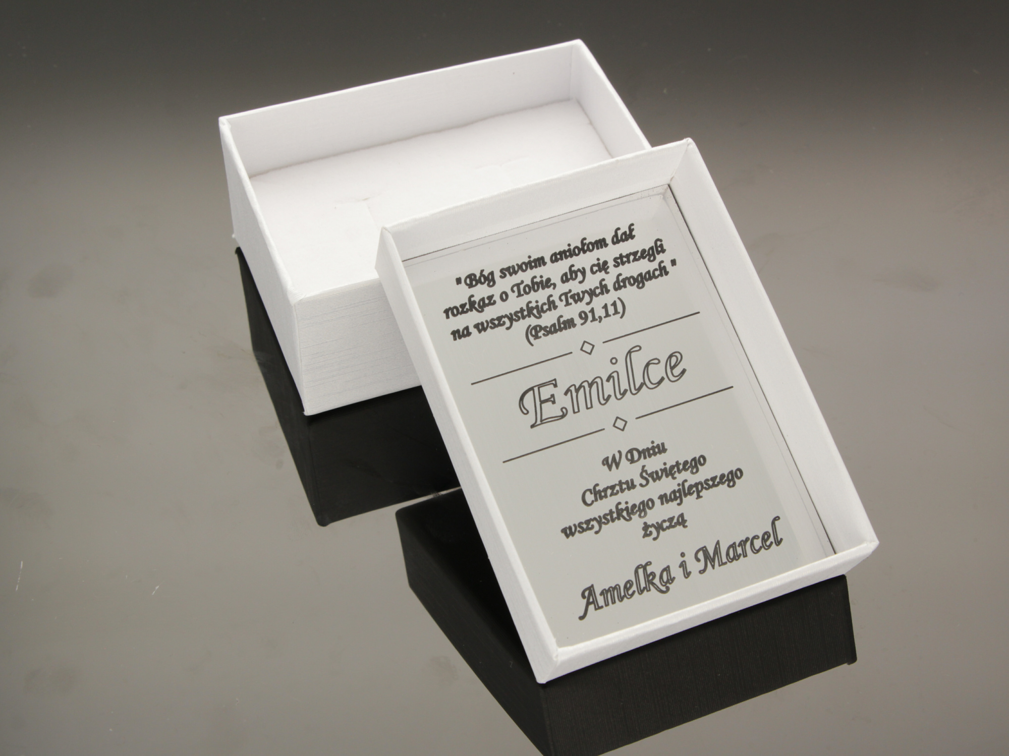 Dodatkowo mamy możliwość wykonania graweru na blaszce i umieszczeniu jej w pudełku. Skorzystaj z naszych wzorów lub stwórz własny oryginalny tekst graweru - usługa GRATIS.