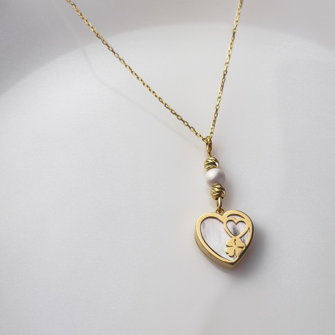 Złoty naszyjnik celebrytka w kształcie serca, które zostało wypełnione masą perłową. Zawieszka ozdobiona jest konturem koniczynki i serduszka. Celebrytka fantastycznie sprawdzająca się jako element ozdobny codziennych kreacji. Produkt dostępny w naszej ofercie wykonany jest ze złota próby 585 - co jest potwierdzeniem wysokiej jakości i trwałości. Zapakowana w ozdobne pudełeczko będzie wspaniałym prezentem. Dodatkowo mamy możliwość wykonania graweru na blaszce i umieszczeniu jej w pudełku. Skorzystaj z naszych wzorów lub stwórz własny oryginalny tekst graweru - usługa GRATIS.