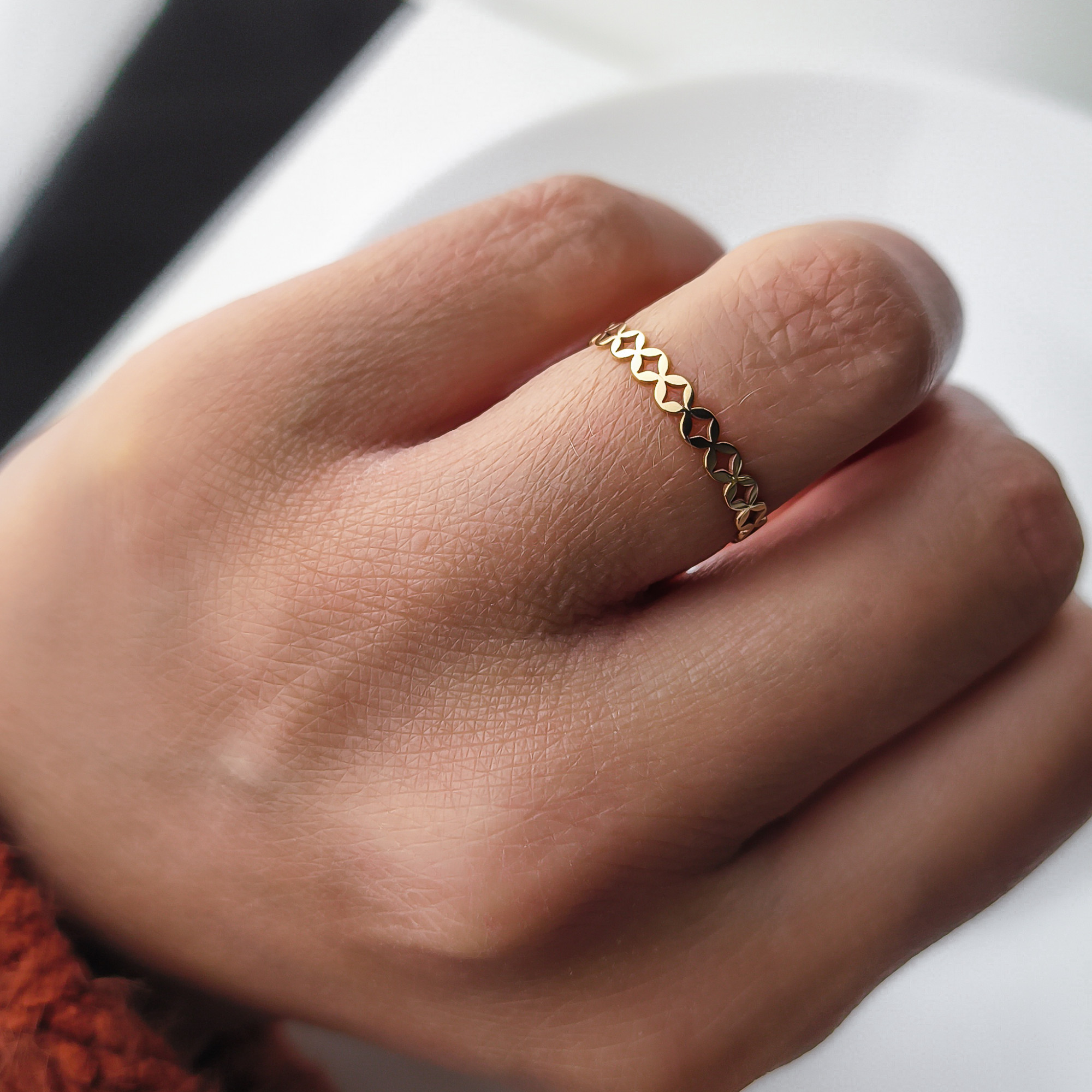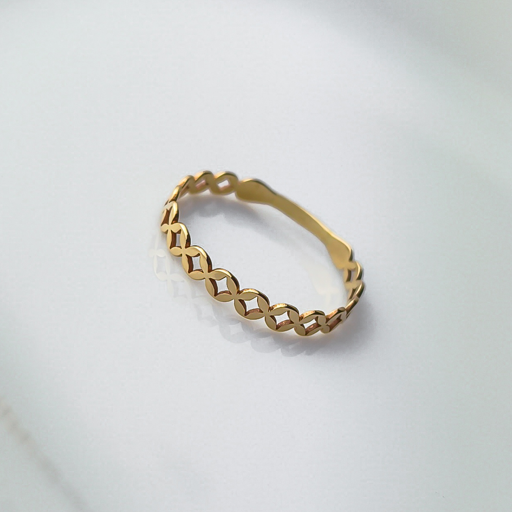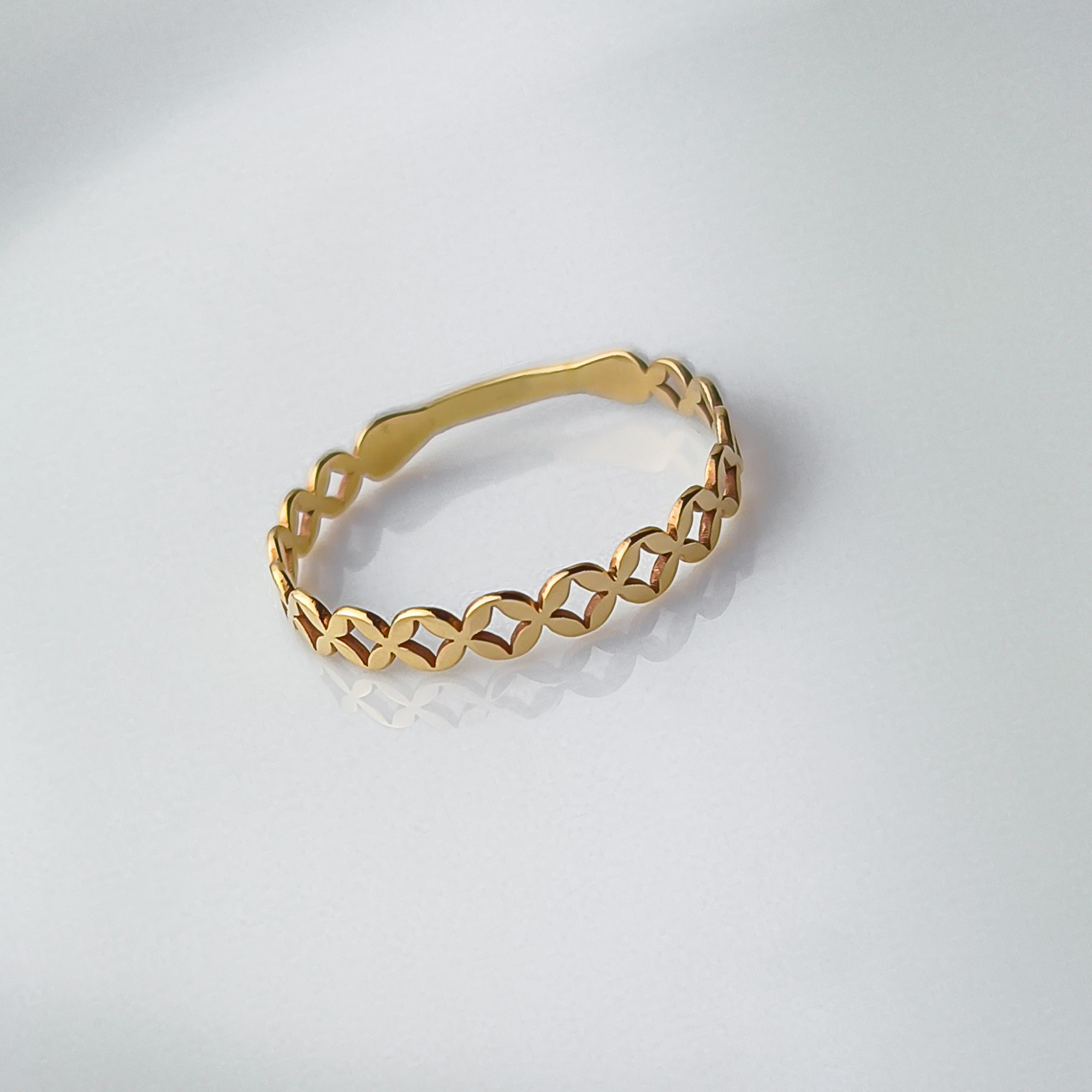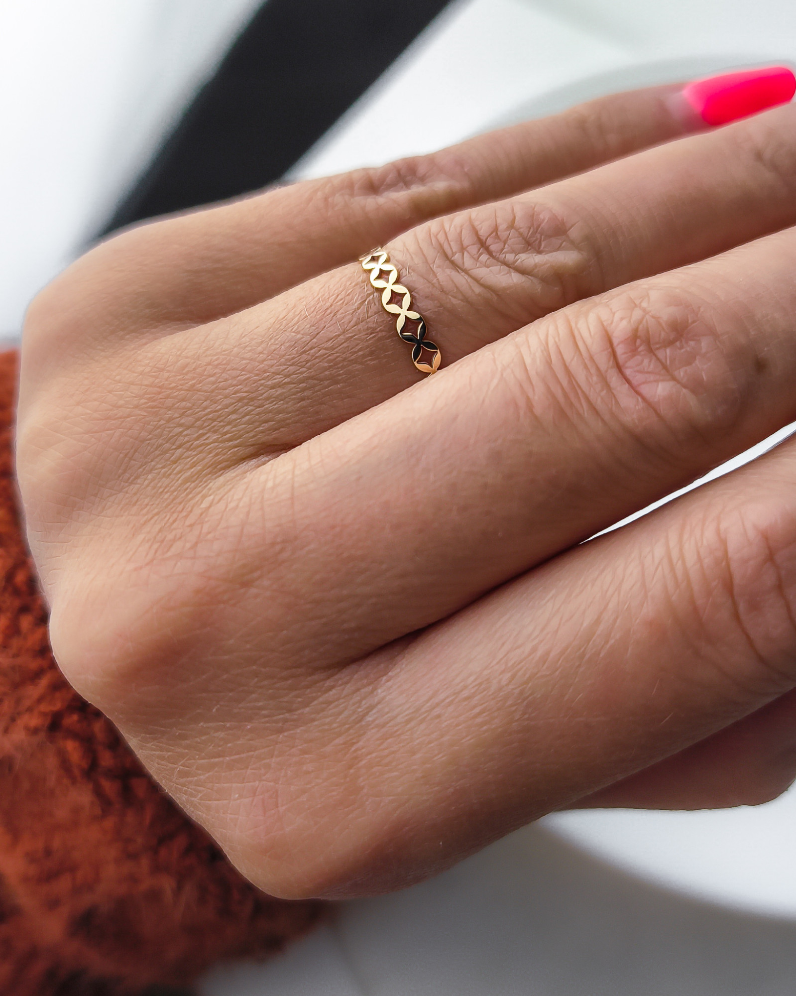Złoty pierścionek z motywem koniczynek marokańskich. Efektowny, subtelny wygląd oraz precyzja wykonania sprawiają, iż jest on idealny na prezent. Cudownie prezentuje się na kobiecej dłoni z innymi pierścionkami.