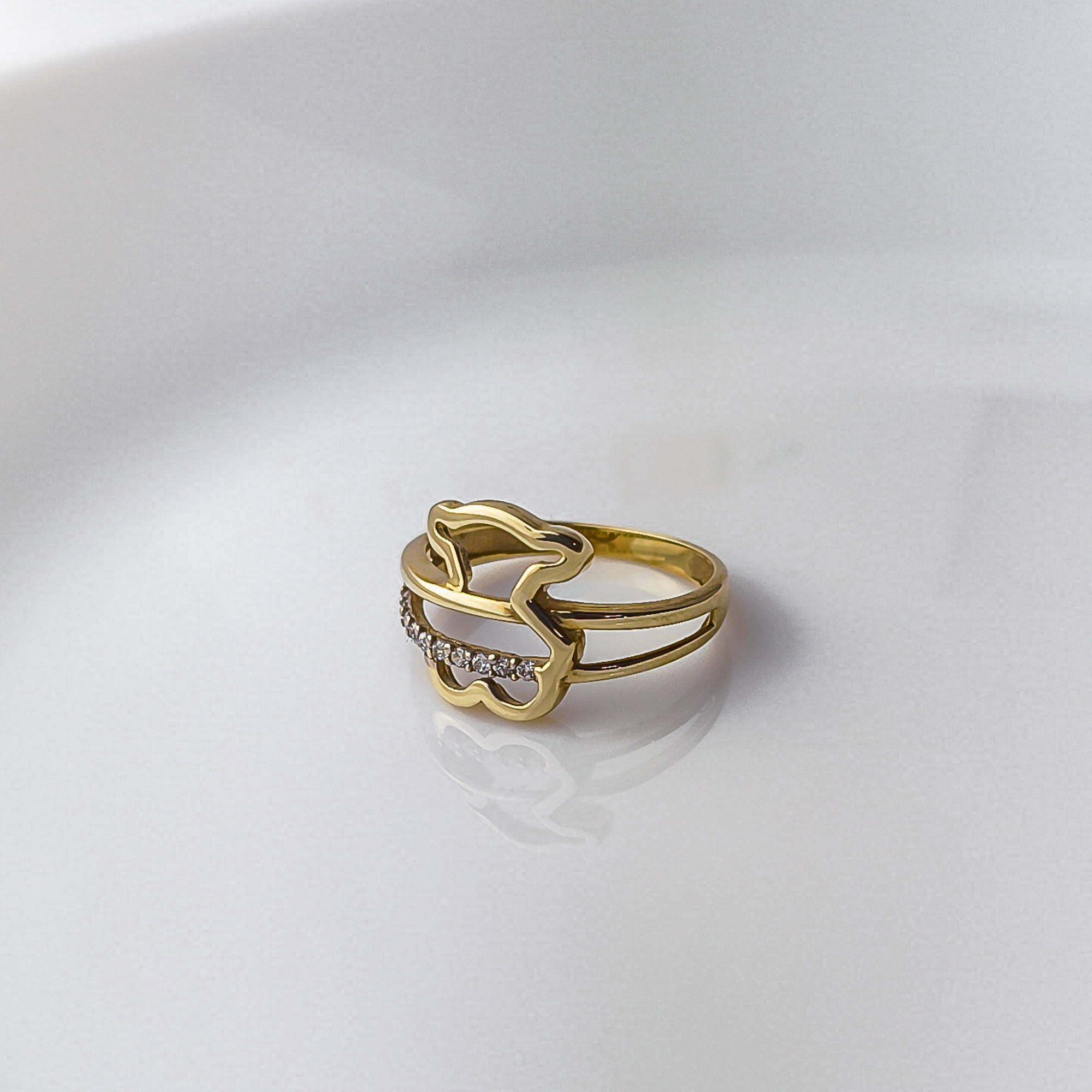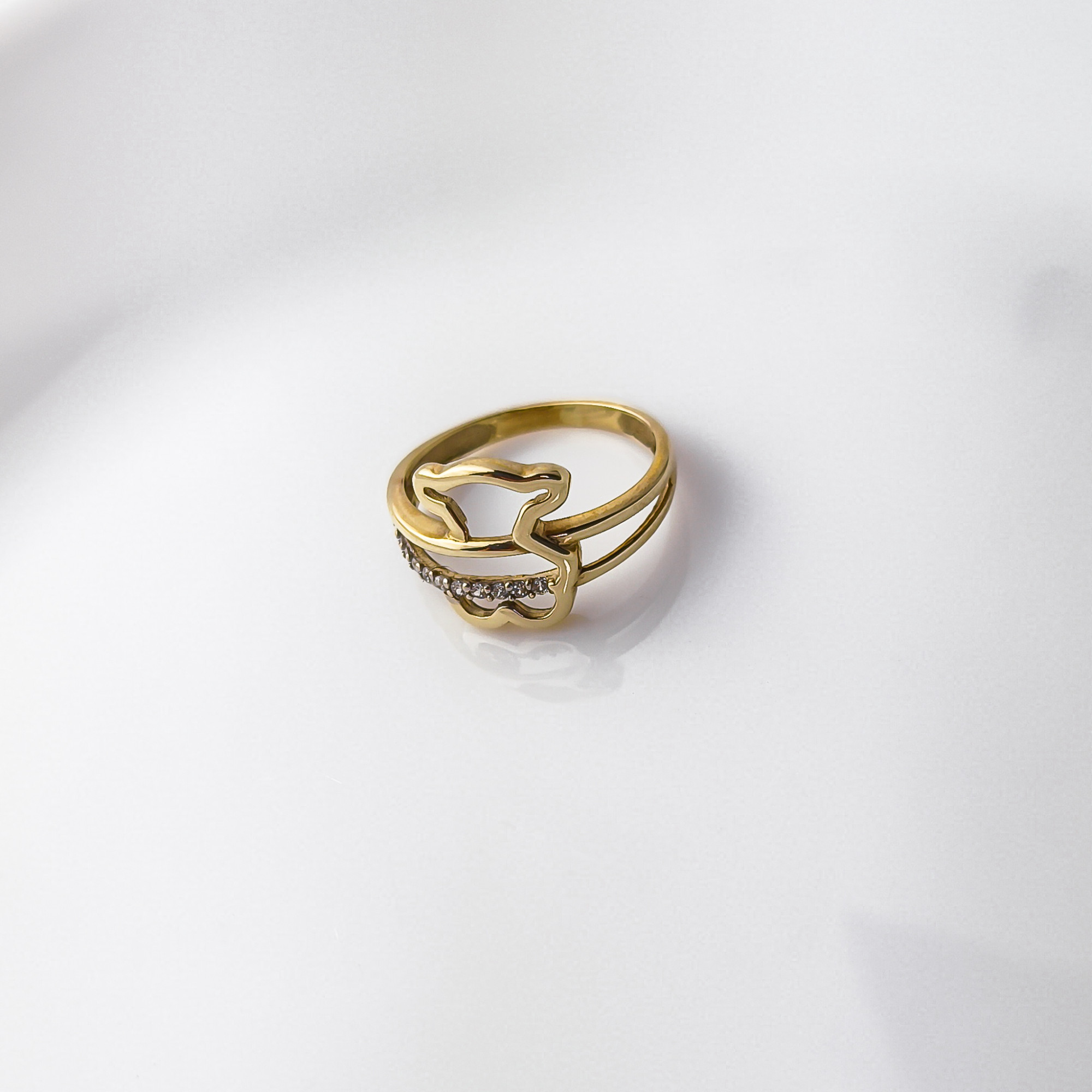 Pierścionek złoty z motywem misia i białymi cyrkoniami. Efektowny wygląd, subtelność i precyzja wykonania sprawiają, iż jest on idealny na prezent. Cudownie prezentuje się na kobiecej dłoni. Z pewnością doda blasku i wyjątkowego charakteru każdej damskiej stylizacji. Świetnie nada się do noszenia na co dzień jak i na wieczorne wyjścia. Biżuteria dostępna w naszej ofercie wykonana jest ze złota próby 333. Zapakowana w ozdobne pudełeczko będzie wspaniałym prezentem. Dodatkowo mamy możliwość wykonania graweru na blaszce i umieszczeniu jej w pudełku. Skorzystaj z naszych wzorów lub stwórz własny oryginalny tekst graweru - usługa GRATIS.