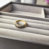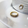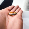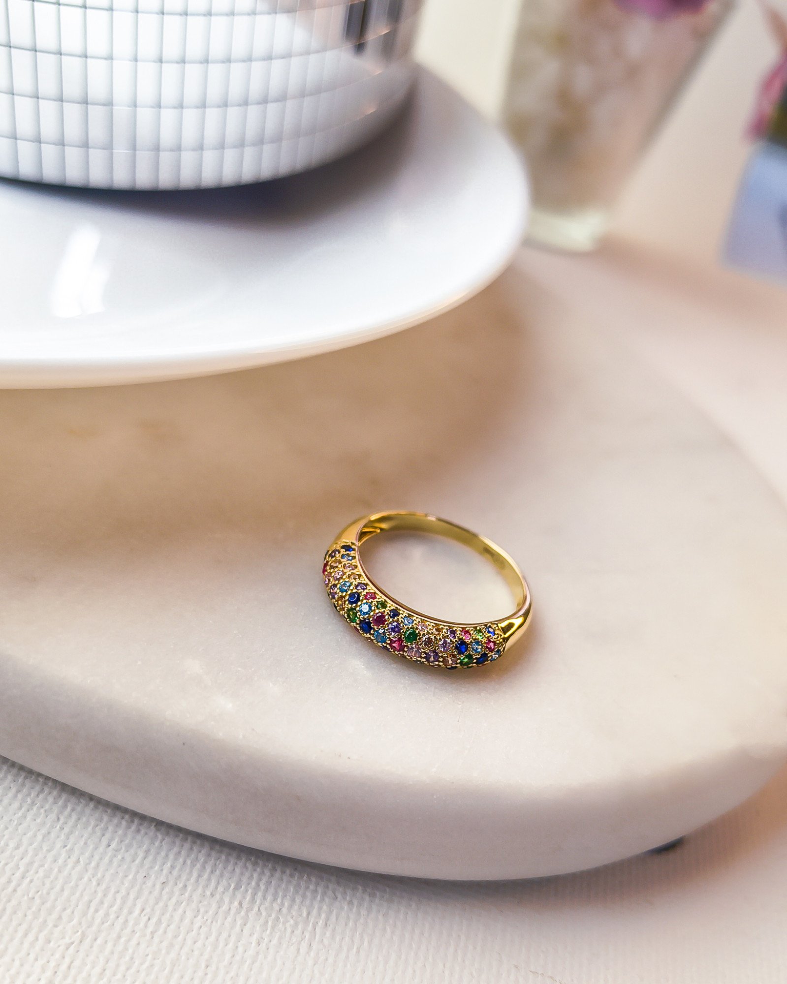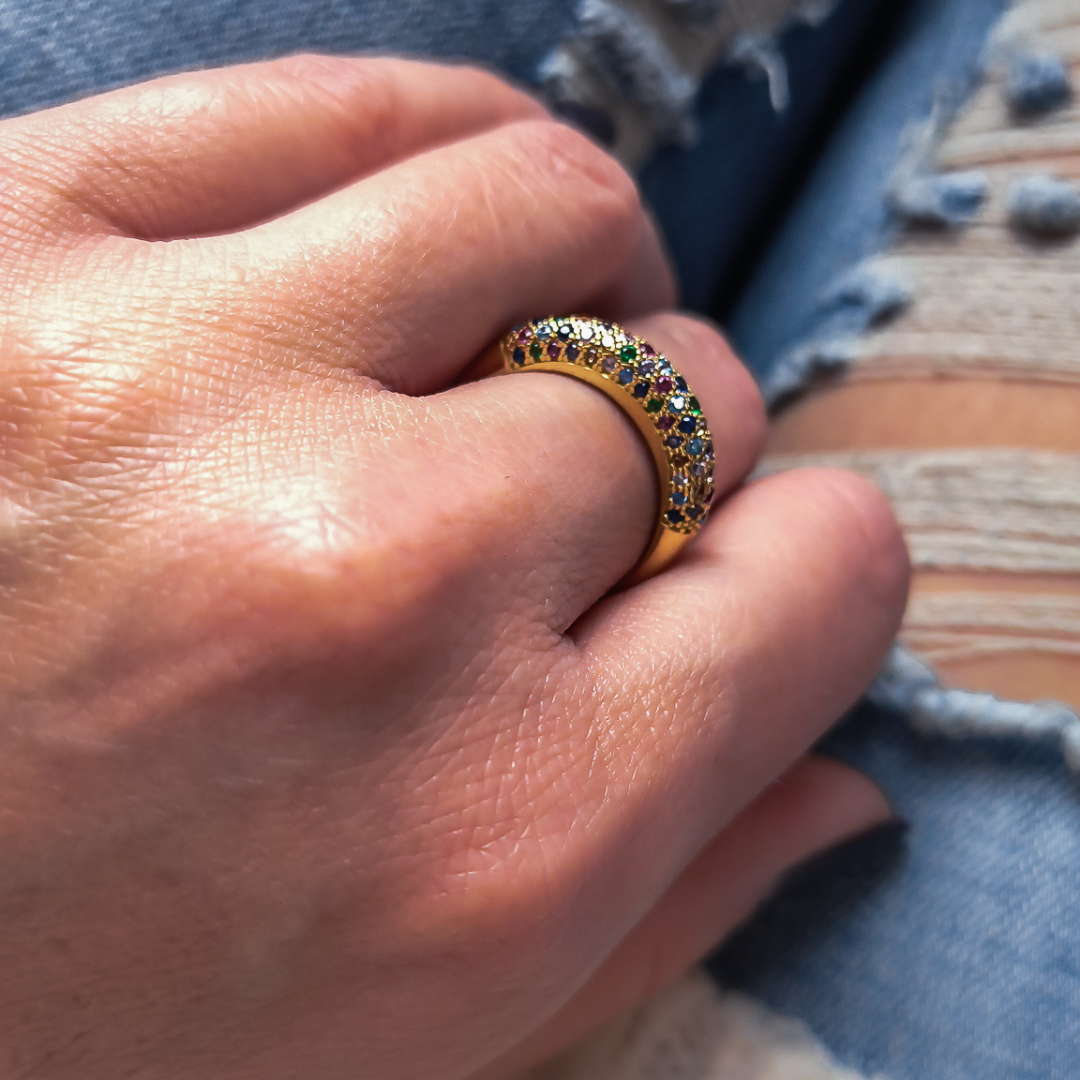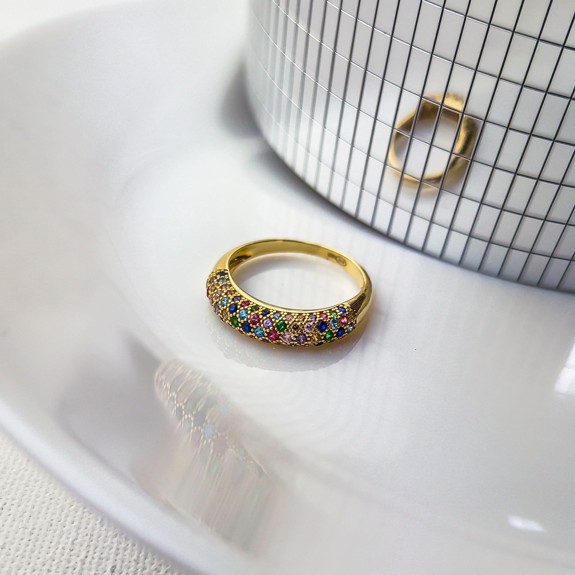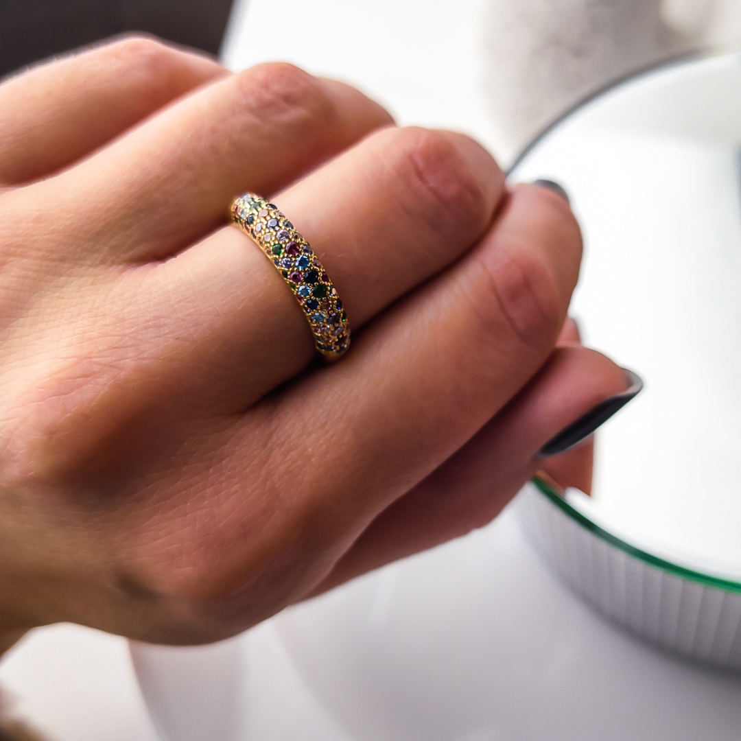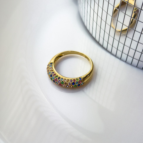 Pierścionek wykonany z lśniącego złota próby 585. Front pierścionka został gęsto wysadzany starannie wyselekcjonowanymi, kolorowymi cyrkoniami. Odcienie szafiru, szmaragdu, rubinu i cytrynu przeplatają się, tworząc lśniącą taflę, która mieni się wszystkimi barwami tęczy.