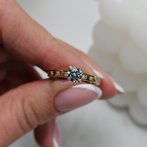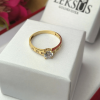 Olśniewający złoty pierścionek zaręczynowy ozdobiony przepięknym dużym oczkiem w postaci połyskującej cyrkonii oraz z umieszczonymi po obu bokach mniejszymi cyrkoniami. Pierścionek wykonany został z materiału wysokiej jakości - pr. 585, dzięki czemu mamy pewność bardzo dobrej jakości wyrobu. Na kobiecej dłoni prezentuje się przeuroczo i każdego dnia zachwyca na nowo. Zapakowany w ozdobne pudełko będzie wspaniałą niespodzianką na wyjątkową okazje dla ukochanej kobiety. Dodatkowo mamy możliwość wykonania graweru na blaszce i umieszczeniu jej w pudełku. Skorzystaj z naszych wzorów lub stwórz własny oryginalny tekst graweru - usługa GRATIS.